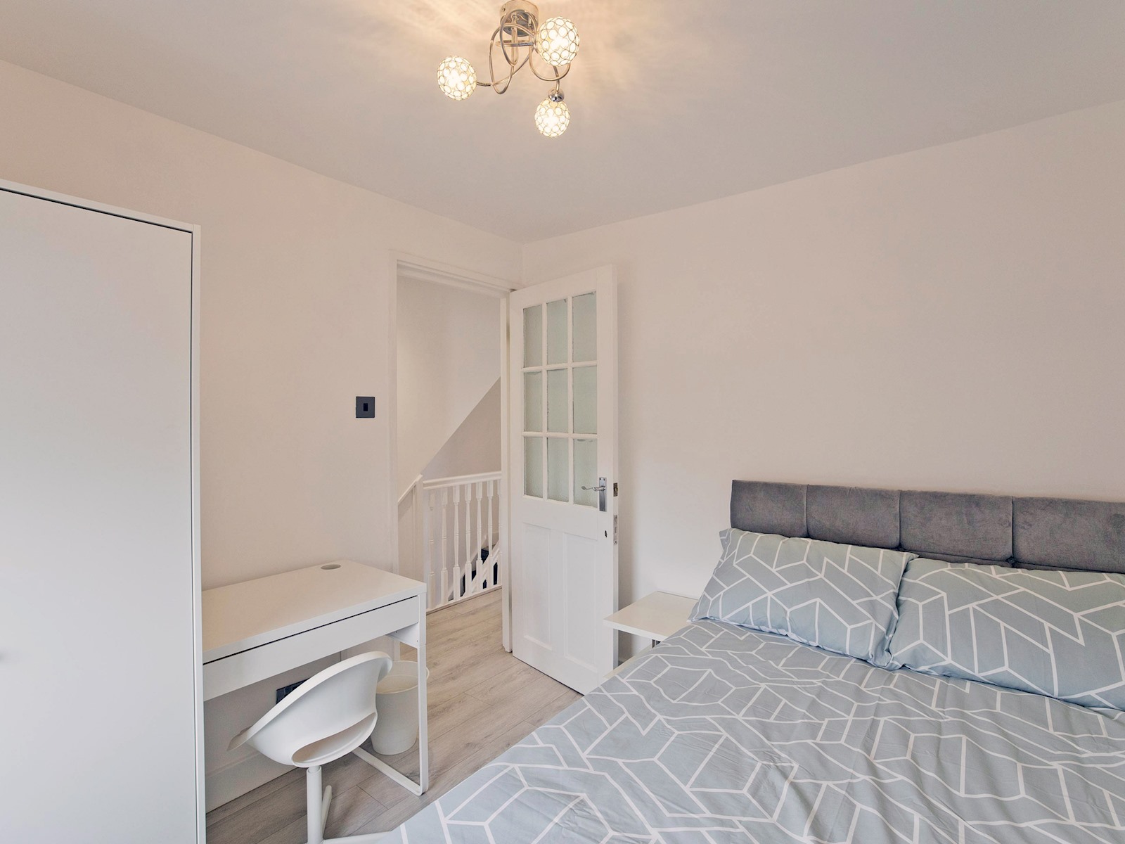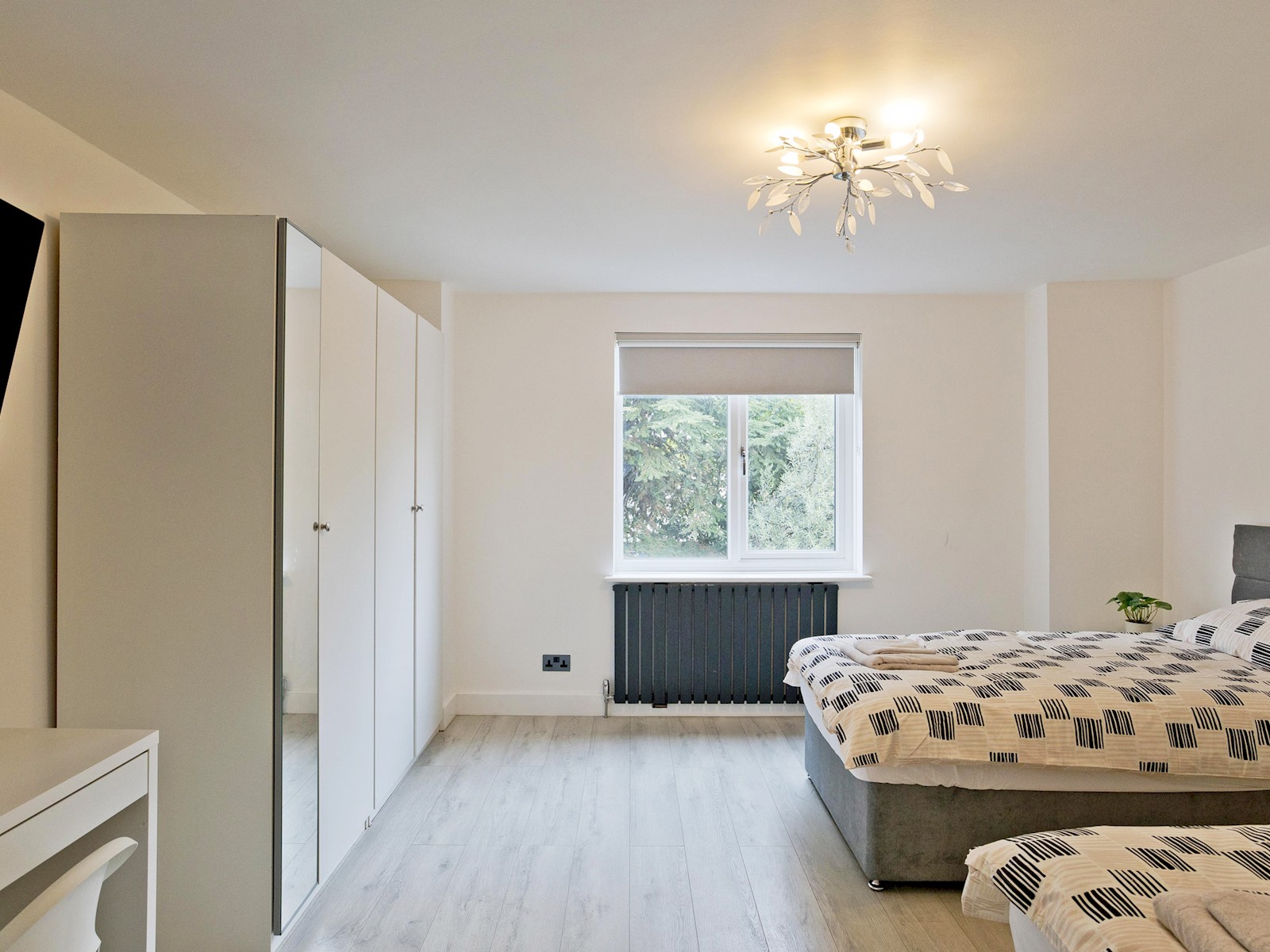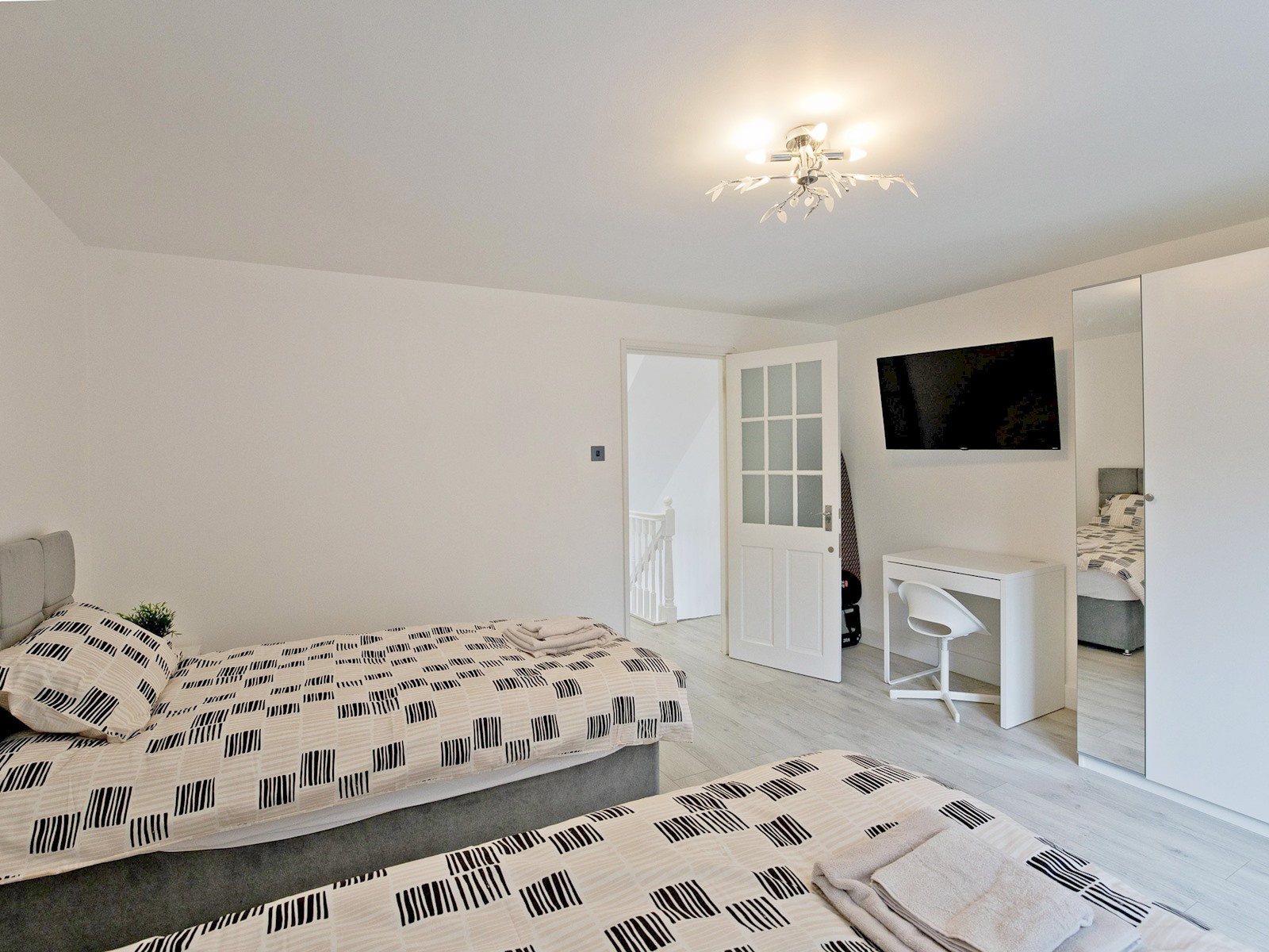 On the first floor, you’ll find a twin bedroom with two single beds, a wardrobe, desk, and wall-mounted TV ideal for friends or children. Another double bedroom offers a calm, minimalist retreat with a comfortable bed and soft lighting.