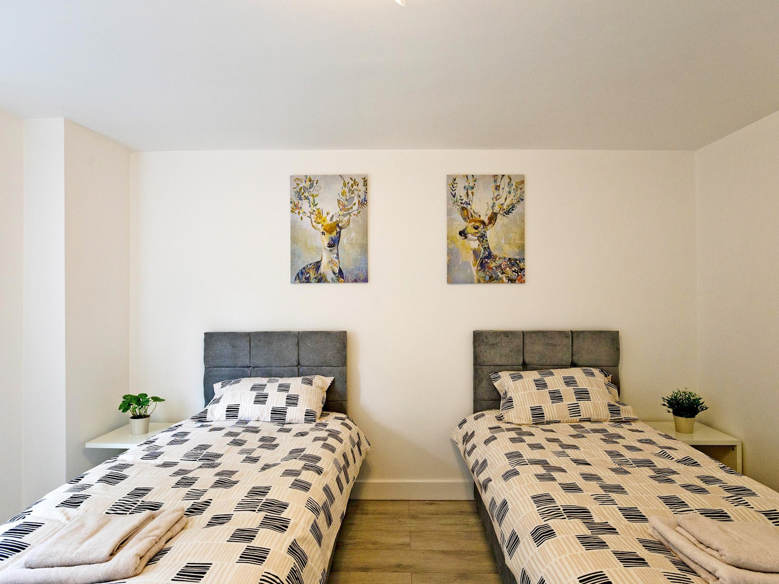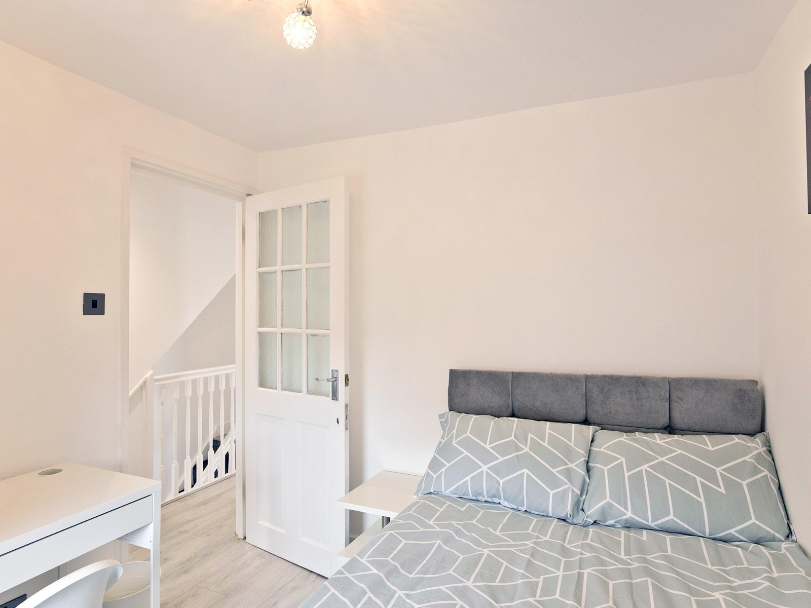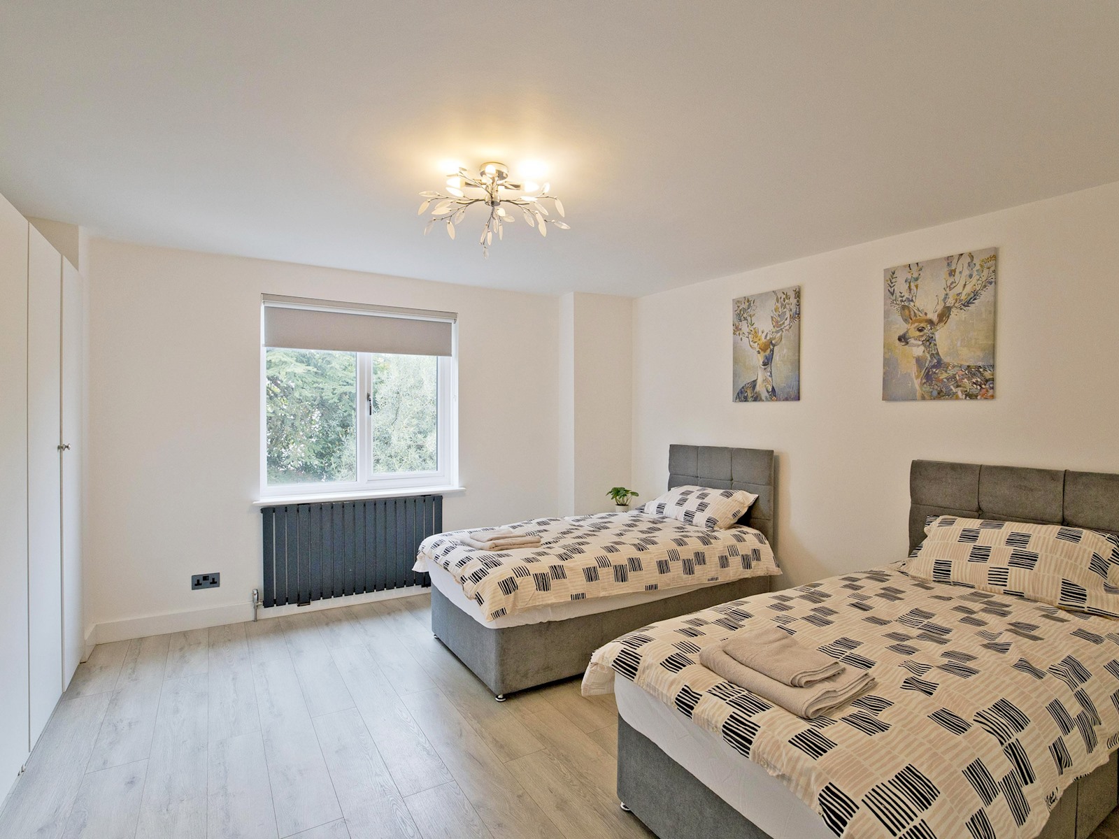 On the first floor, you’ll find a twin bedroom with two single beds, a wardrobe, desk, and wall-mounted TV ideal for friends or children. Another double bedroom offers a calm, minimalist retreat with a comfortable bed and soft lighting.