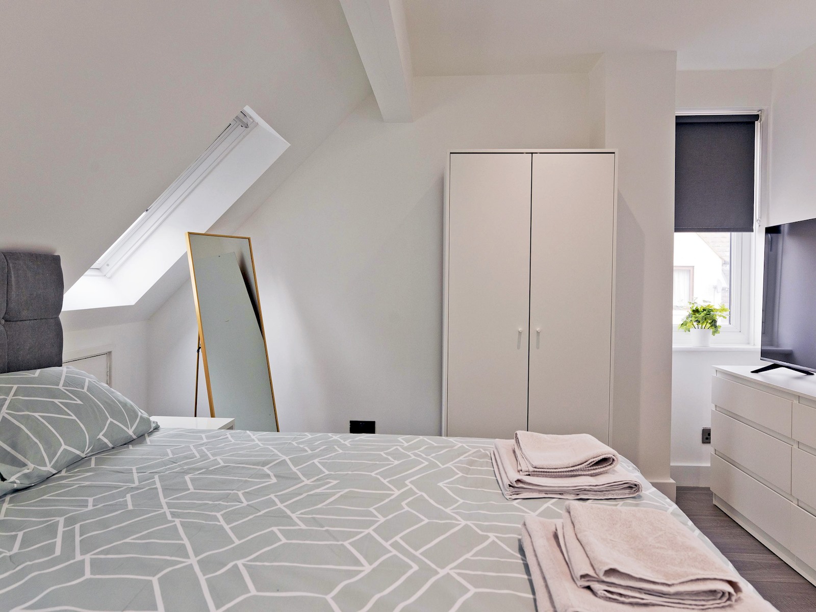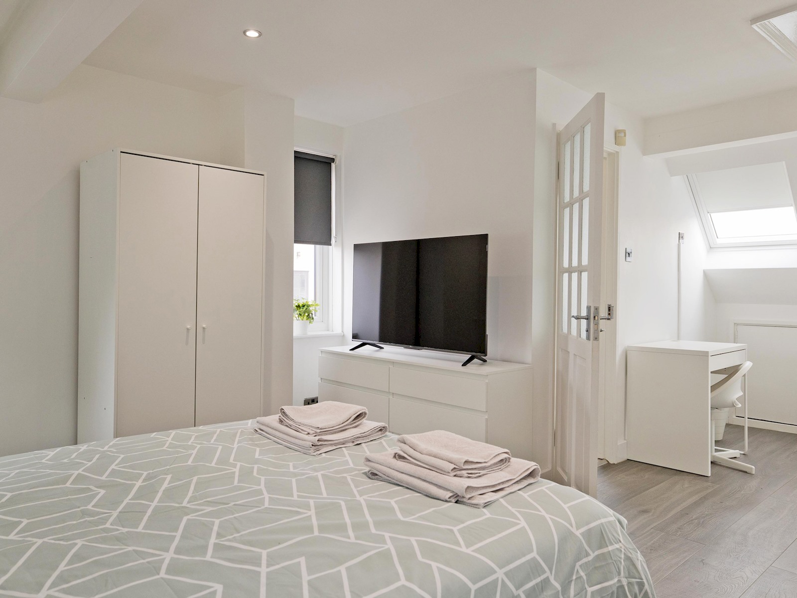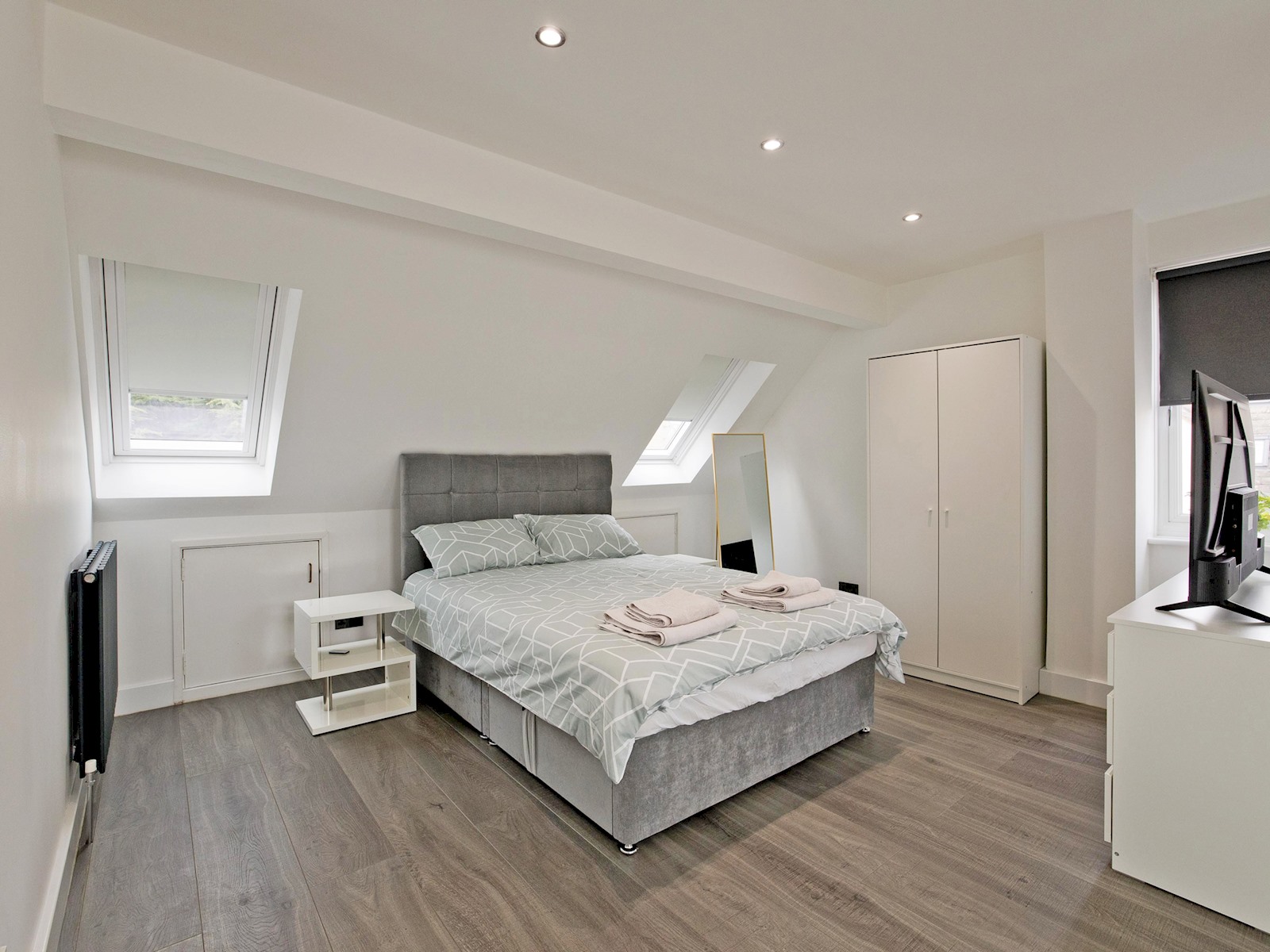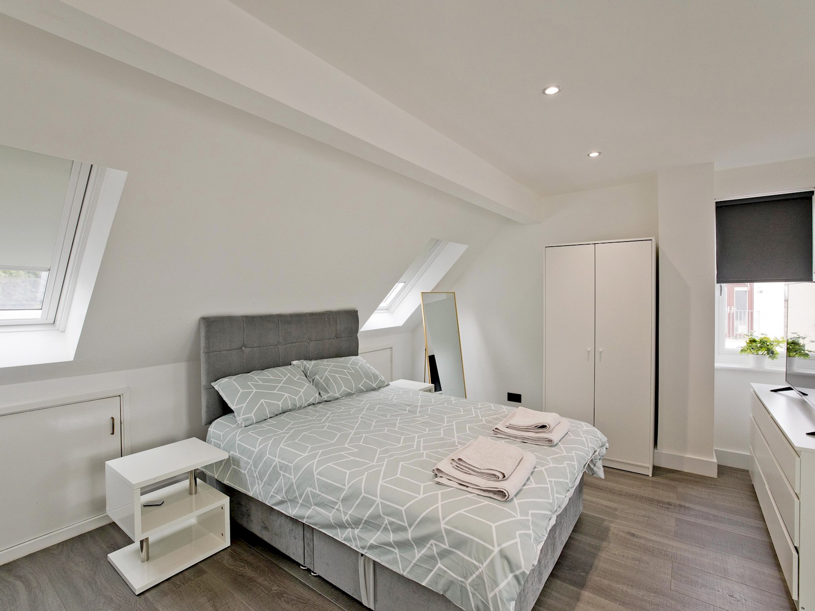The top floor loft suite serves as the master bedroom, complete with a plush double bed, ensuite shower room, and its own TV. Skylights flood the space with natural light, creating a bright and peaceful environment.