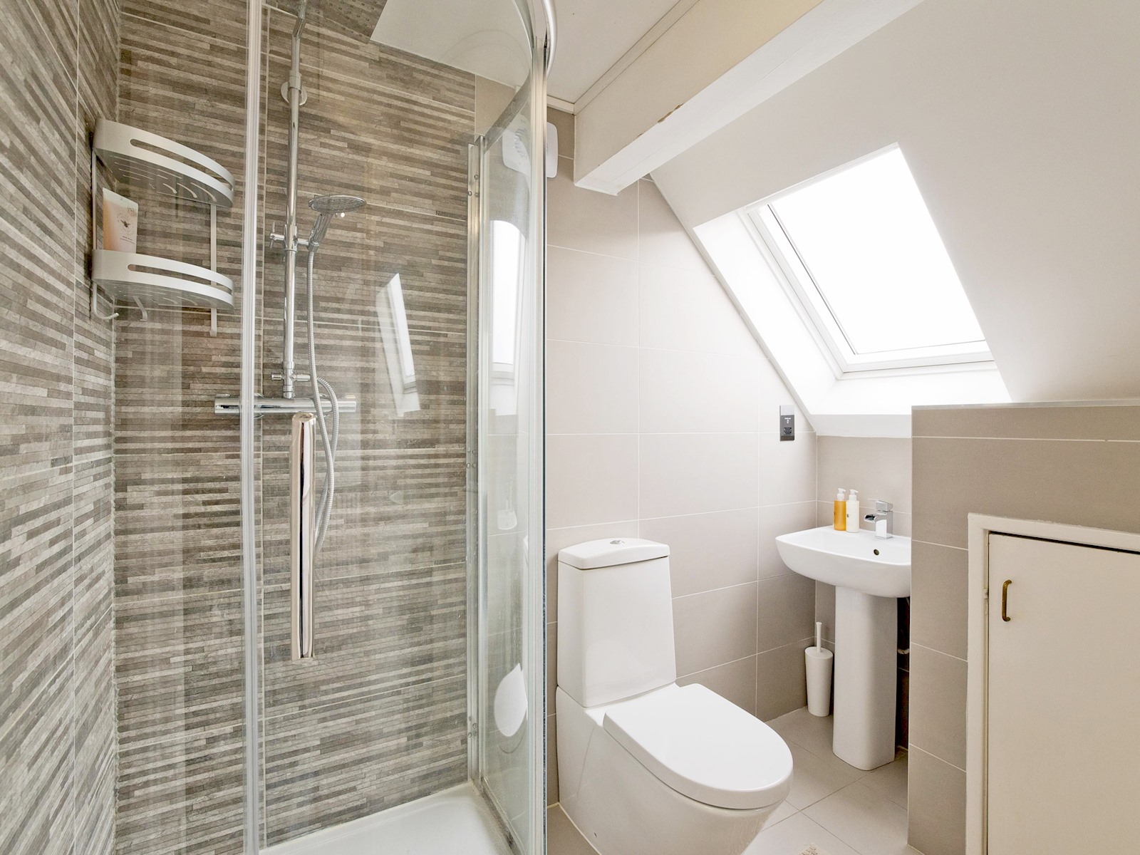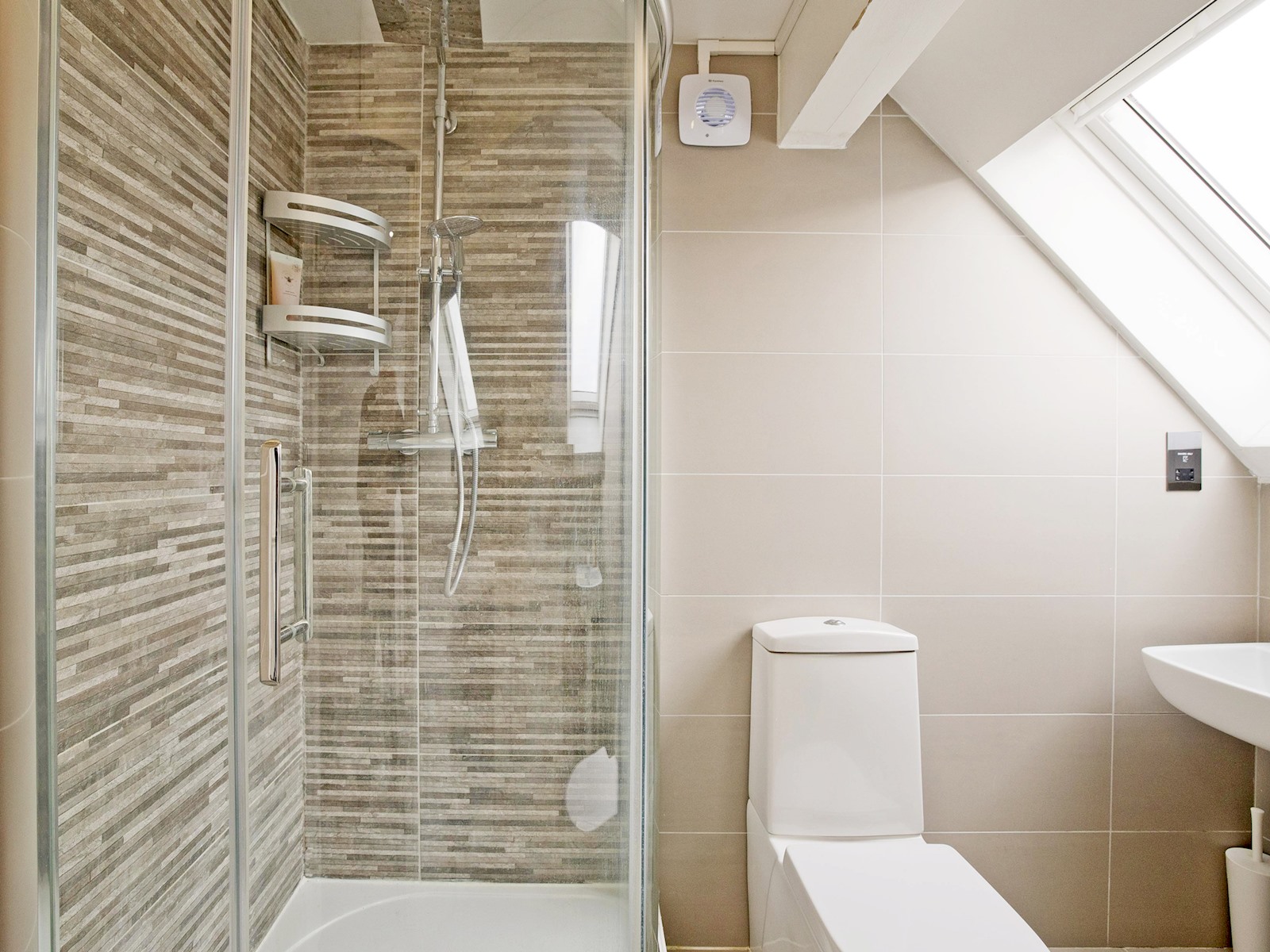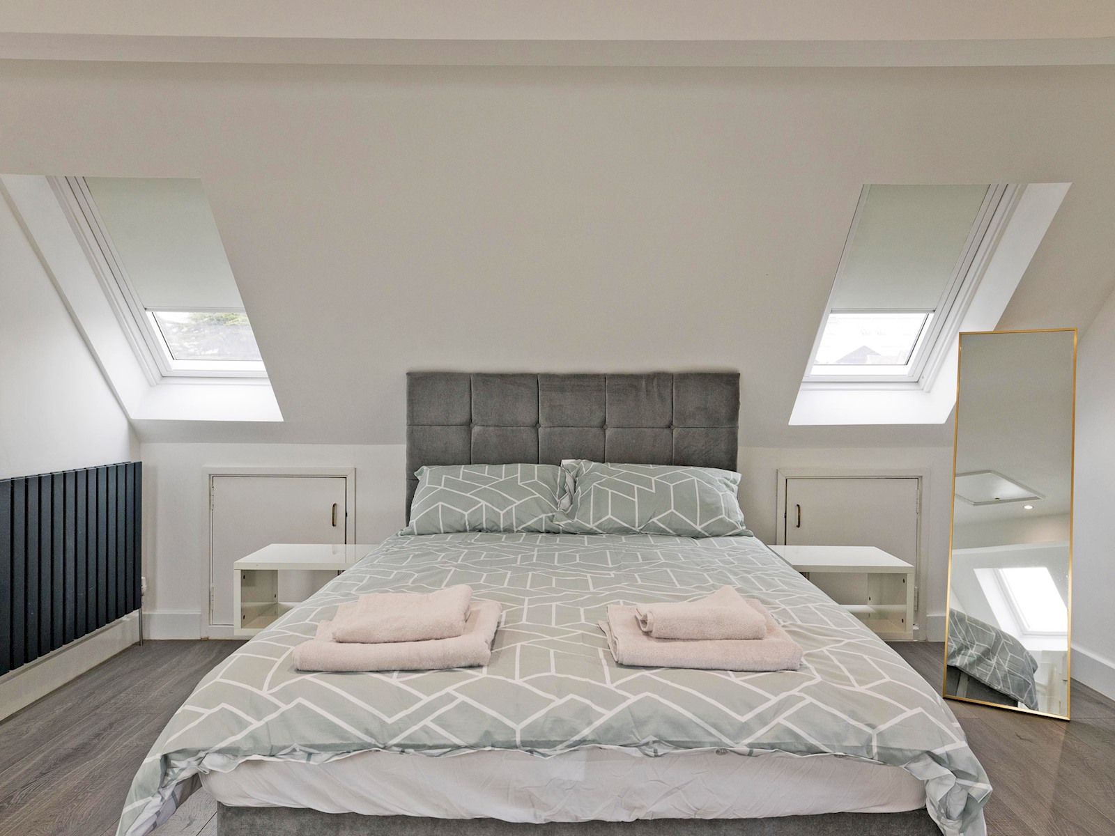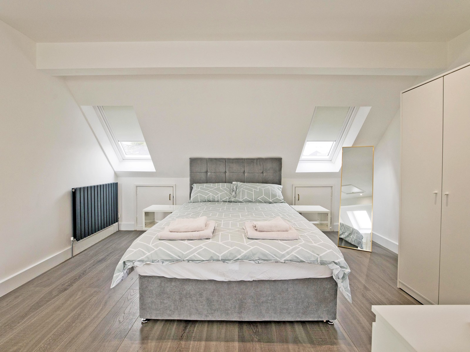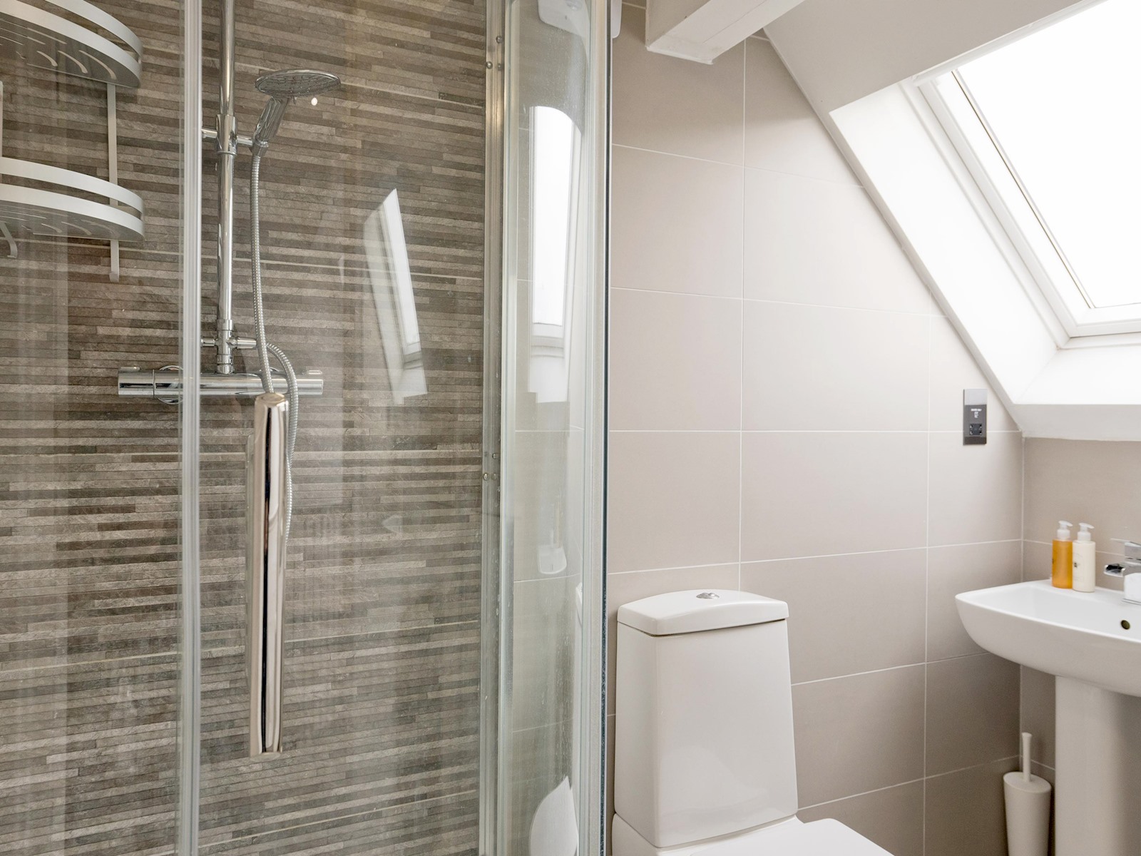 The top floor loft suite serves as the master bedroom, complete with a plush double bed, ensuite shower room, and its own TV. Skylights flood the space with natural light, creating a bright and peaceful environment.