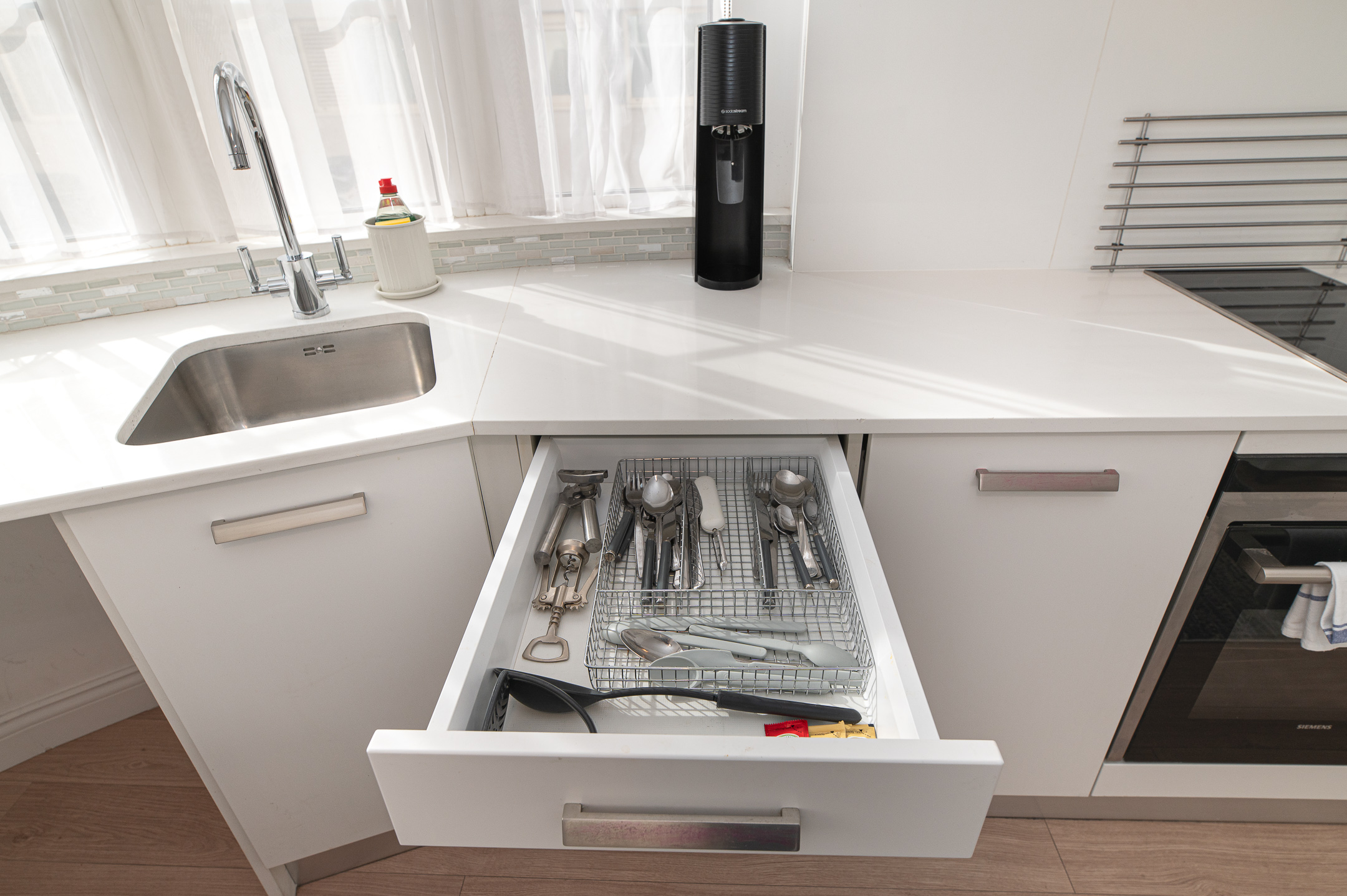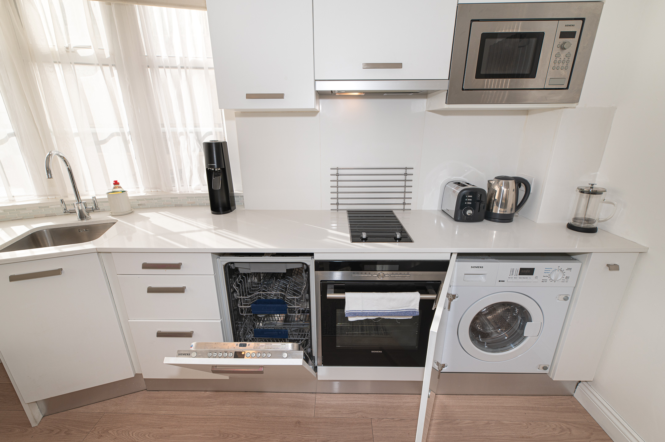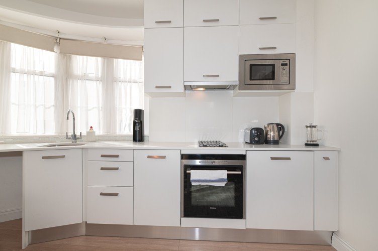 The adjoining kitchen is fully equipped with everything you might need during your stay, whether you’re preparing a quick breakfast before heading out or enjoying a quiet dinner in.