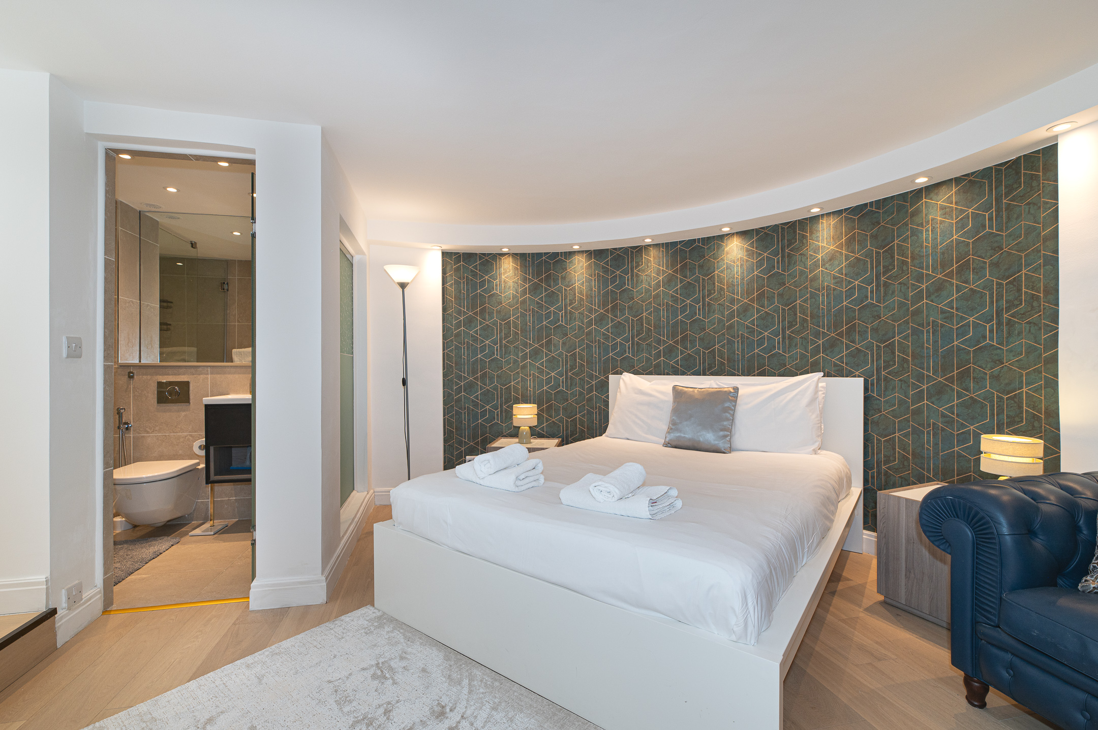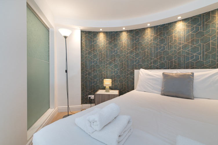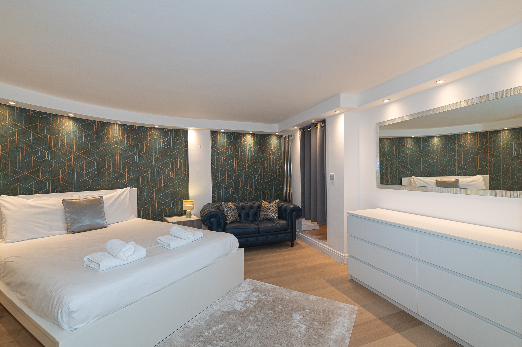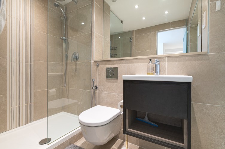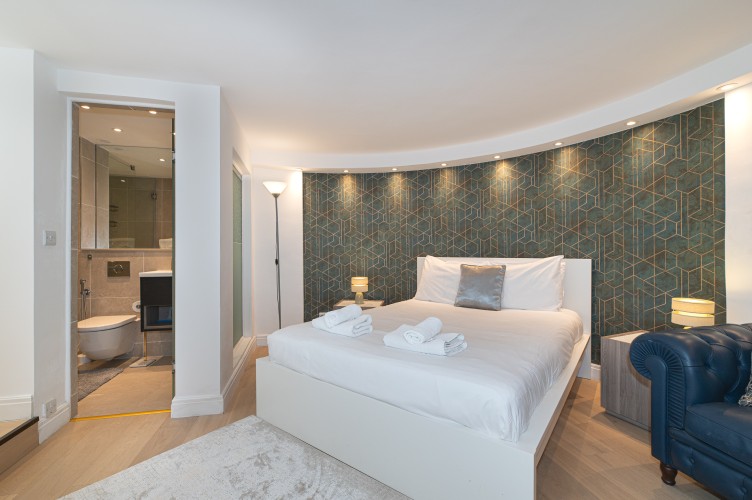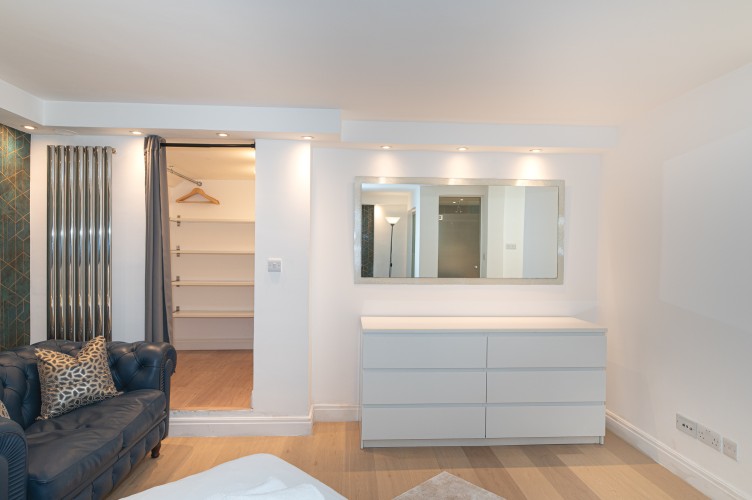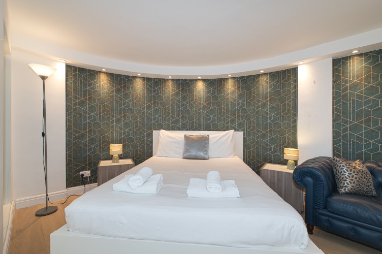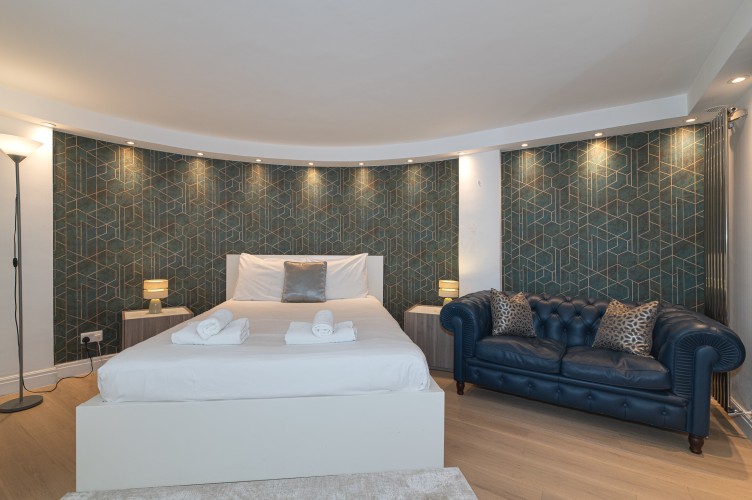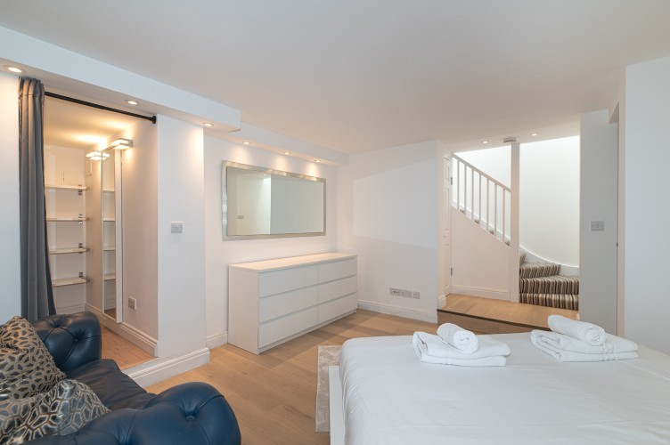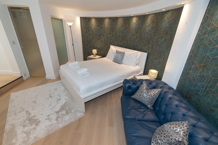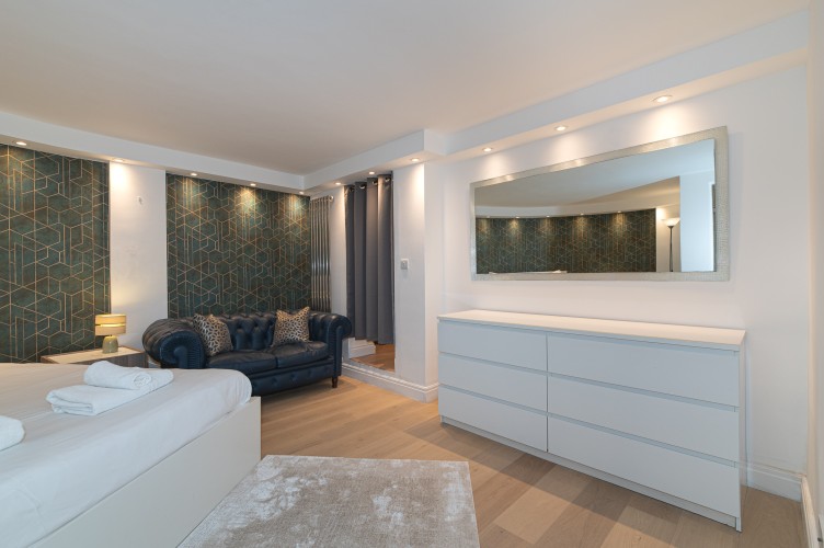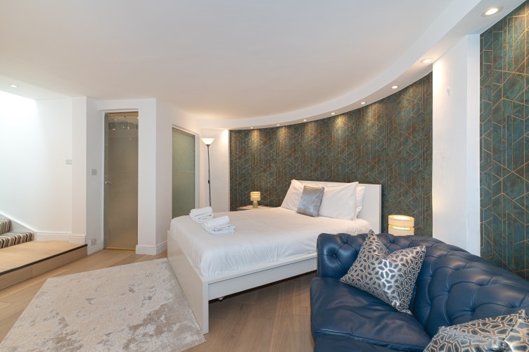 Downstairs, the basement level is calm and cosy, offering a spacious bedroom with a very comfortable king-size bed. There’s a large walk-in wardrobe, so you can properly settle in, and a sleek, modern bathroom with a generous shower, perfect for freshening up after a day exploring the city.