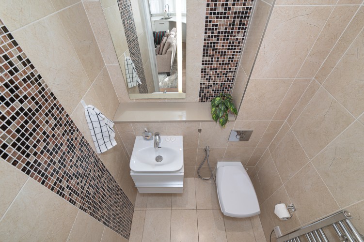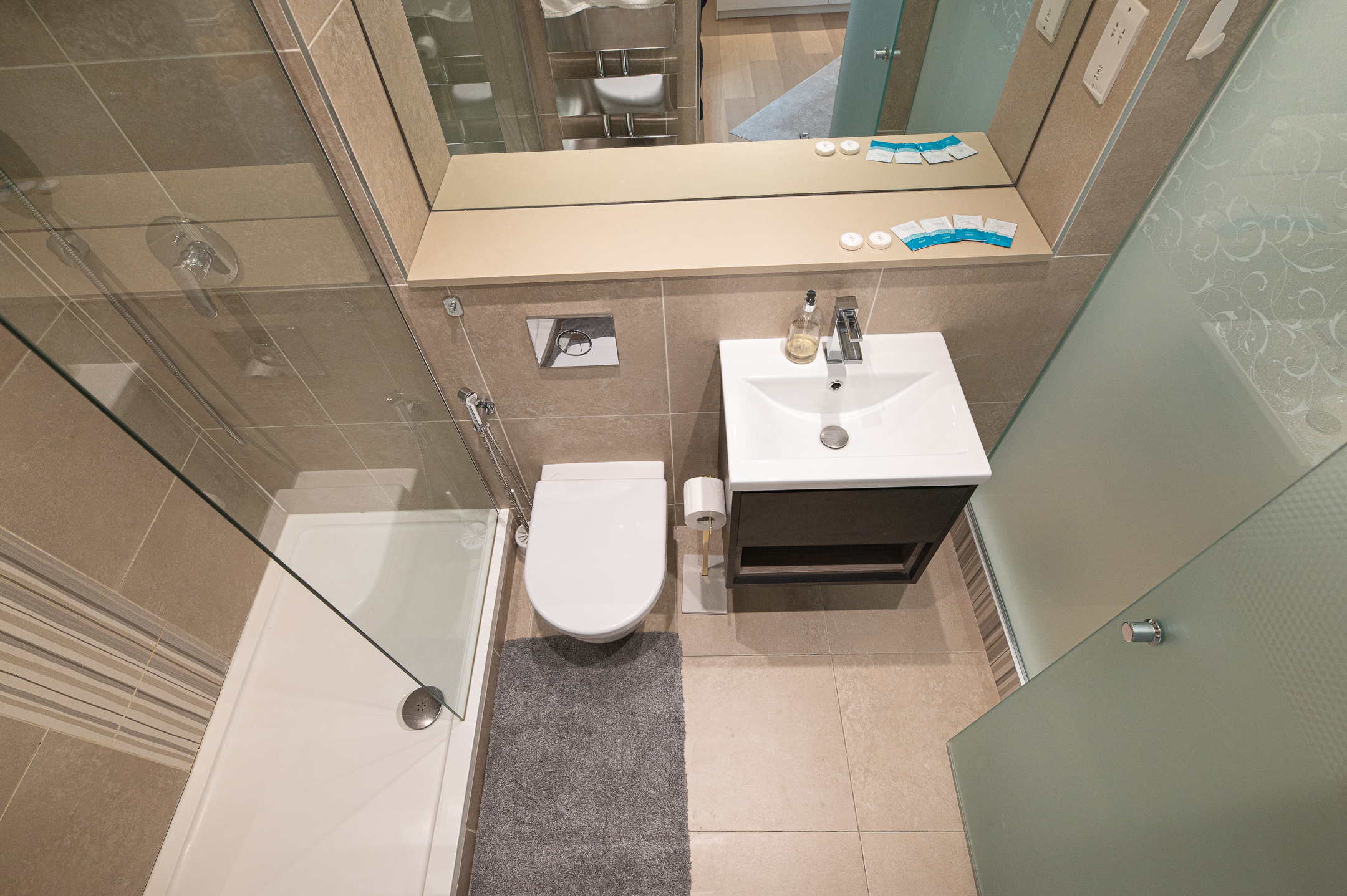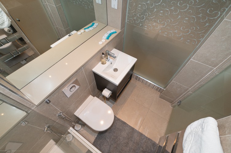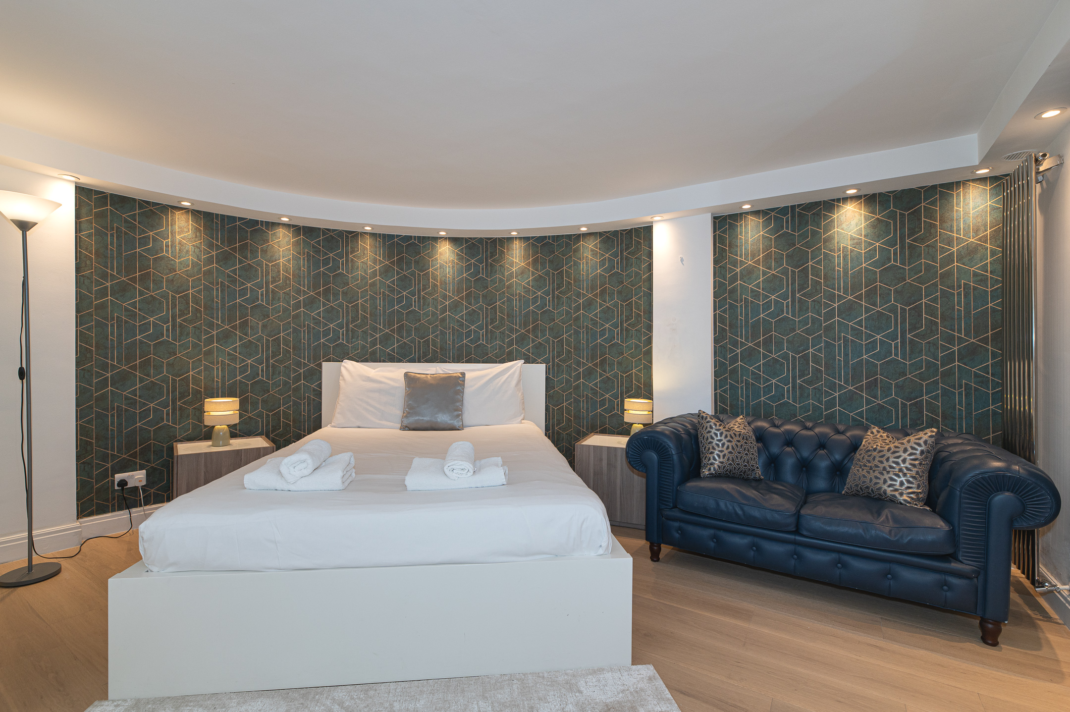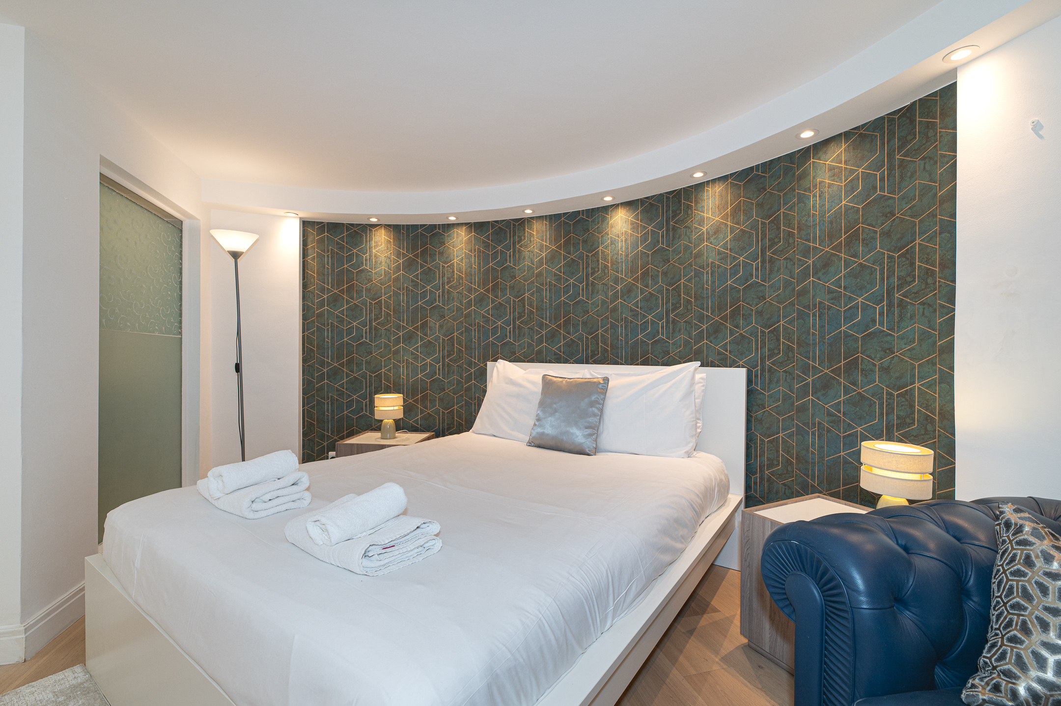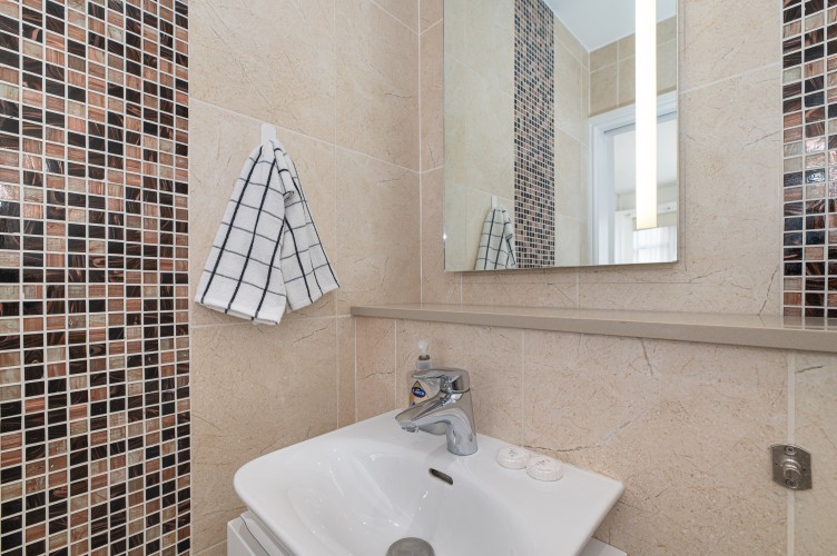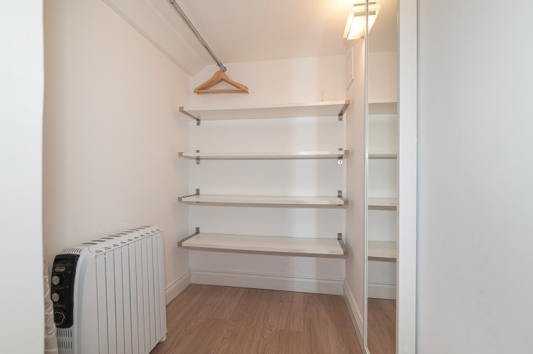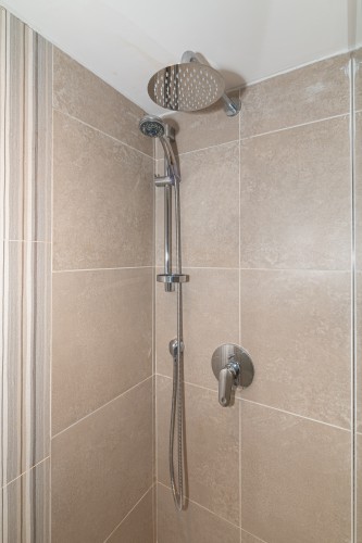 Downstairs, the basement level is calm and cosy, offering a spacious bedroom with a very comfortable king-size bed. There’s a large walk-in wardrobe, so you can properly settle in, and a sleek, modern bathroom with a generous shower, perfect for freshening up after a day exploring the city.