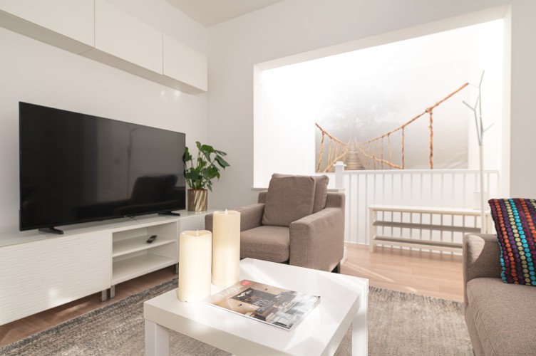 The flat is set across two levels and has its own private street entrance, giving it a lovely sense of independence and ease. Step inside on the ground floor and you’ll find a bright, welcoming living space designed for both relaxing and getting things done. There’s a comfortable sofa, a TV/screen, and a dedicated workspace, ideal whether you’re unwinding after a day out or catching up on emails. The sofa also converts into a double bed, making the space flexible for additional guests.