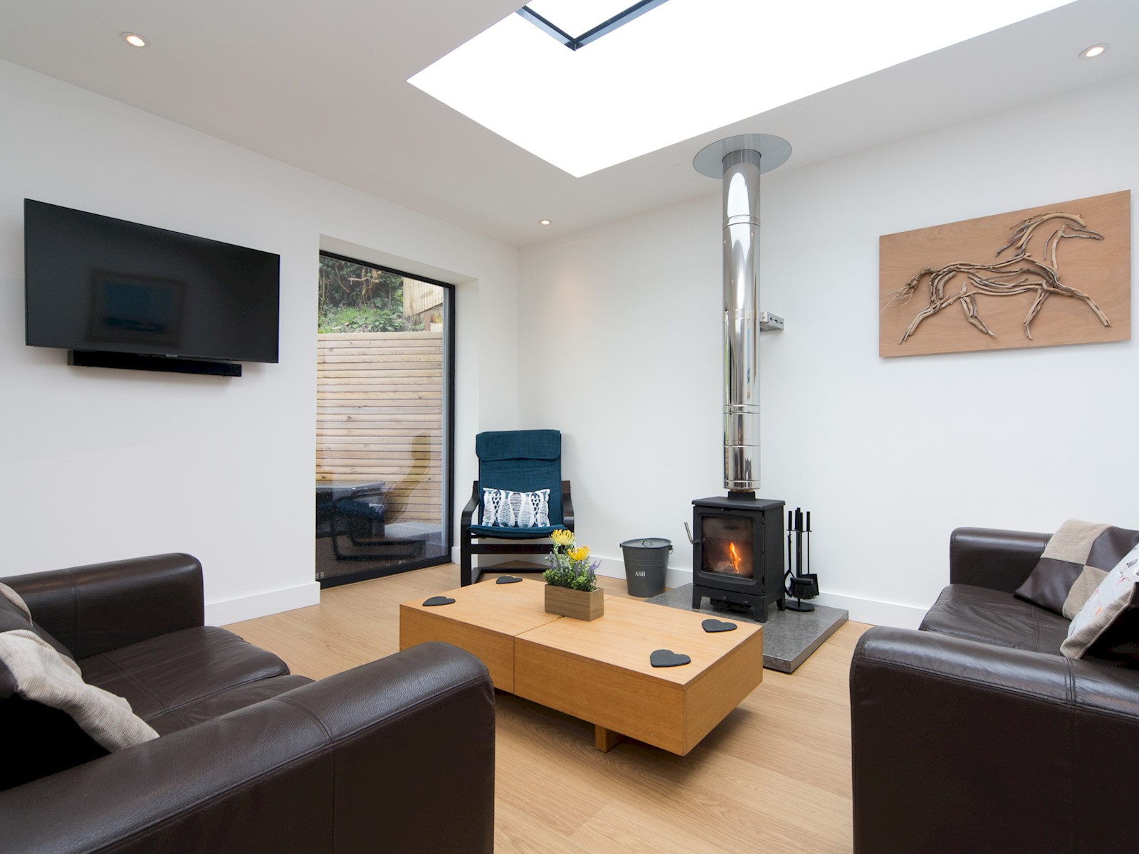 The lounge has a Smart 43 inch TV with a soundbar and a wood burning stove for you to enjoy on nights in.