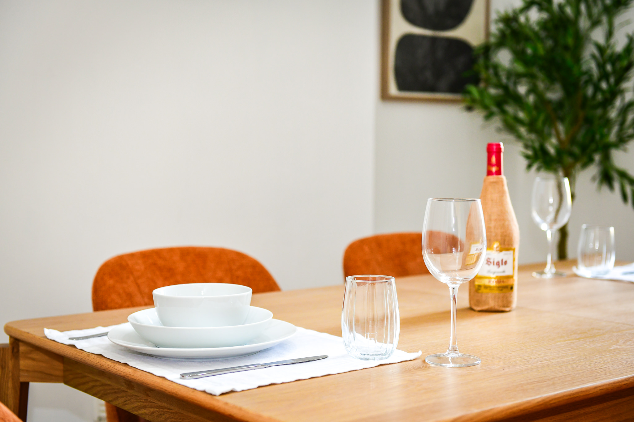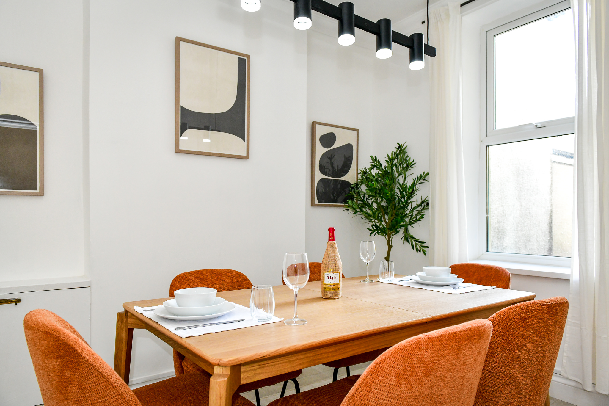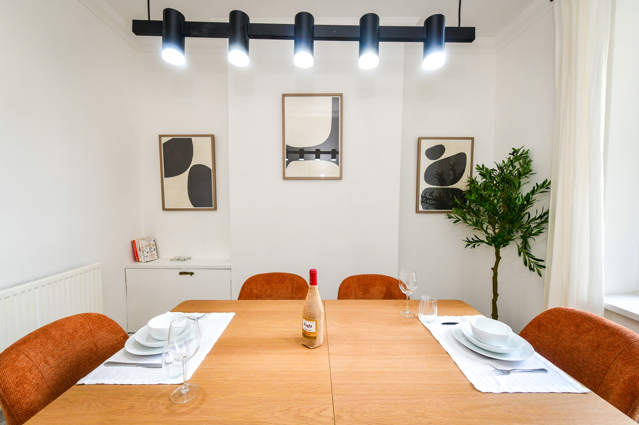 A modern dining area with seating for six — ideal for group meals, entertaining, or remote working.