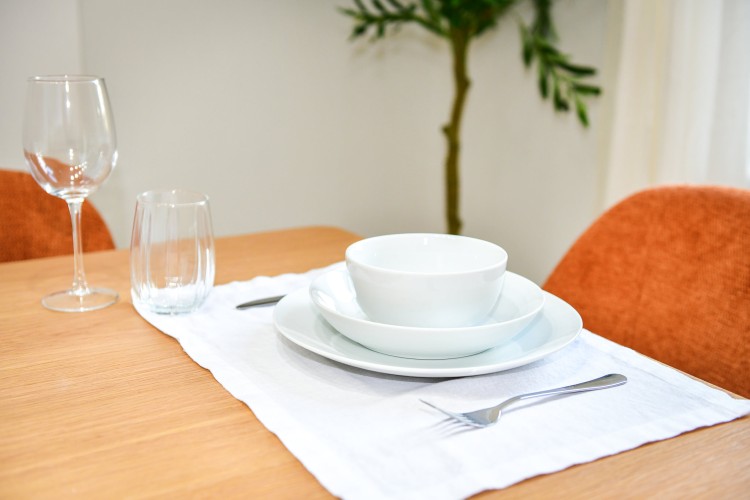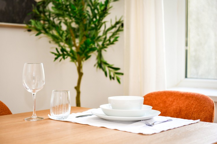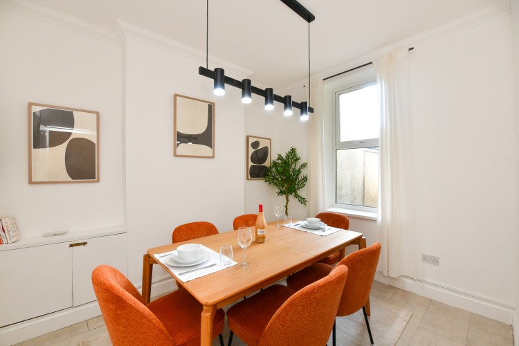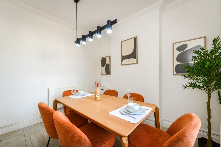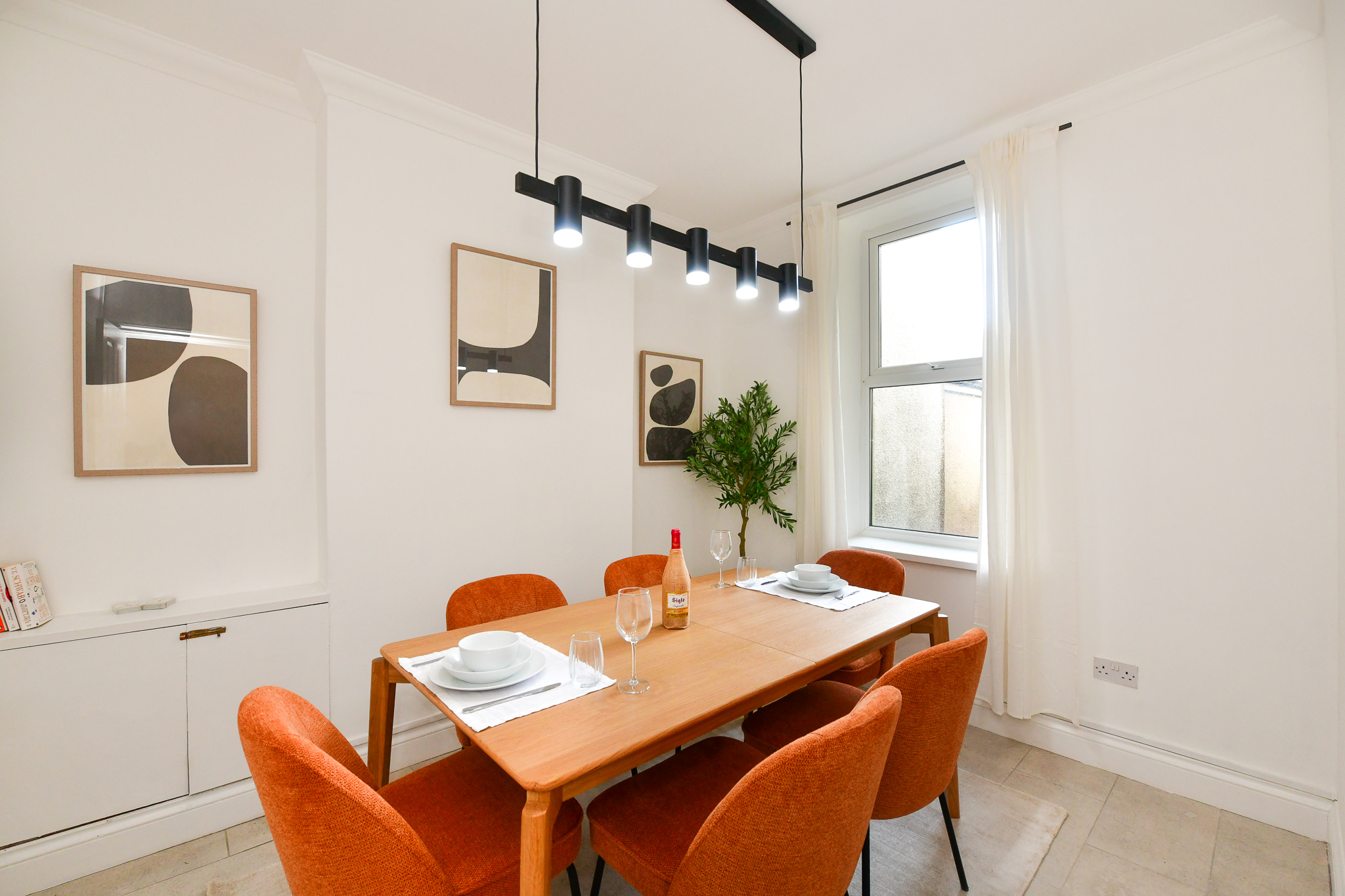 A modern dining area with seating for six — ideal for group meals, entertaining, or remote working.