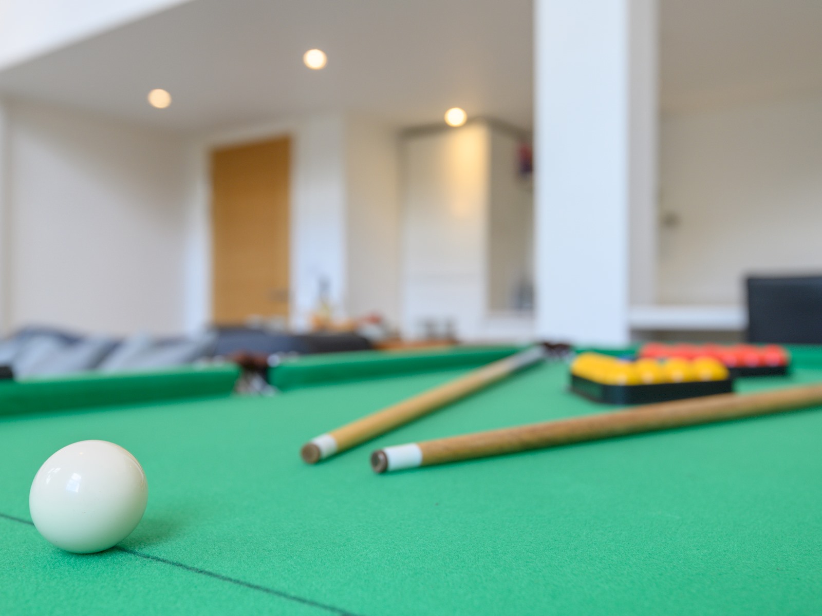 Enjoy the open-plan living area with comfy seating, a dining table for four, and a kitchen island with two extra chairs. The highlight is the full-sized pool table, perfect for fun evenings and friendly games with family or friends. Large Velux windows, remote operated with rain sensors, fill the space with natural light.