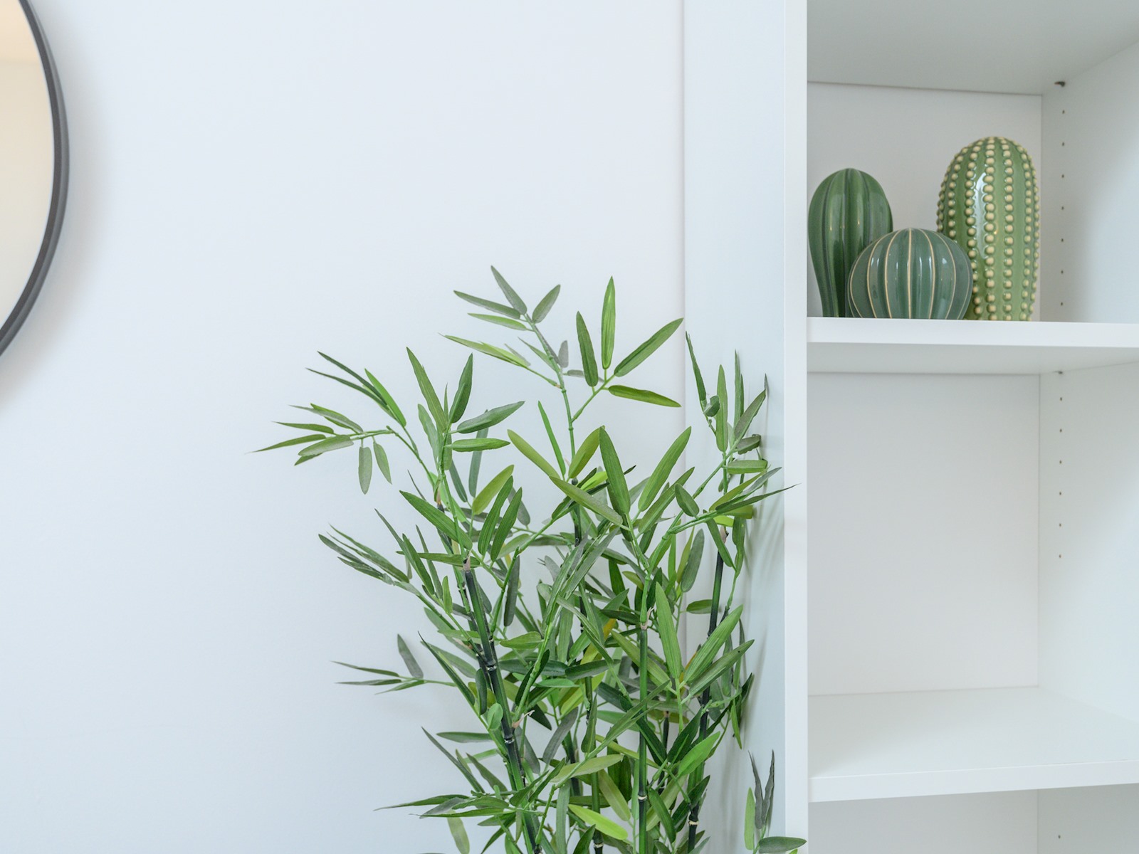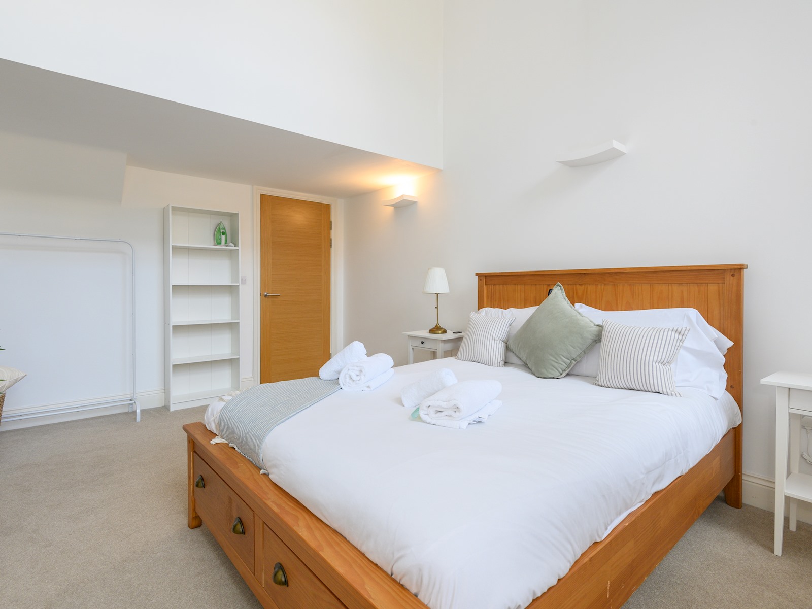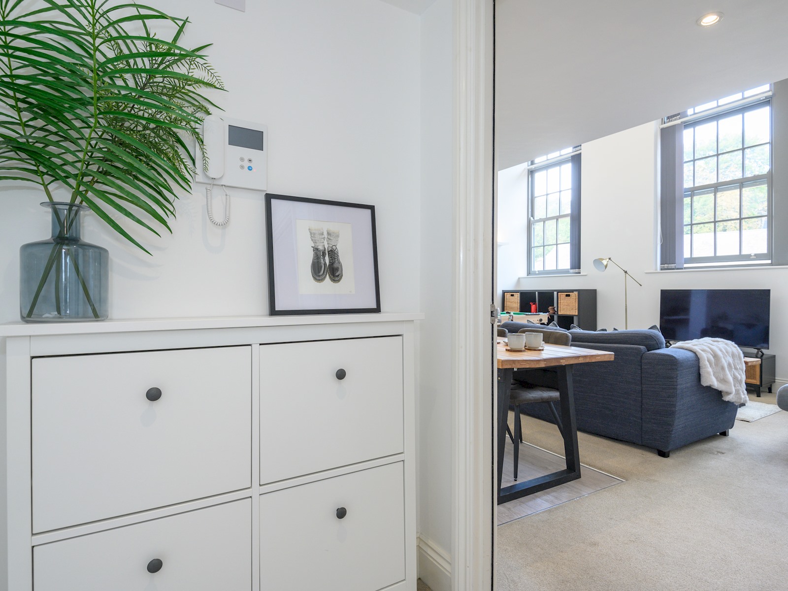 On the left, a second bedroom leading through to a small hallway with storage and then into the open-plan living space.