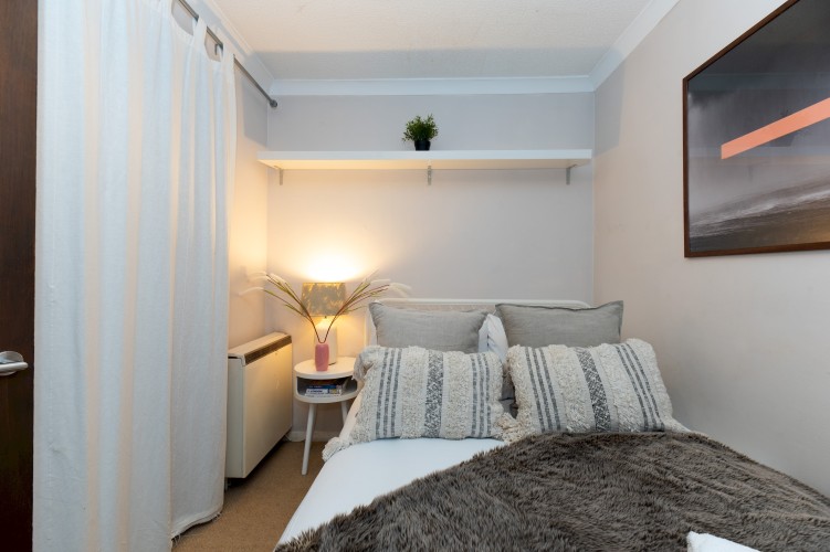 The bedroom includes a comfortable double bed, fresh linens, and storage space, providing a restful place to sleep.