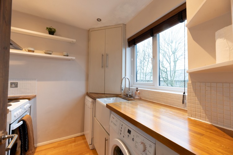 The separate kitchen is fully equipped for short or longer stays, with everything needed for everyday cooking.