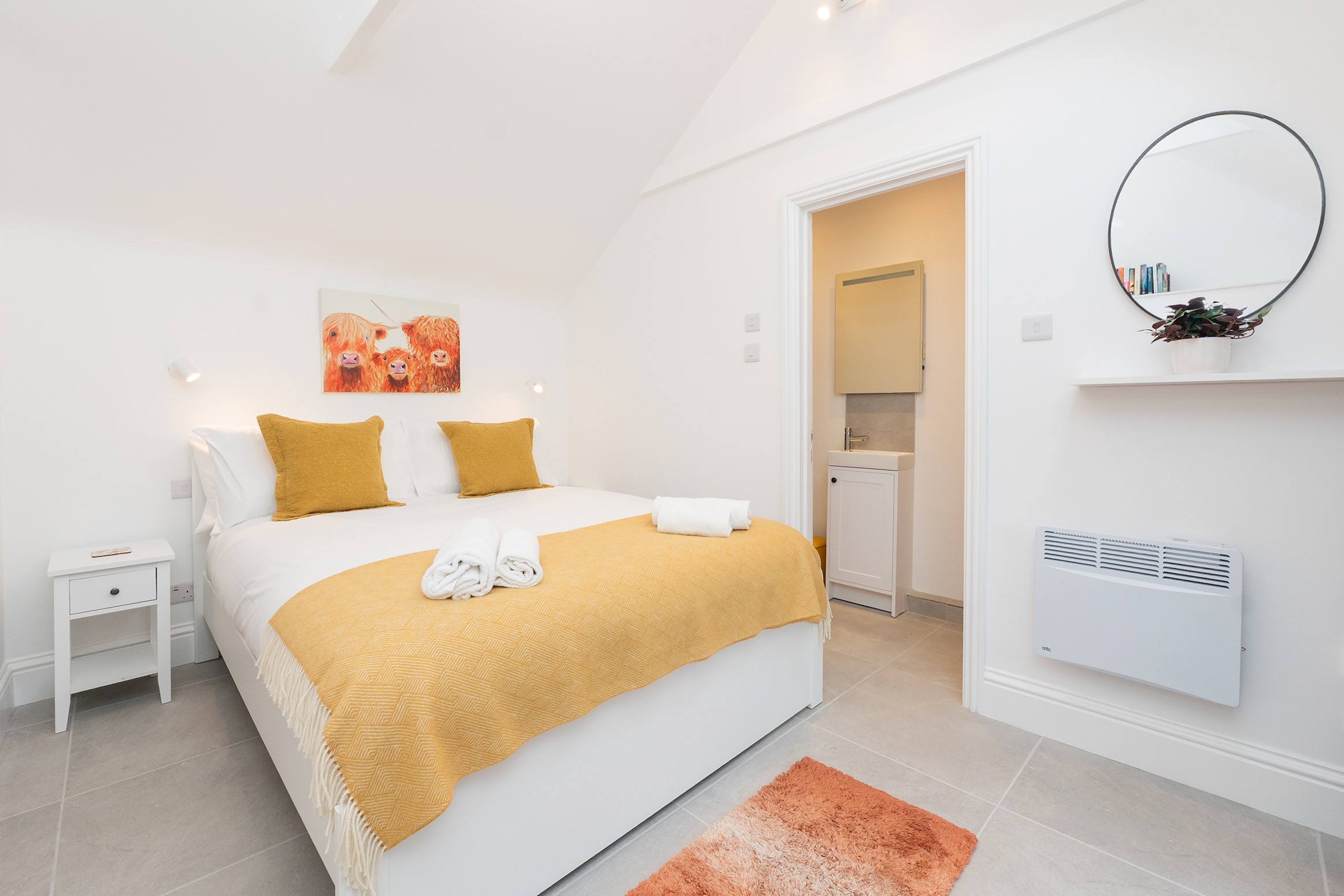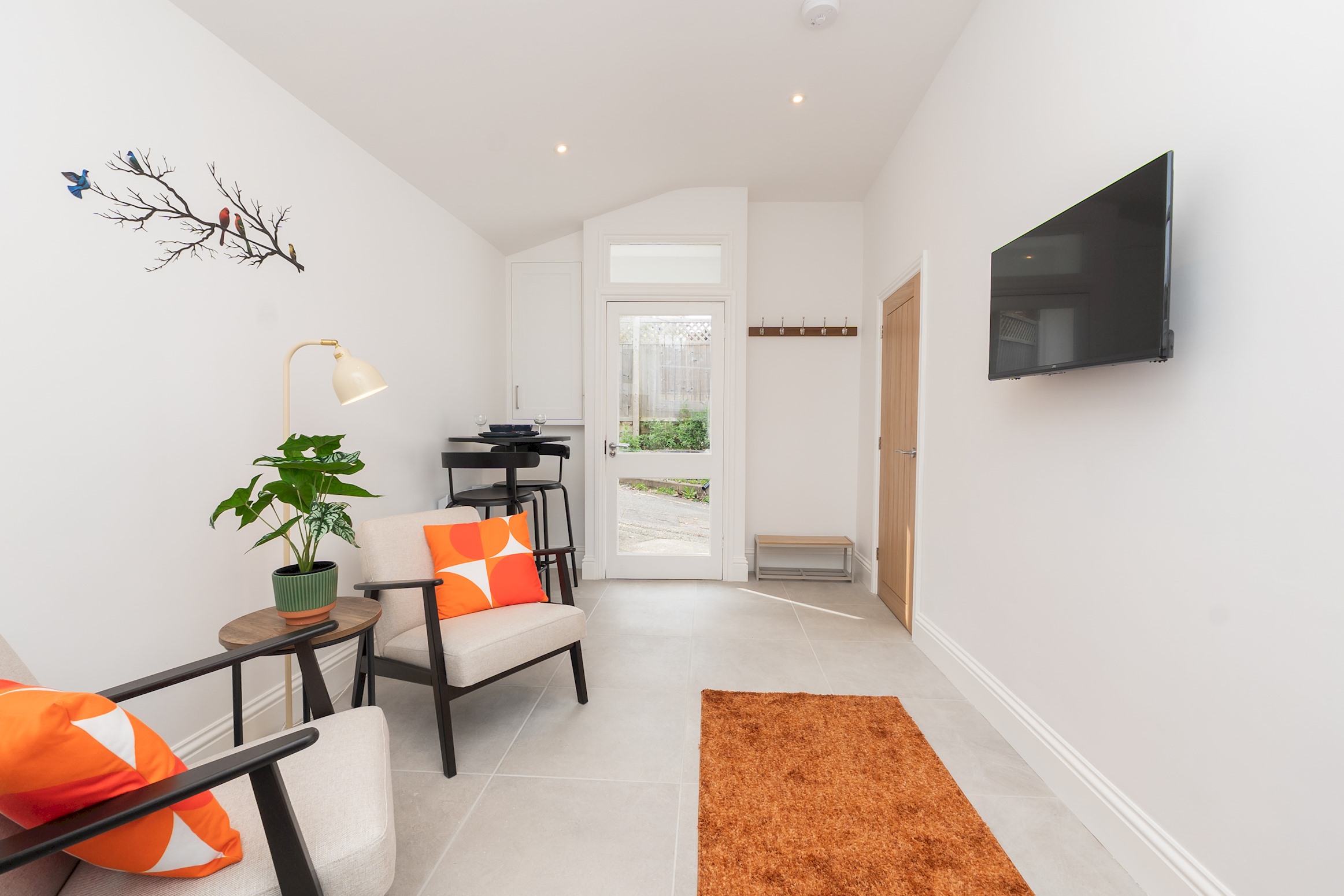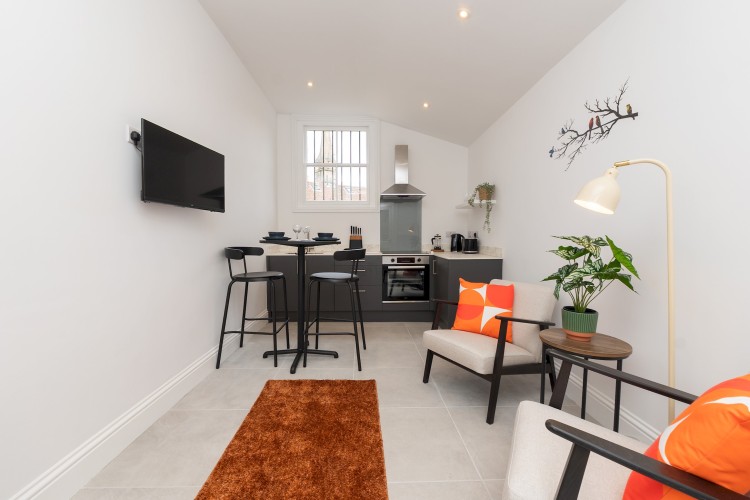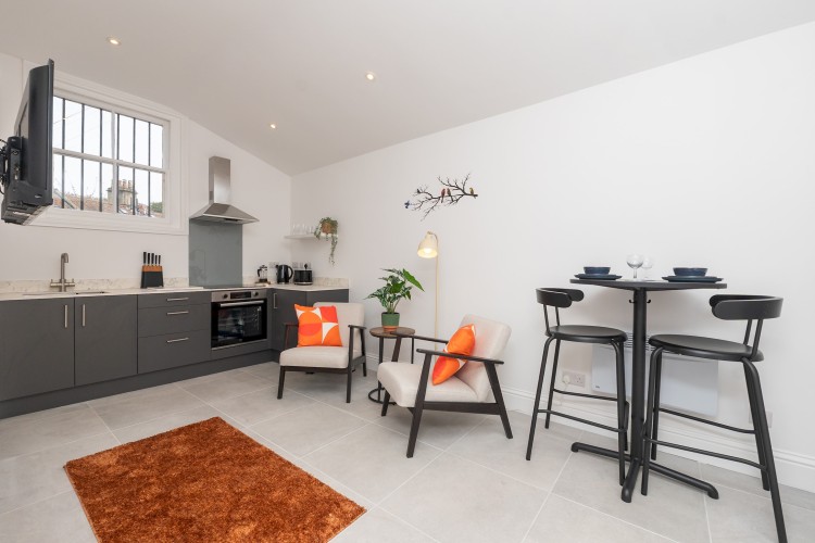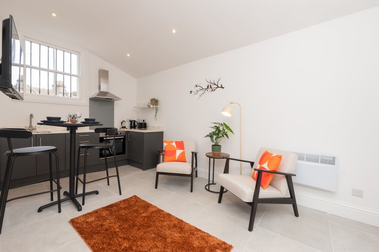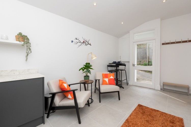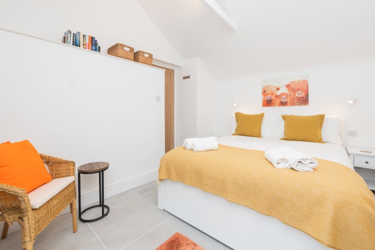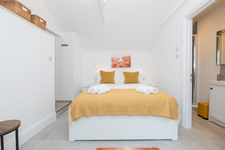 Self contained, single story flat with a beautifully presented interior, light and modern. There is an open plan living space with dining area and a fully equipped, fitted kitchen. The bedroom has a comfortable king size bed and adjoining shower