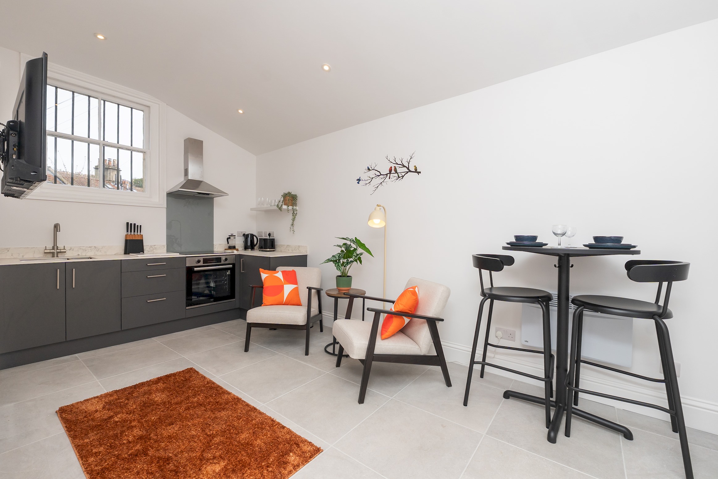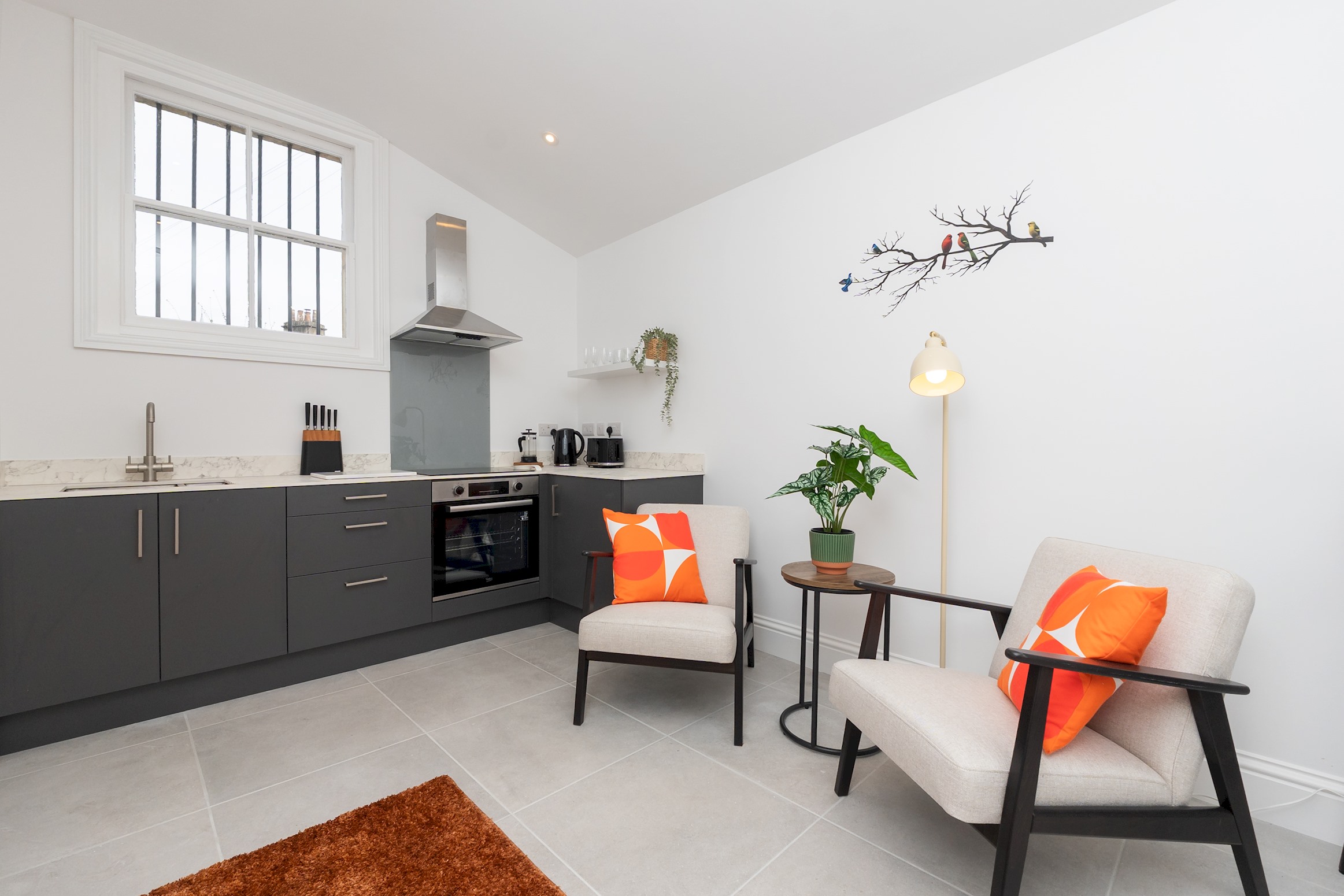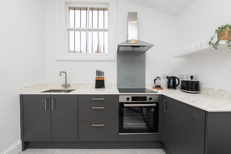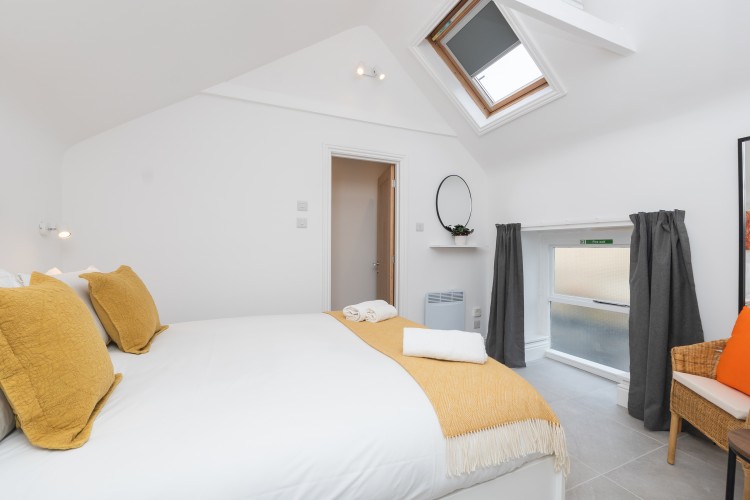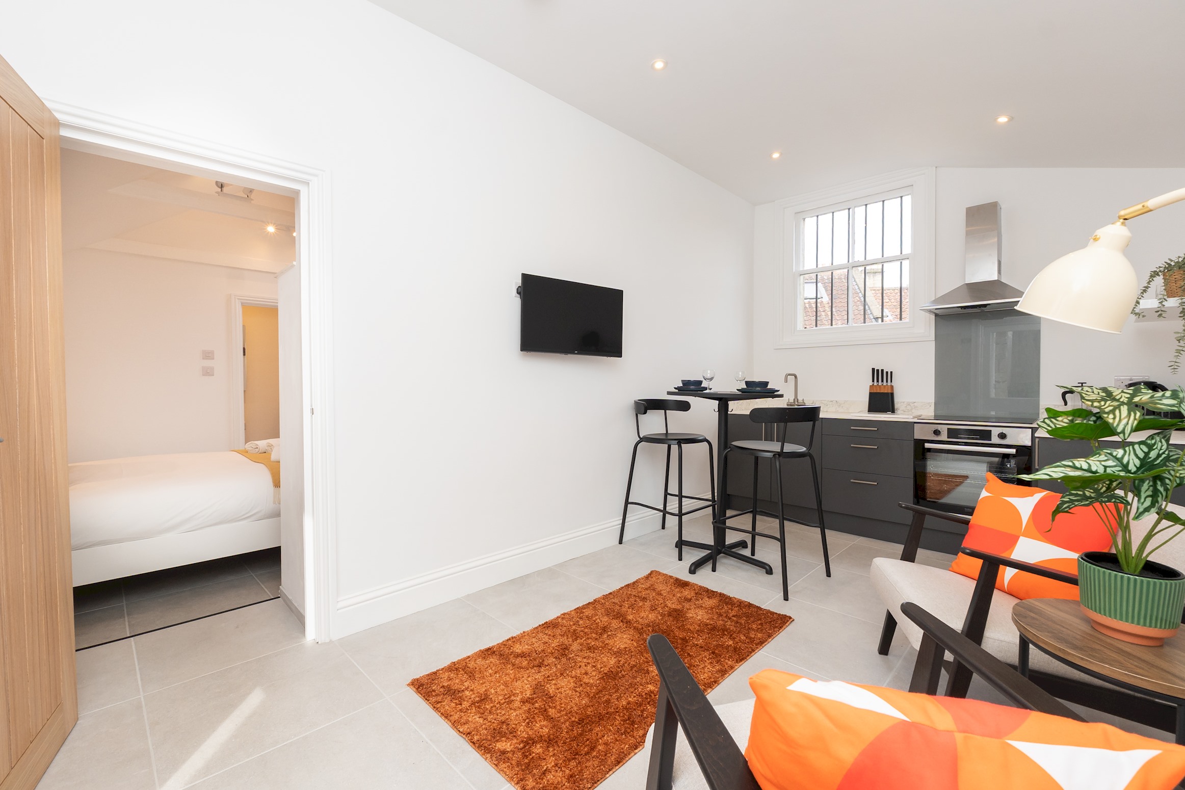 Self contained, single story flat with a beautifully presented interior, light and modern. There is an open plan living space with dining area and a fully equipped, fitted kitchen. The bedroom has a comfortable king size bed and adjoining shower