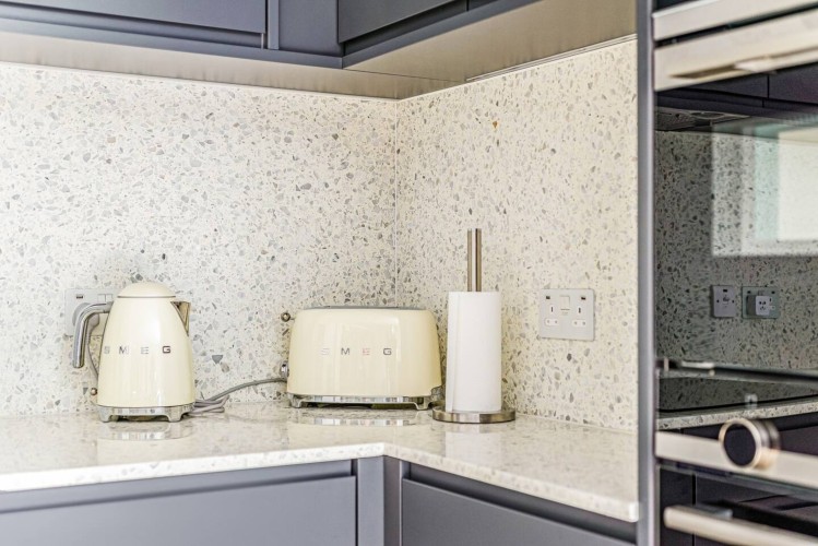Kitchen: A fully equipped kitchen with modern appliances including an oven, stove, microwave, fridge, dishwasher, kettle, and all the essentials for home-cooked meals.