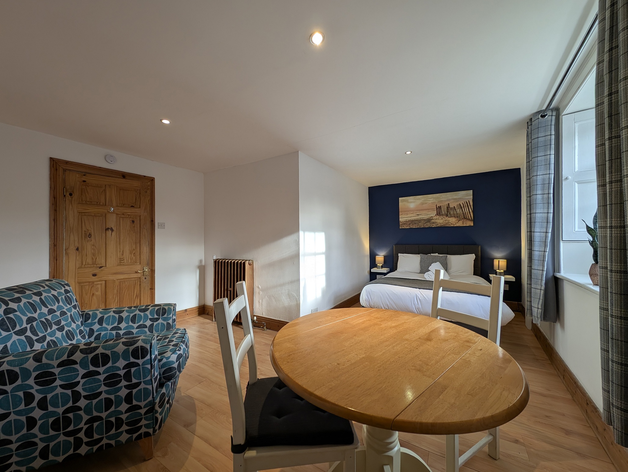 The open-plan living area provides a comfortable space to unwind, with a dining table for group meals and a TV for cosy evenings in.
