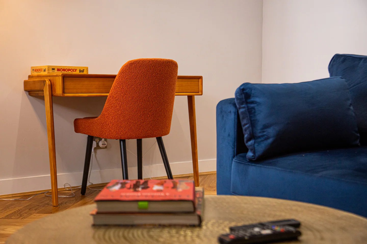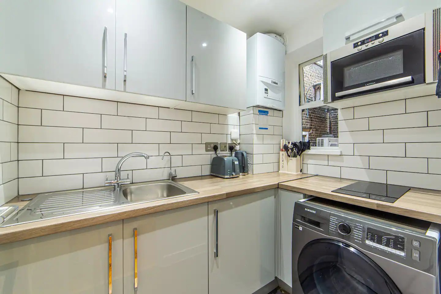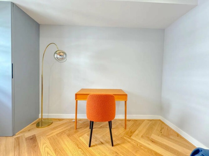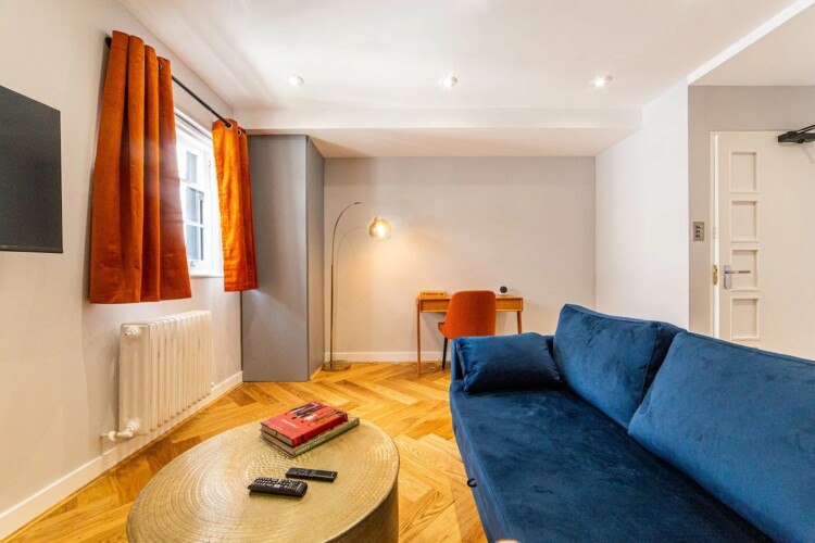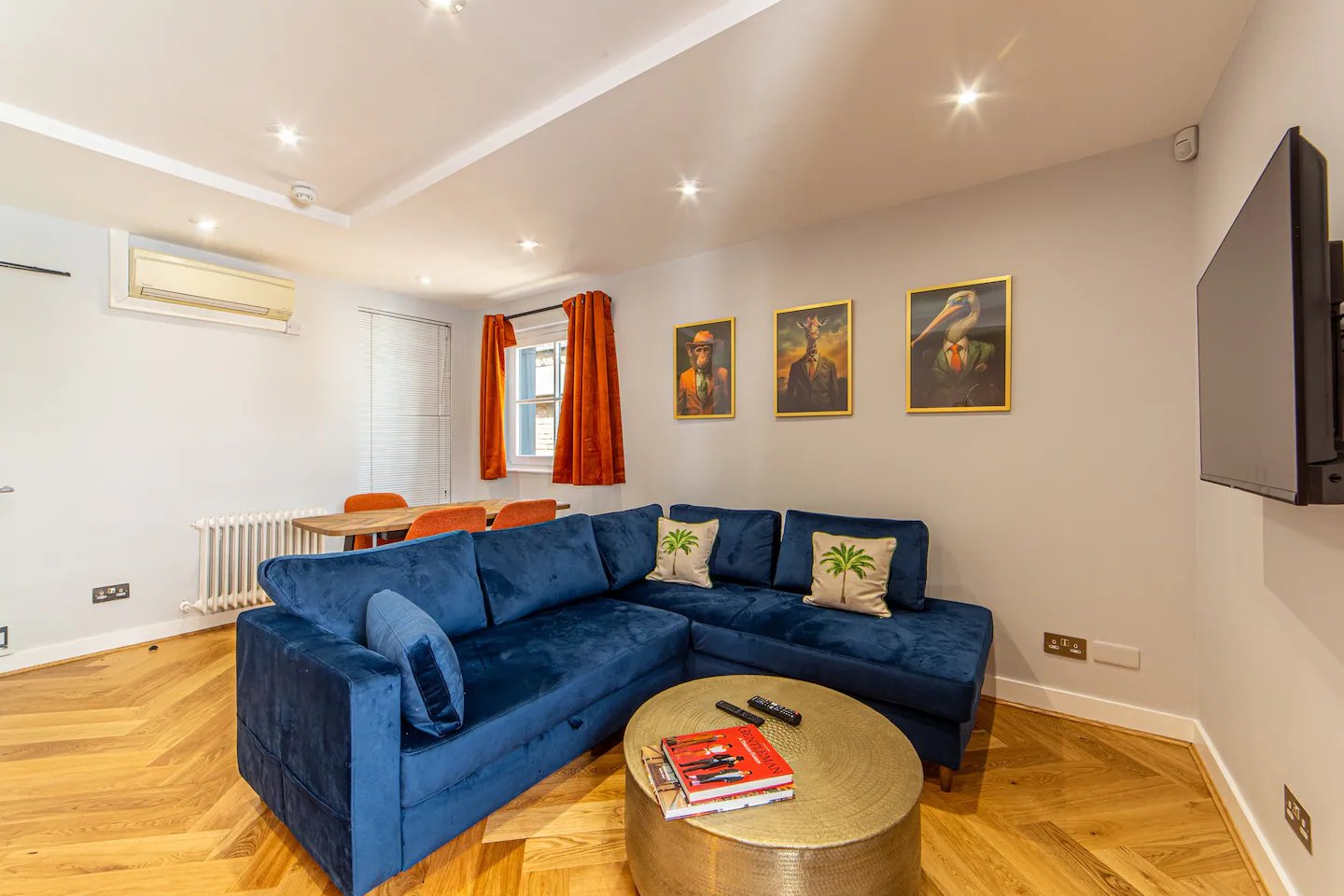 This 2-bed flat comprises 1 bedroom with a king-size bed, a 2nd bedroom with a day bed, a living room with an L-shaped sofa that converts into a queen-size sofa bed, a large dining table that seats 4, and a study area. The flat has a kitchen featuring all the necessary appliances (except an oven and a freezer) and a modern bathroom. The property has air conditioning and central heating, as well as double-glazed windows to ensure peace and quiet throughout the property.