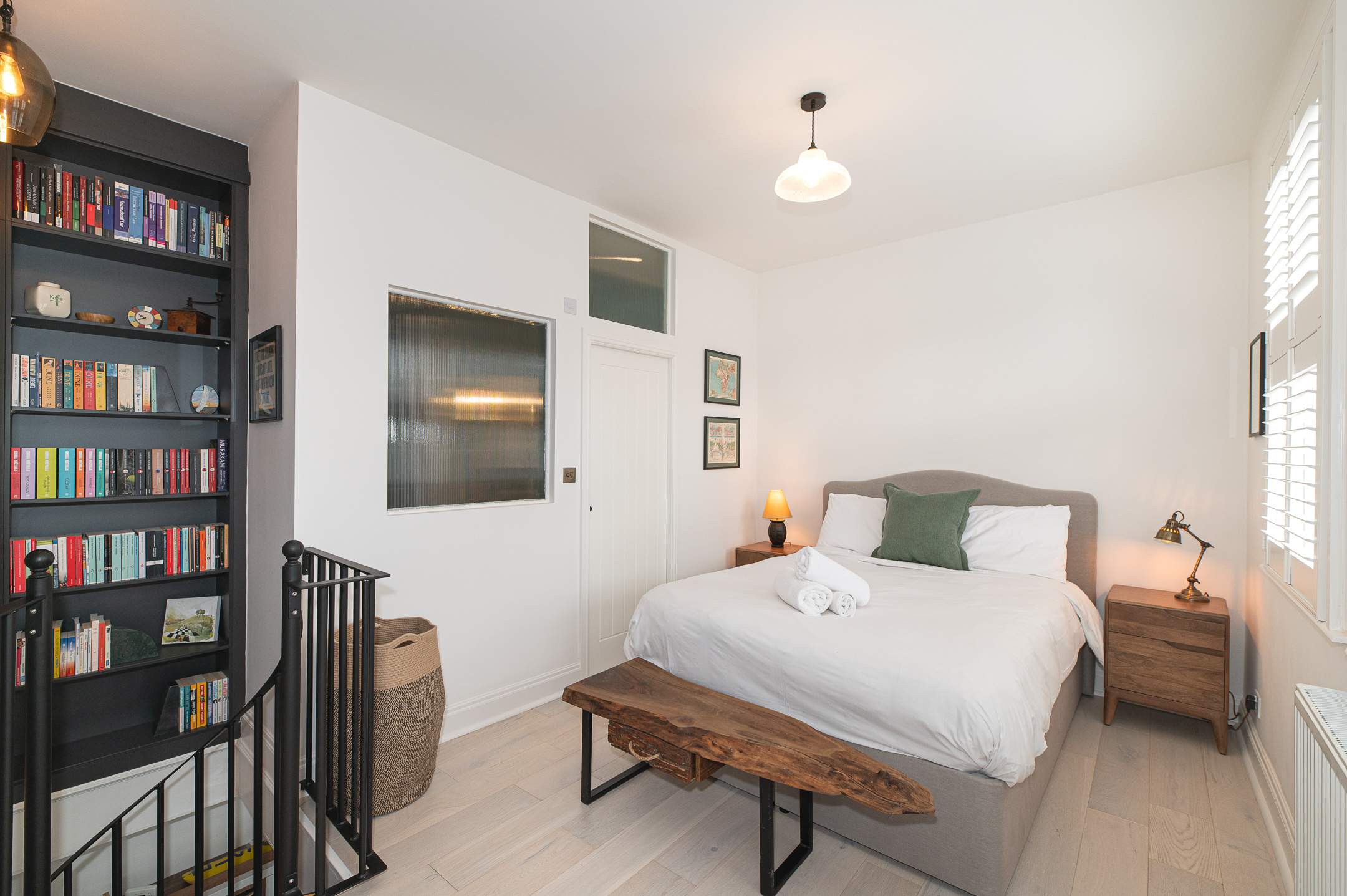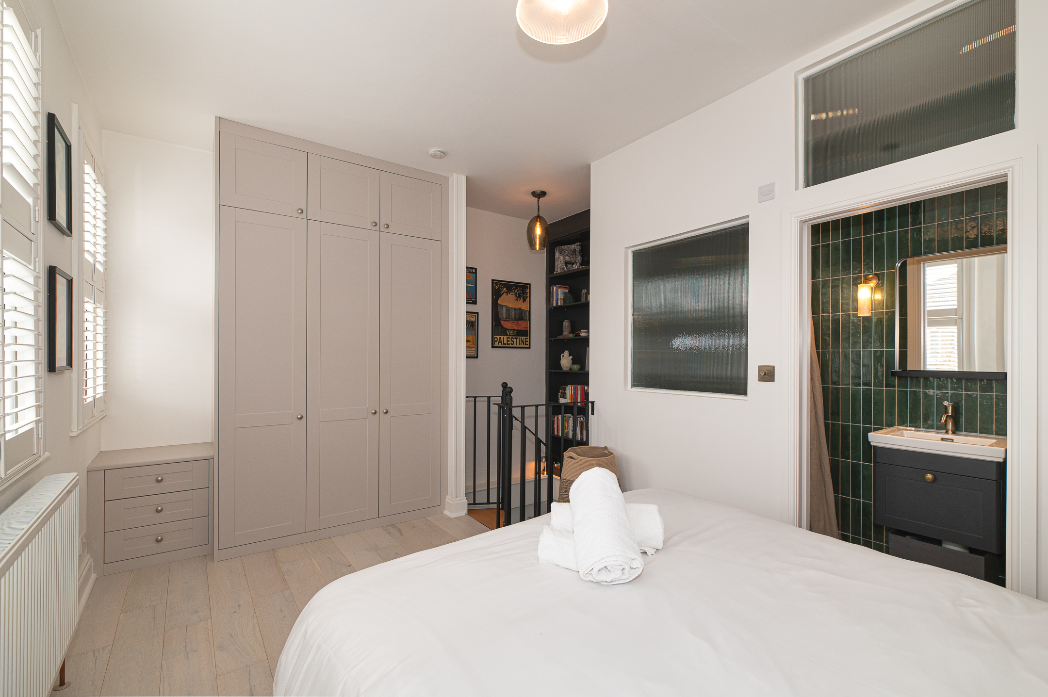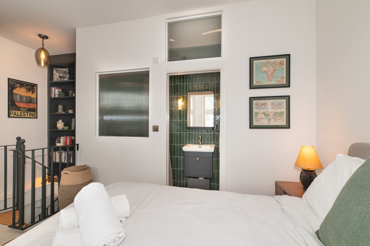 Upstairs, the first floor features a beautifully set king-size bed designed for a restful night’s sleep, along with a spacious wardrobe to settle in comfortably. The bathroom is modern and fresh, complete with a sleek shower.