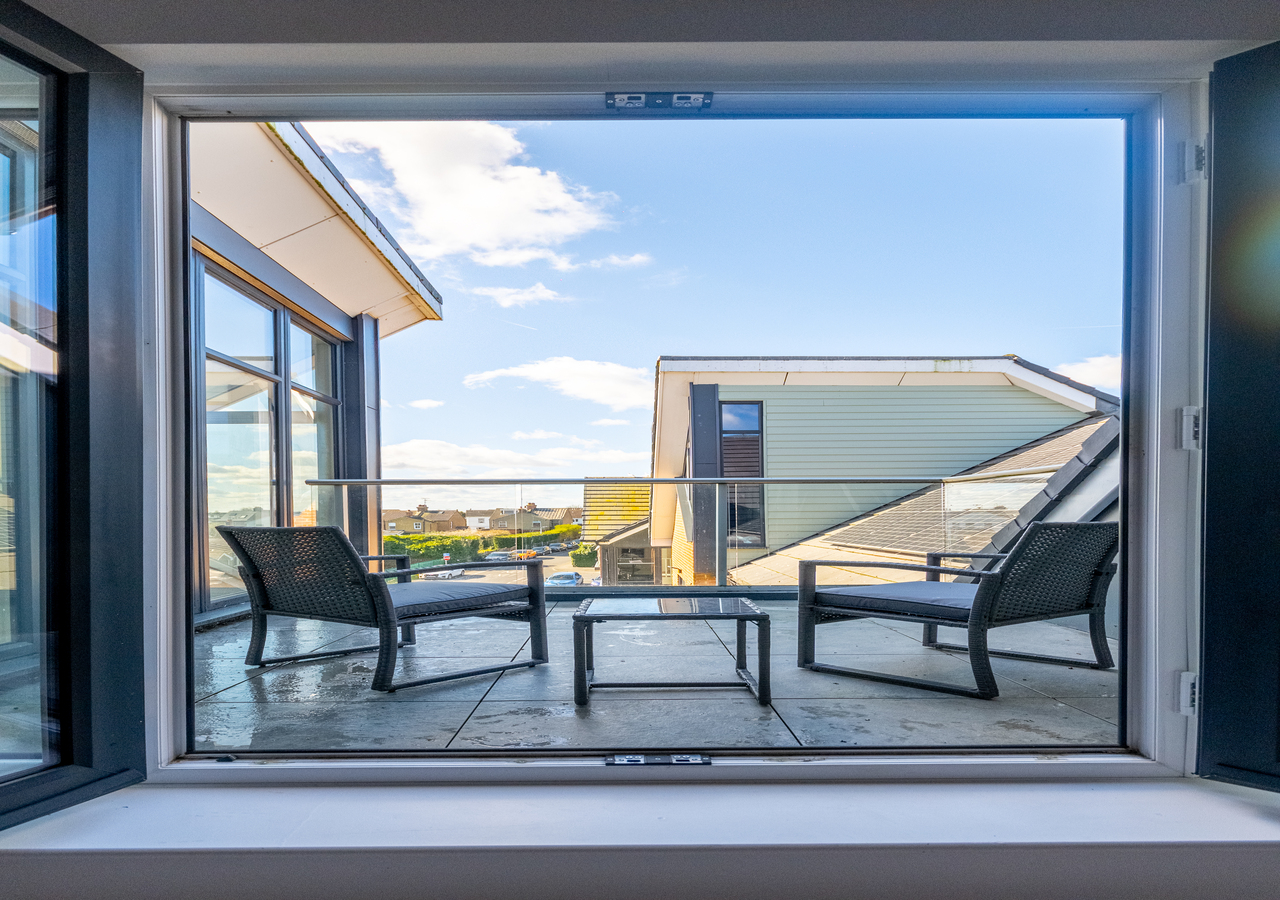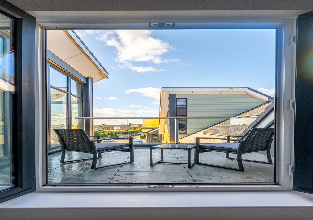 A large patio-style balcony with comfortable seating—ideal for morning coffee or evening drinks