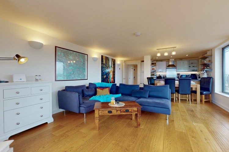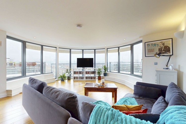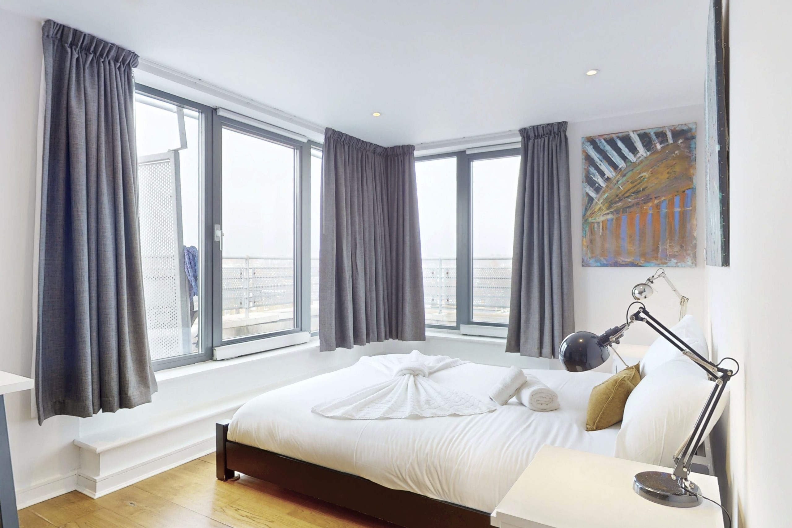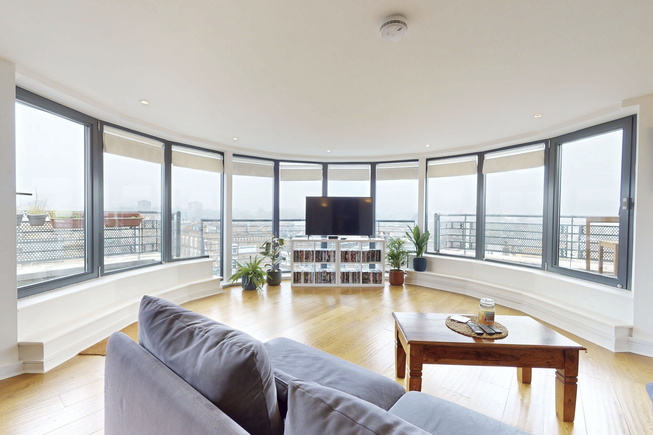 This penthouse sits above the hum of Dalston, wrapped in sky and light. The first thing most guests notice is the curve of windows in the living space — a gentle arc of glass that lets the day pour in. In the morning, it’s all soft brightness and rooftops; by evening, the city flickers quietly beyond the glass.