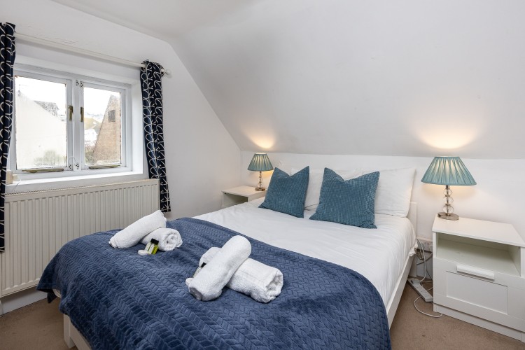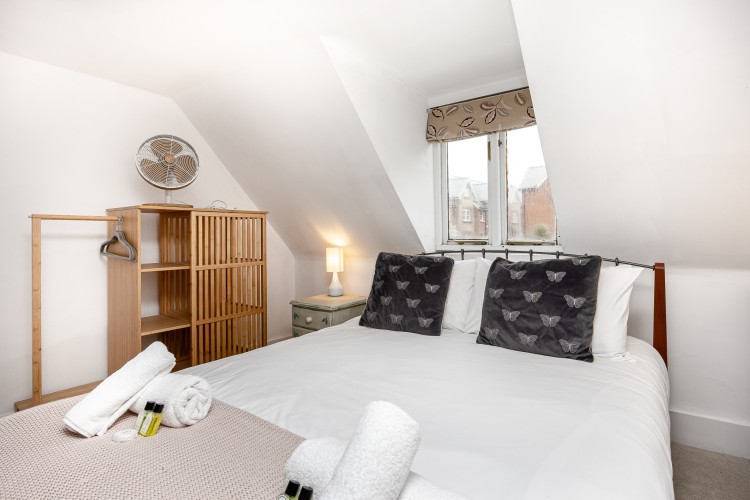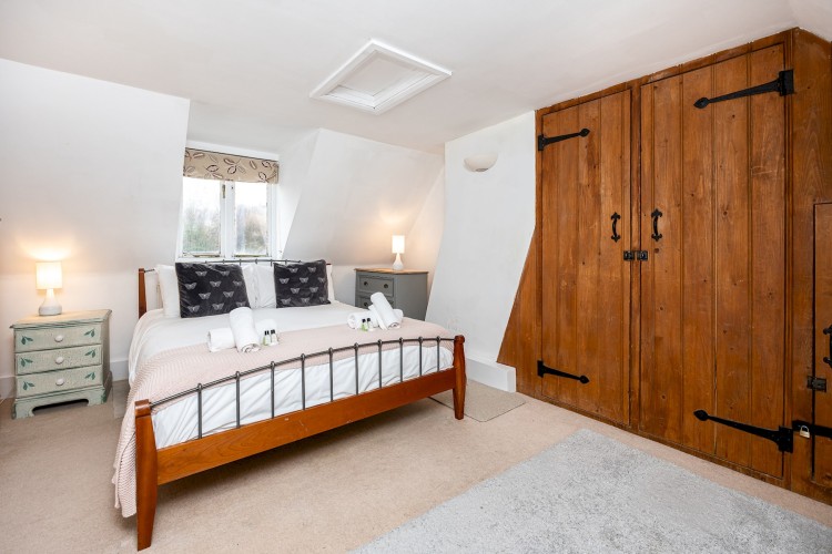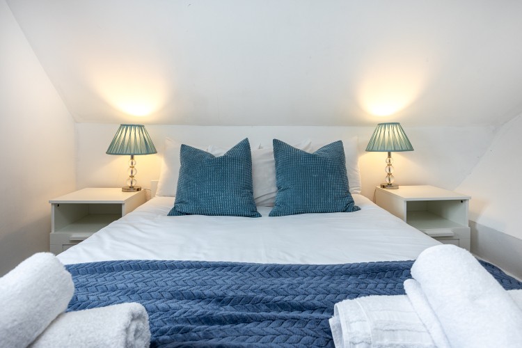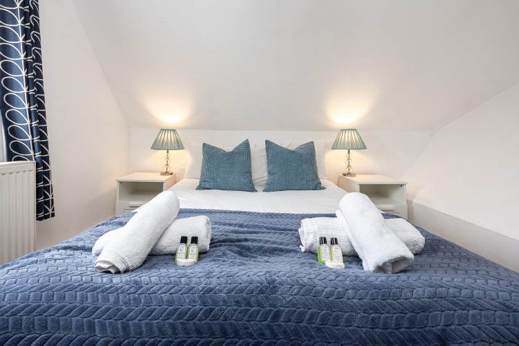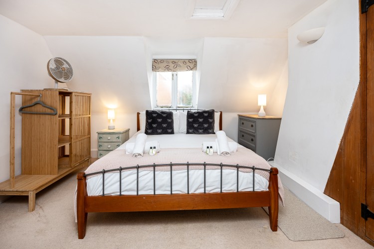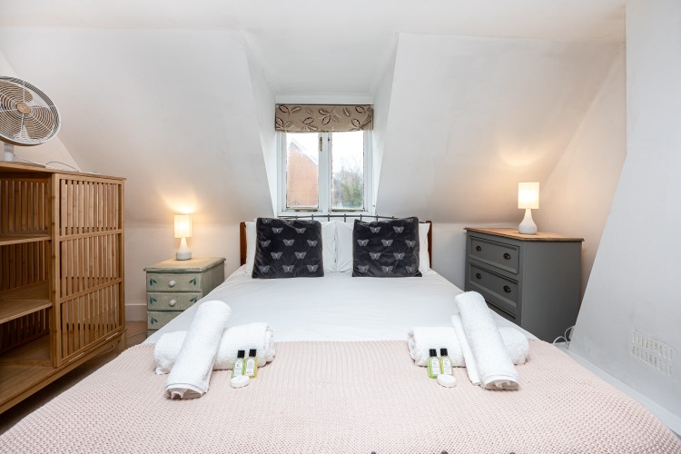 Bedroom 1 (Top Floor): King-size bed, built-in wardrobes, chest of drawers. This is a mezzanine-style room with no door.