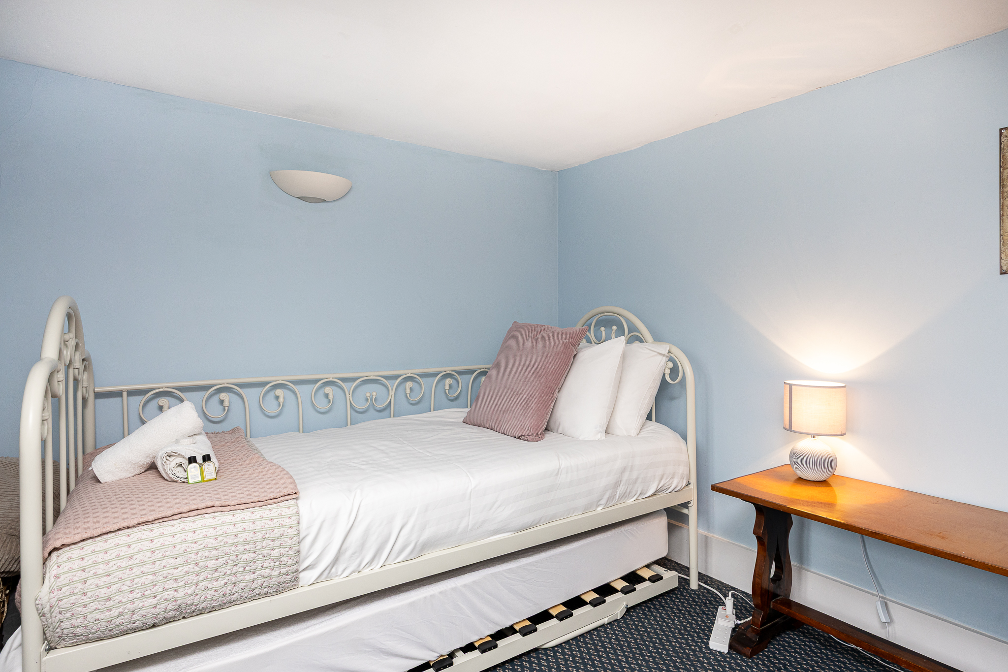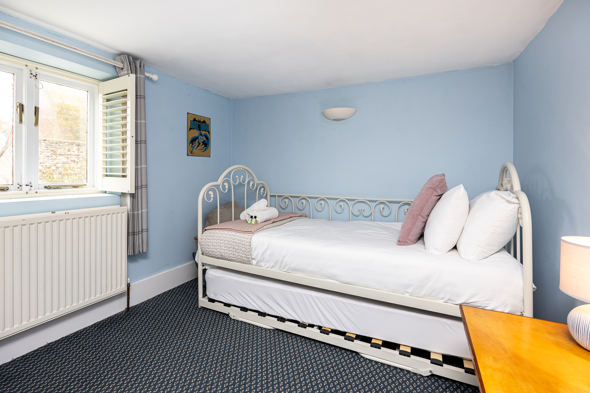 Bedroom 3: Single bed with an additional pull-out truckle bed, fitted cupboard, and tallboy storage.