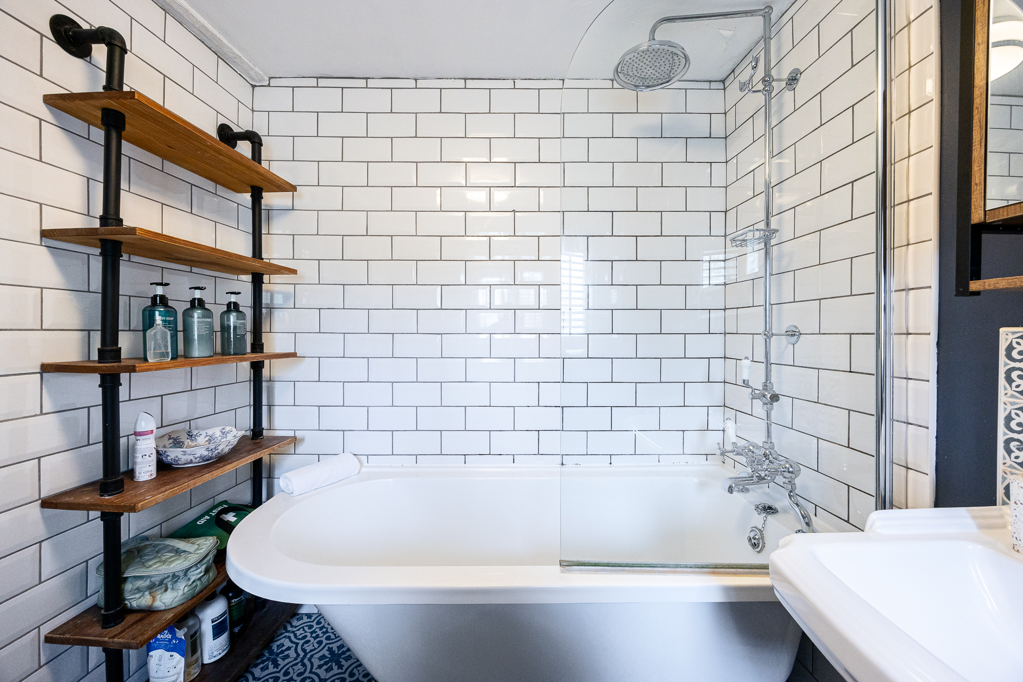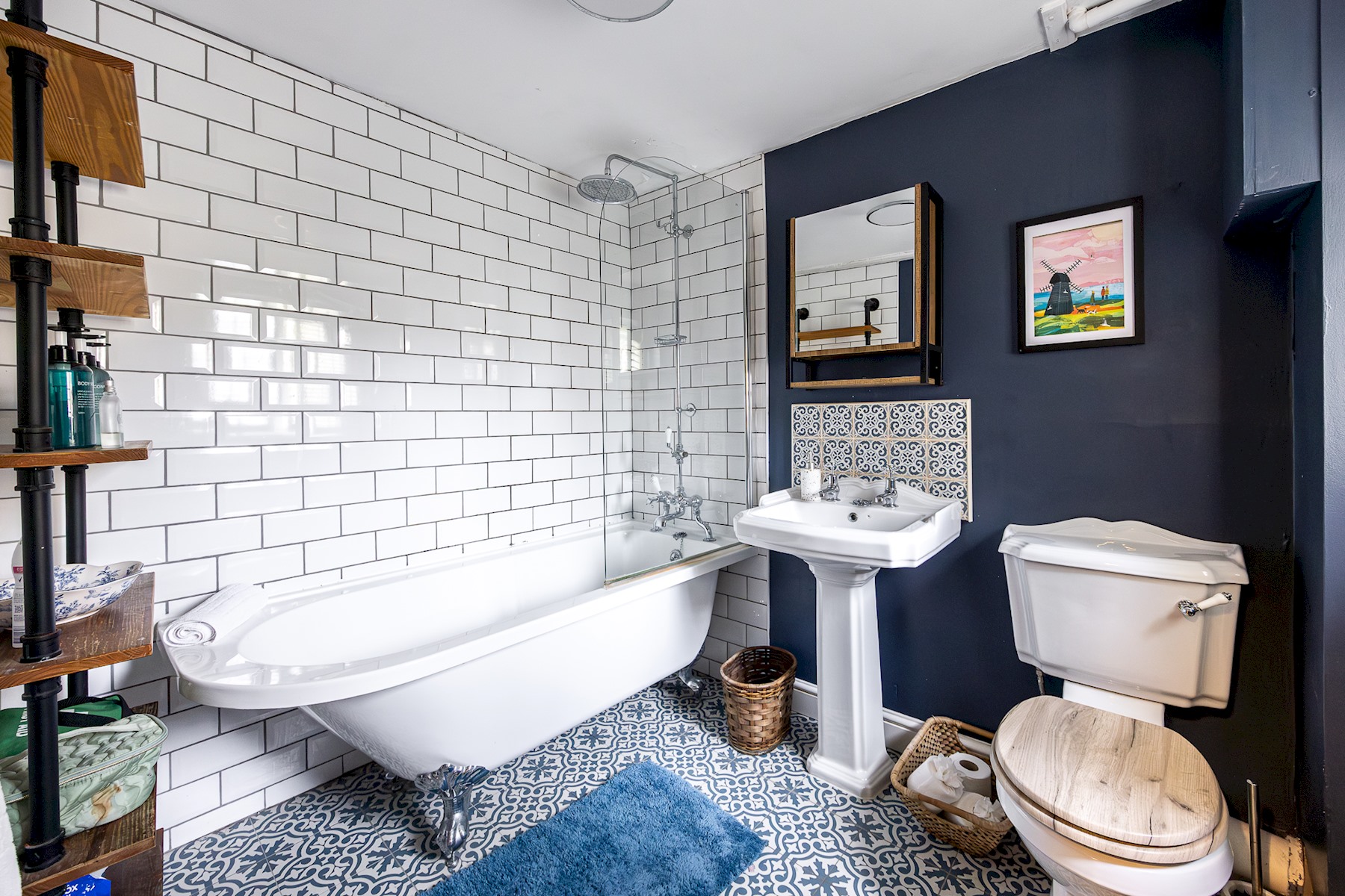 The bathroom features a free-standing bath with overhead rainfall shower, a handheld shower attachment, wash basin, WC, and a heated towel rail.