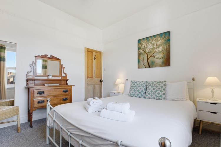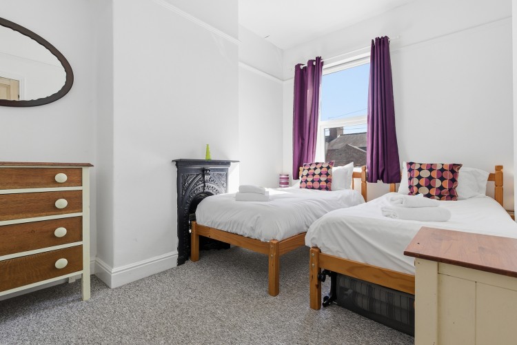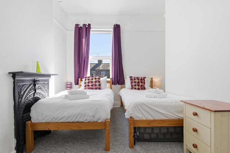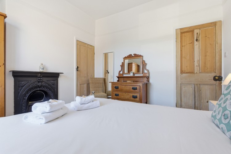 Upstairs, the property offers two characterful bedrooms. The spacious master features a comfortable king-size bed, original cast iron fireplace, dressing table, and plenty of storage with a built-in cupboard and wardrobe. The second bedroom includes twin beds, its own original fireplace, and ample storage—ideal for friends or family. A single pull-out bed can also be provided on request for additional guests (additional charges apply).