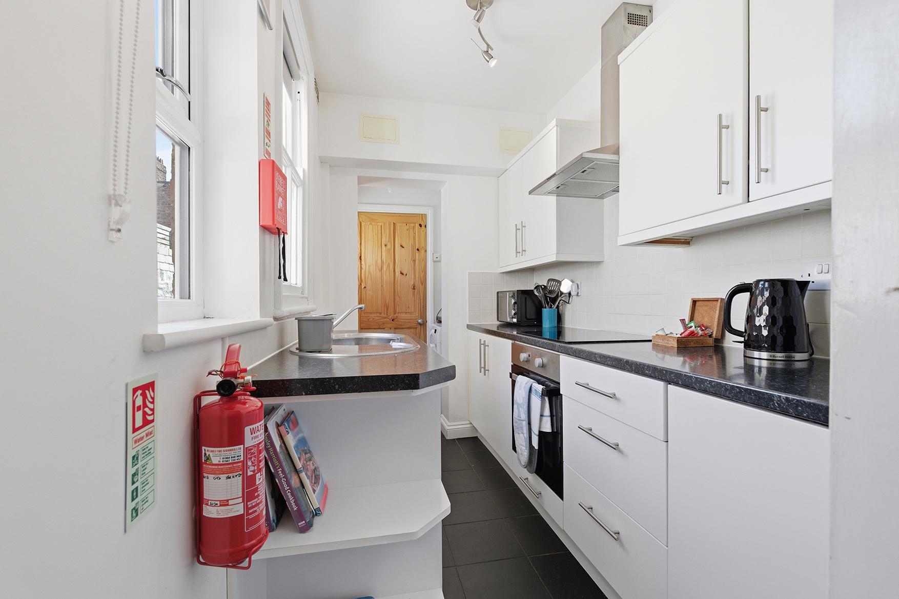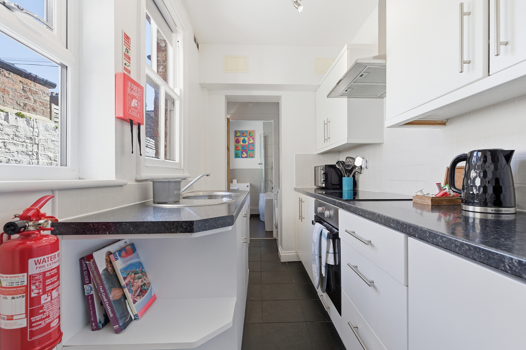 The fully equipped kitchen provides everything you need for your stay, including an electric oven, gas hob, fridge with freezer compartment, microwave, and washing machine.