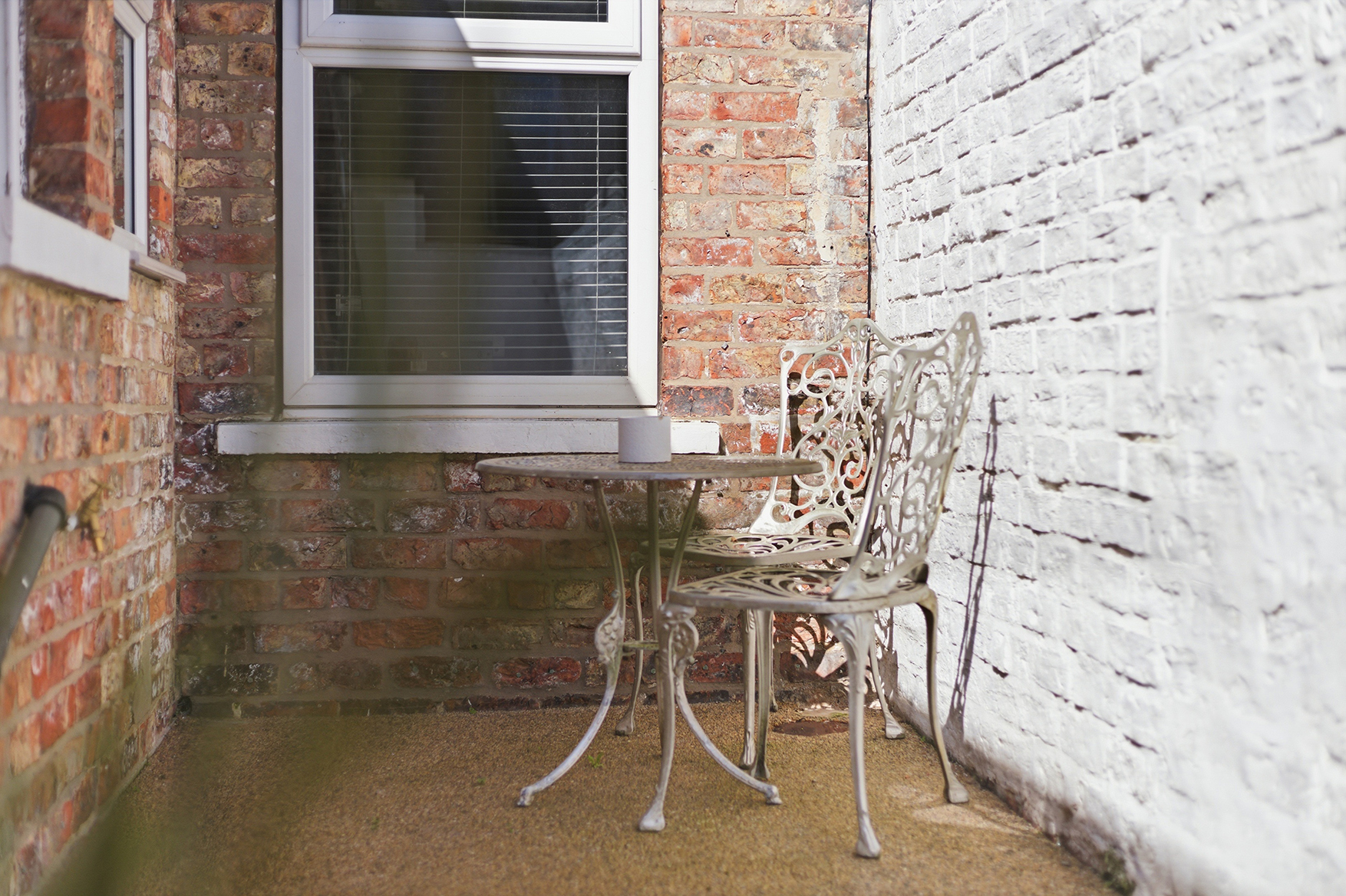 To the rear, a secure and enclosed courtyard provides outdoor seating for four—an ideal spot to enjoy a morning coffee or relax with a drink in the evening.