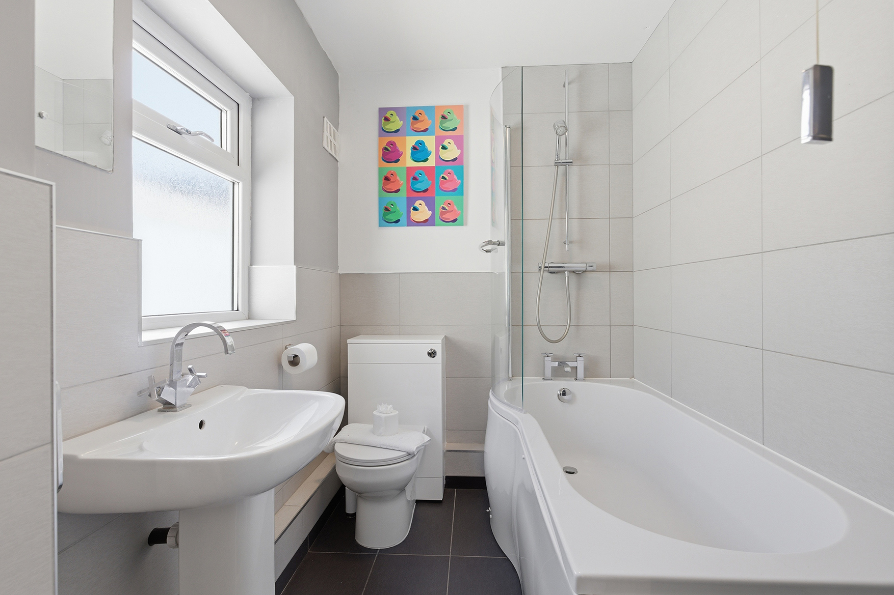 Downstairs, the newly refurbished luxury bathroom offers a stylish and relaxing space, complete with a P-shaped bath and overhead shower, WC, sink, and underfloor heating for added comfort.