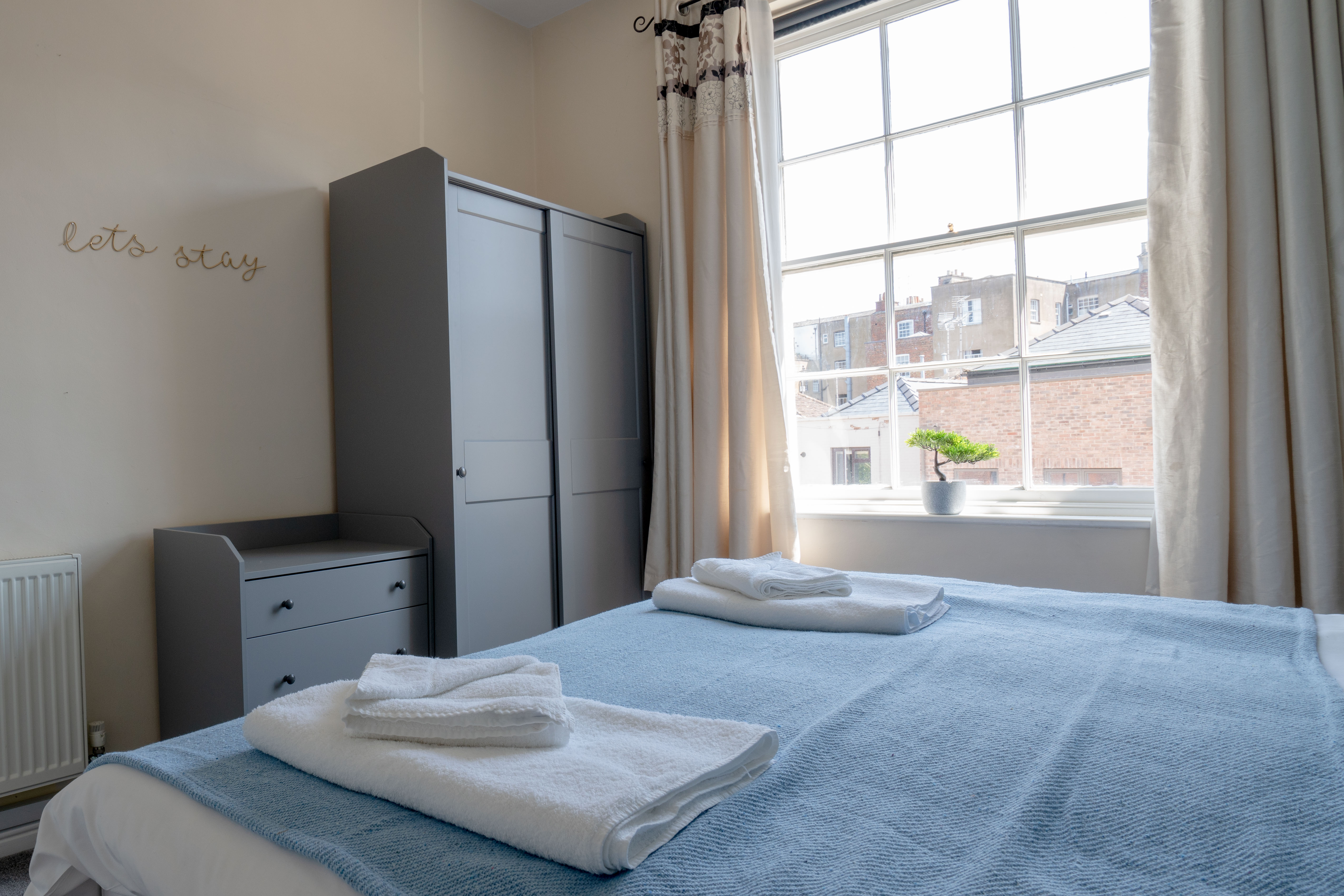 Both bedrooms are at the back of the building and come with hotel-quality, crisp cotton sheets, fluffy towels for each guest, and complimentary toiletries.