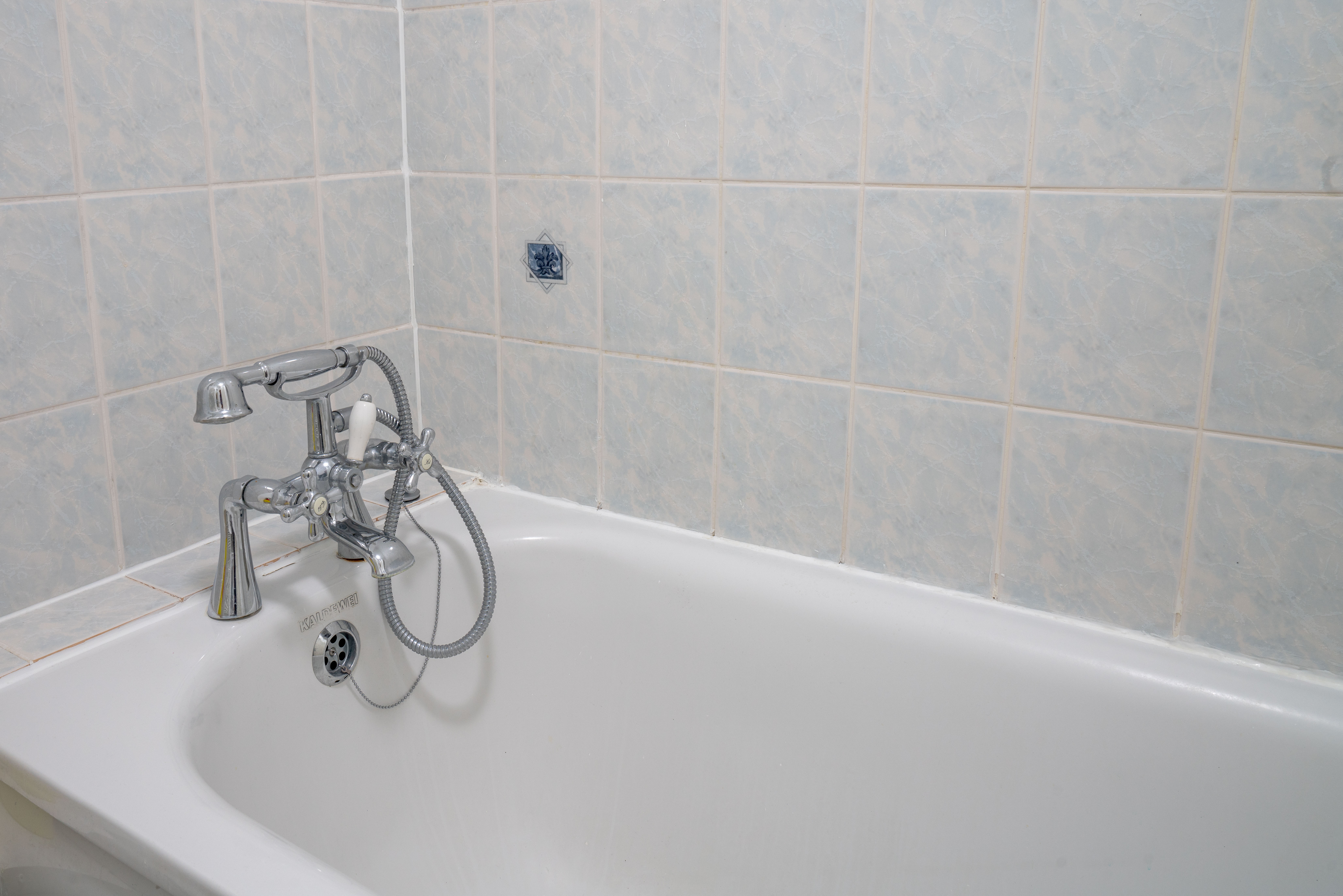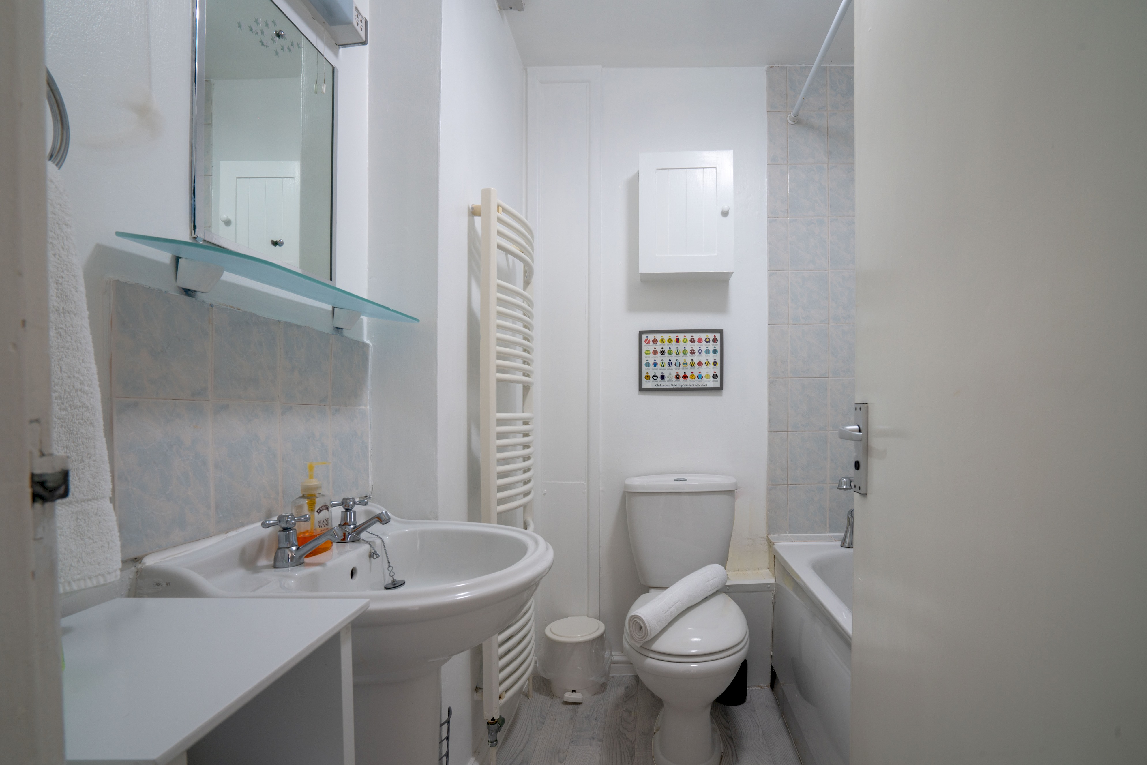 The bathroom has a full-sized overhead shower and bath, complete with regency mixer taps.