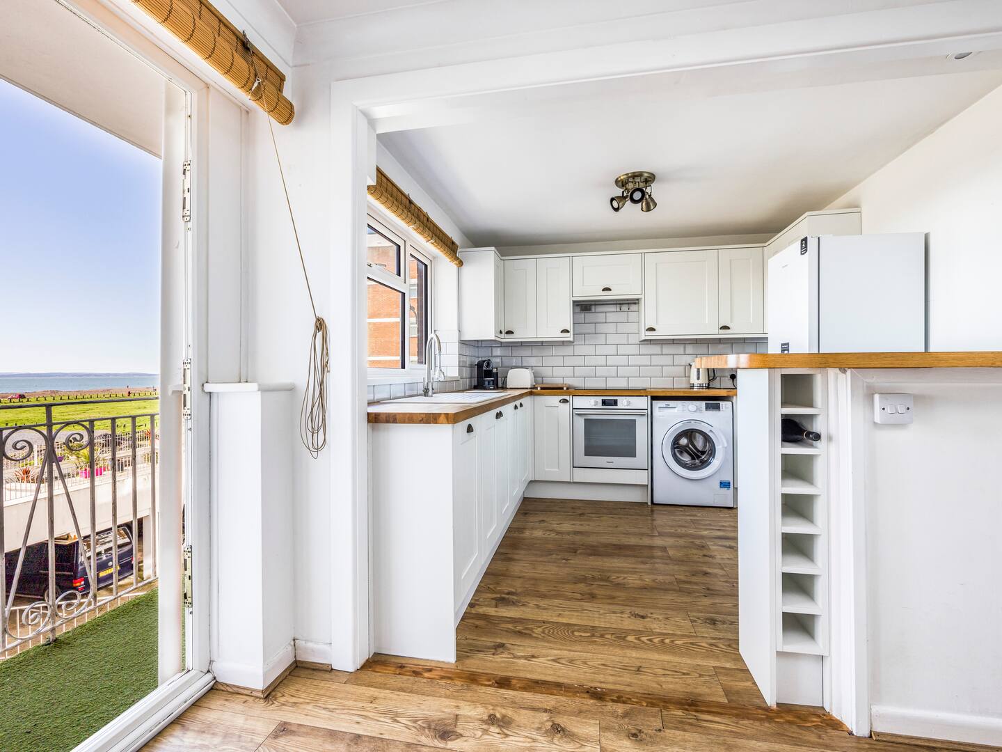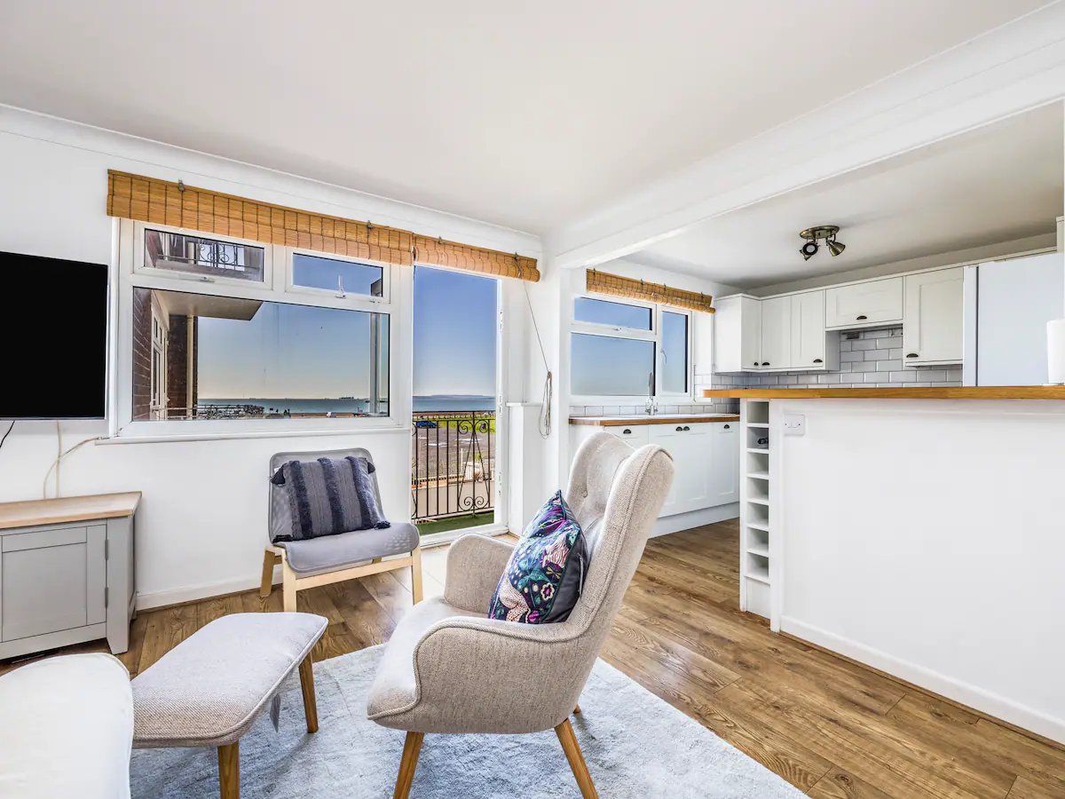 With sea views, you will enjoy cooking in the well-equipped kitchen, and with the addition of the breakfast bar, it creates a lovely communal cooking area. The comfortable sitting area with Smart TV (you will need to use your own logins to access the Apps) is a great place to unwind after a day at the beach, or exploring the rest of Hayling Island, Chichester Harbour and historic Portsmouth. You can access the balcony from the living area, and enjoy a morning coffee or a sundowner whilst taking in the beach and the sea views.