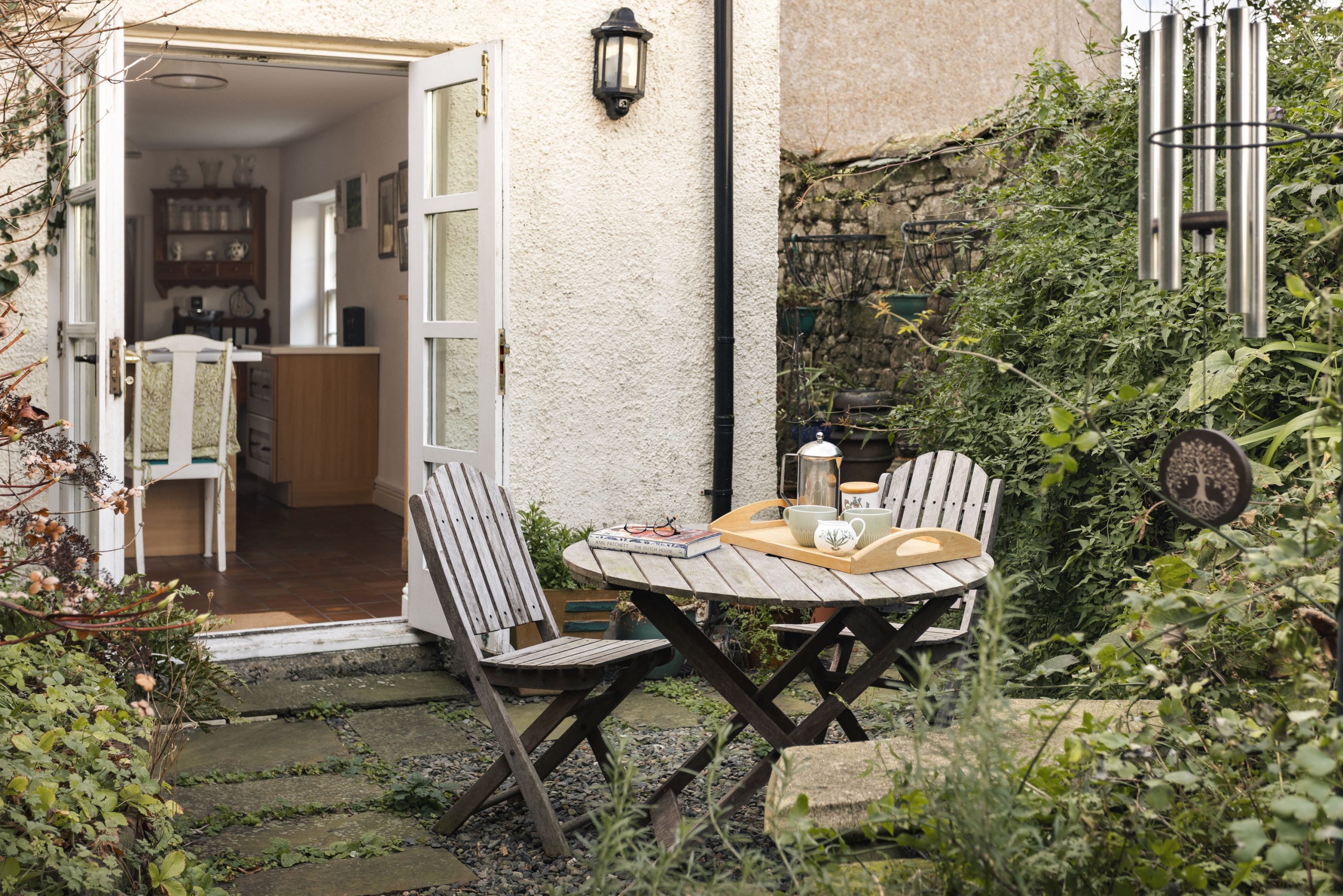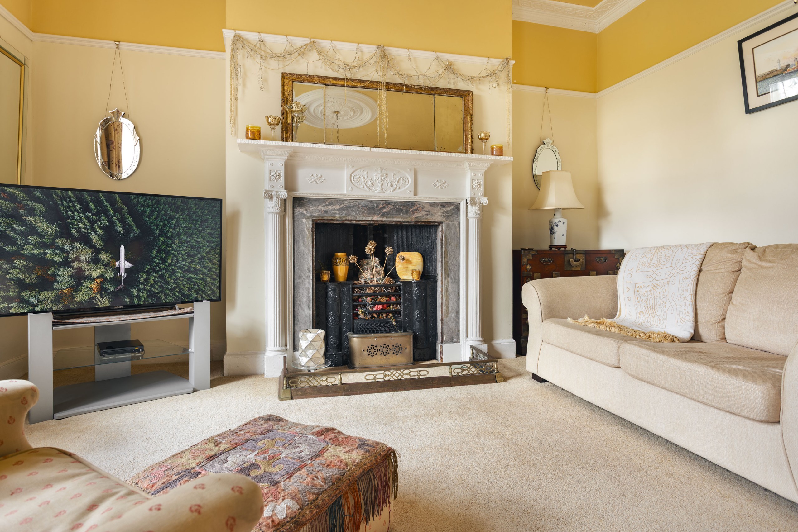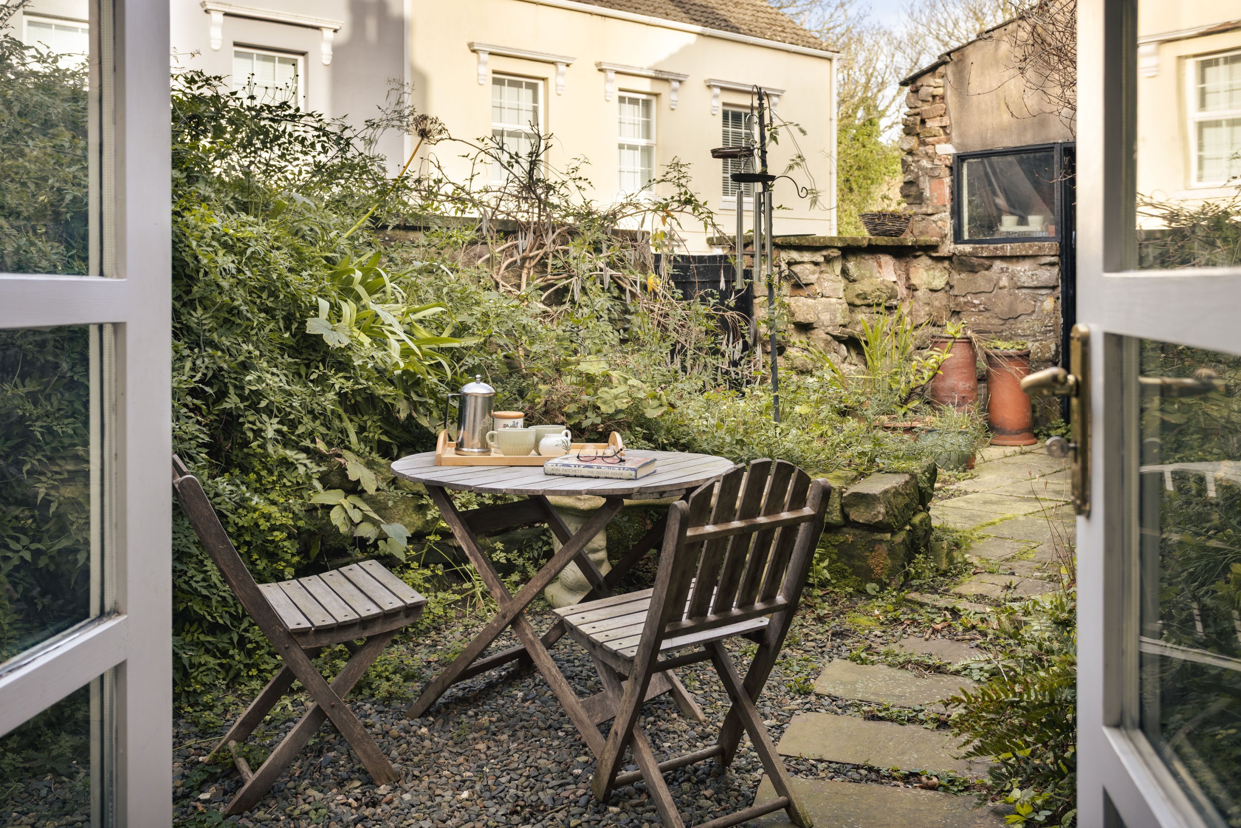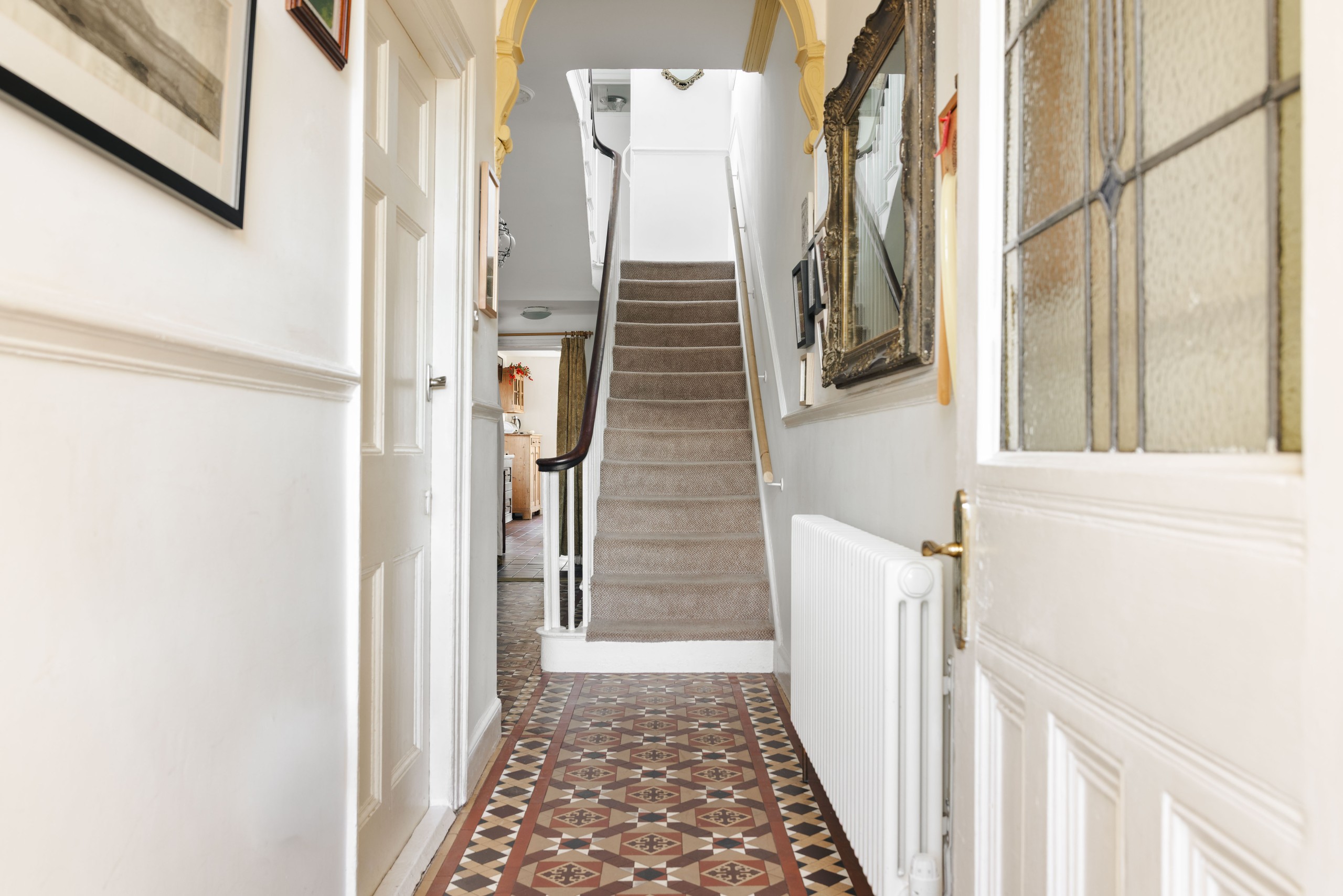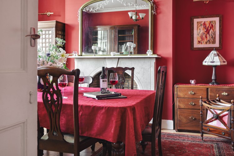 As you enter the entrance hall with it’s ornate tile work, the ruby dining and games room with extendable mahogony dining table is on your left. Ahead of you the hallway opens up into a large open plan kitchen with french doors onto the courtyard garden. You’ll find the light golden living room in the traditional ‘parlour’ location upstairs.