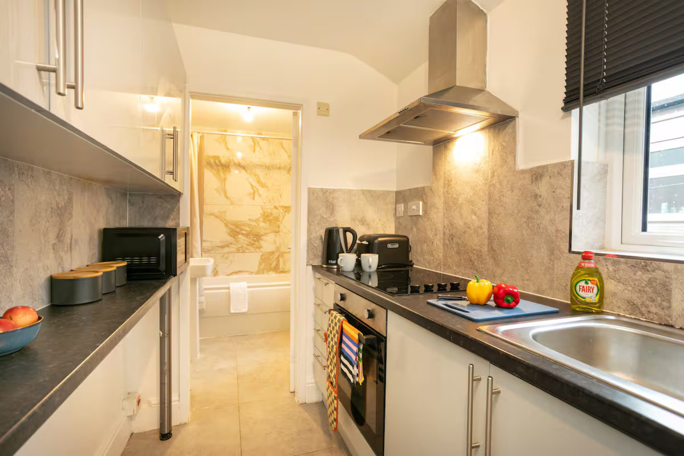 The living room provides a relaxed space to unwind together after a busy day, while the separate dining area features an expandable table seating four to six guests, ideal for family meals, homework time, or board games. The fully equipped kitchen makes everyday cooking simple and stress-free, giving families the flexibility to eat in when needed. There is one full bathroom with a bath and overhead shower, ideal for families with children.