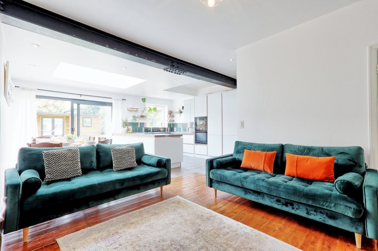 Large open-plan living area with a modern kitchen, dining space, and comfortable lounge — great for relaxing after work or socialising.