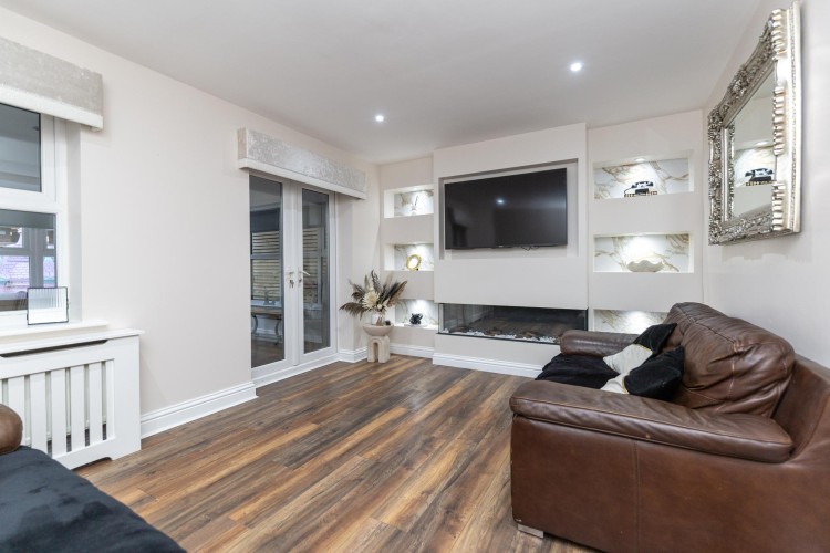 The living room is a cosy place to unwind after a busy day, with a large comfortable sofa, wall mounted TV and feature fireplace. The built-in shelving and lighting give the room a modern feel while still being comfortable and homely.