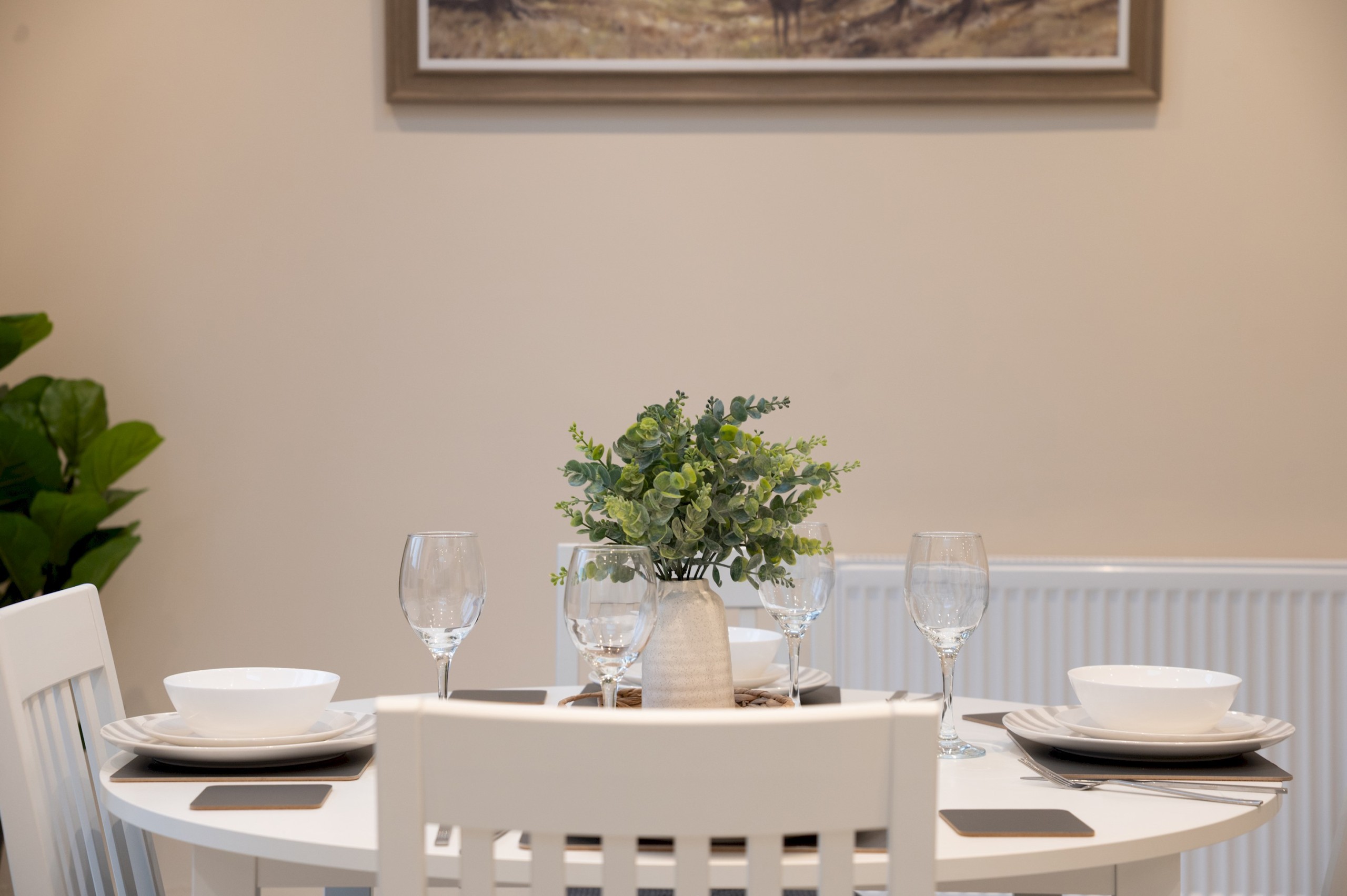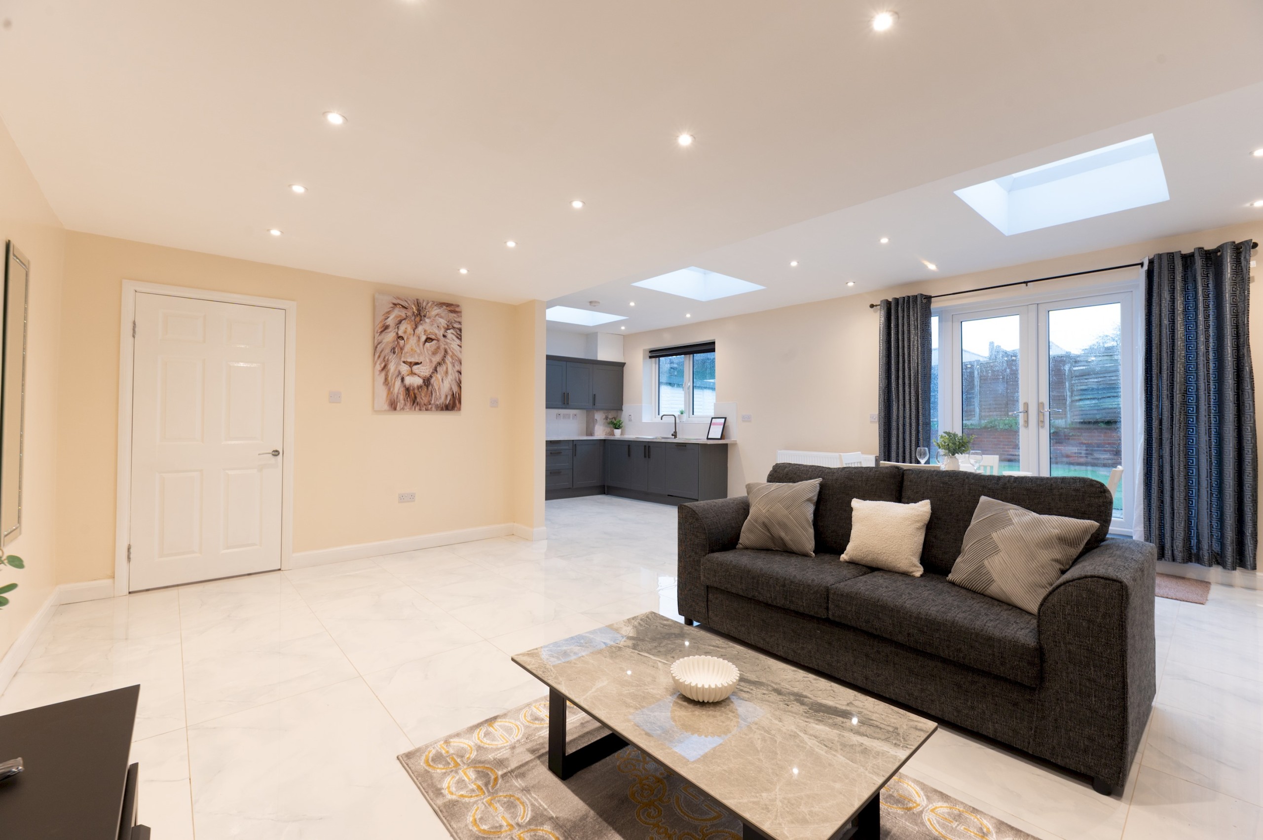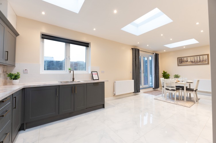 Open plan kitchen and dining area – with a dining table and chairs