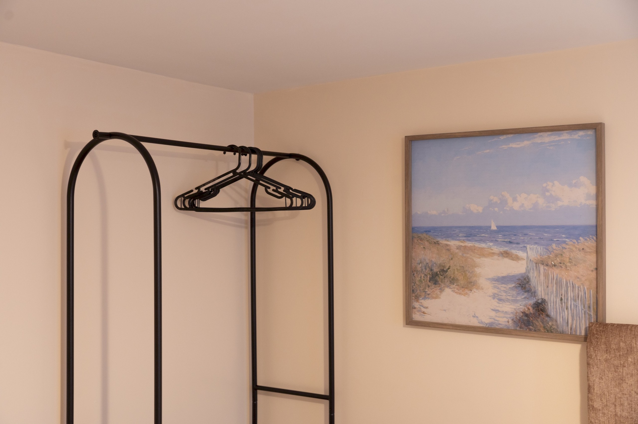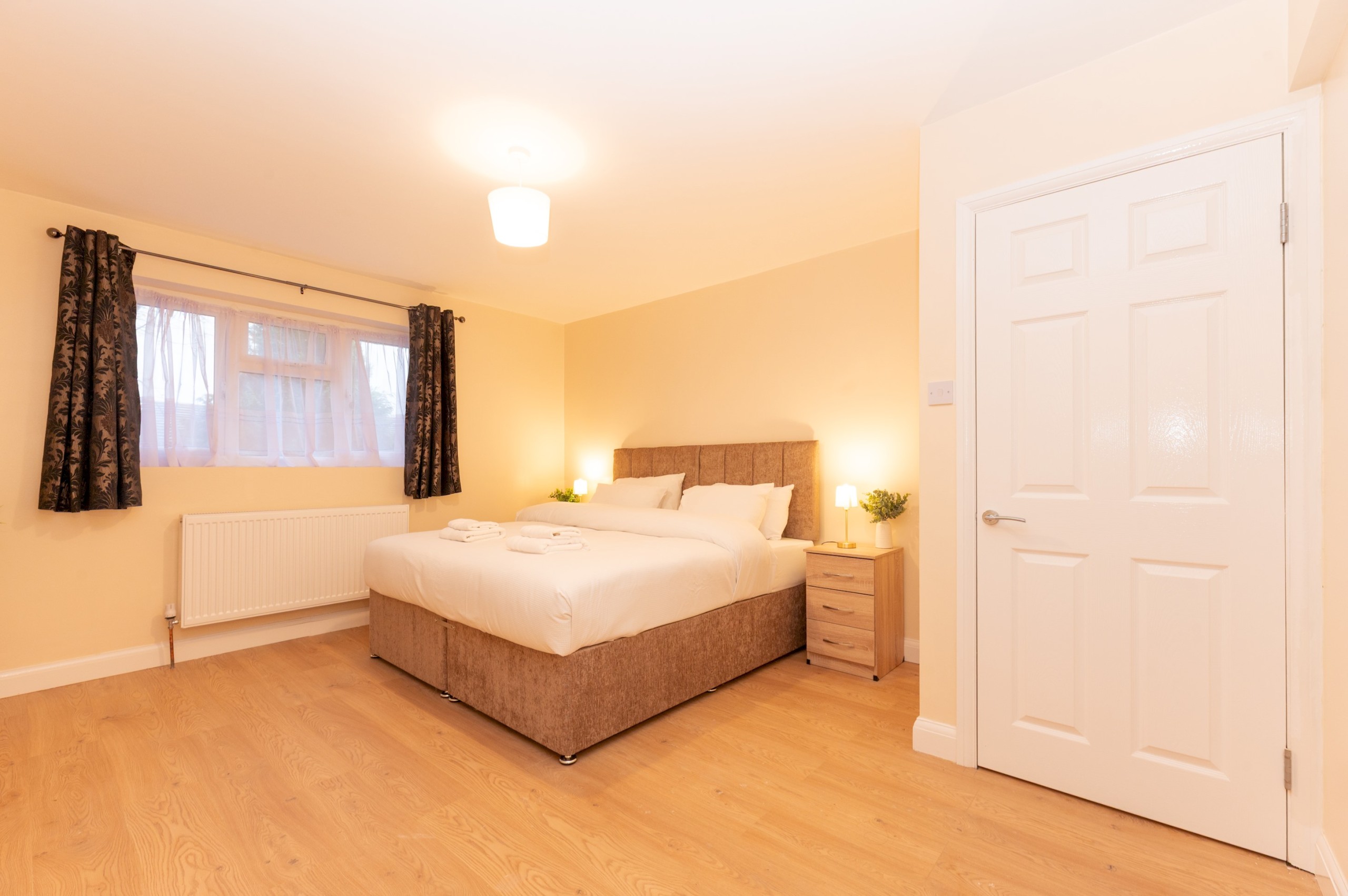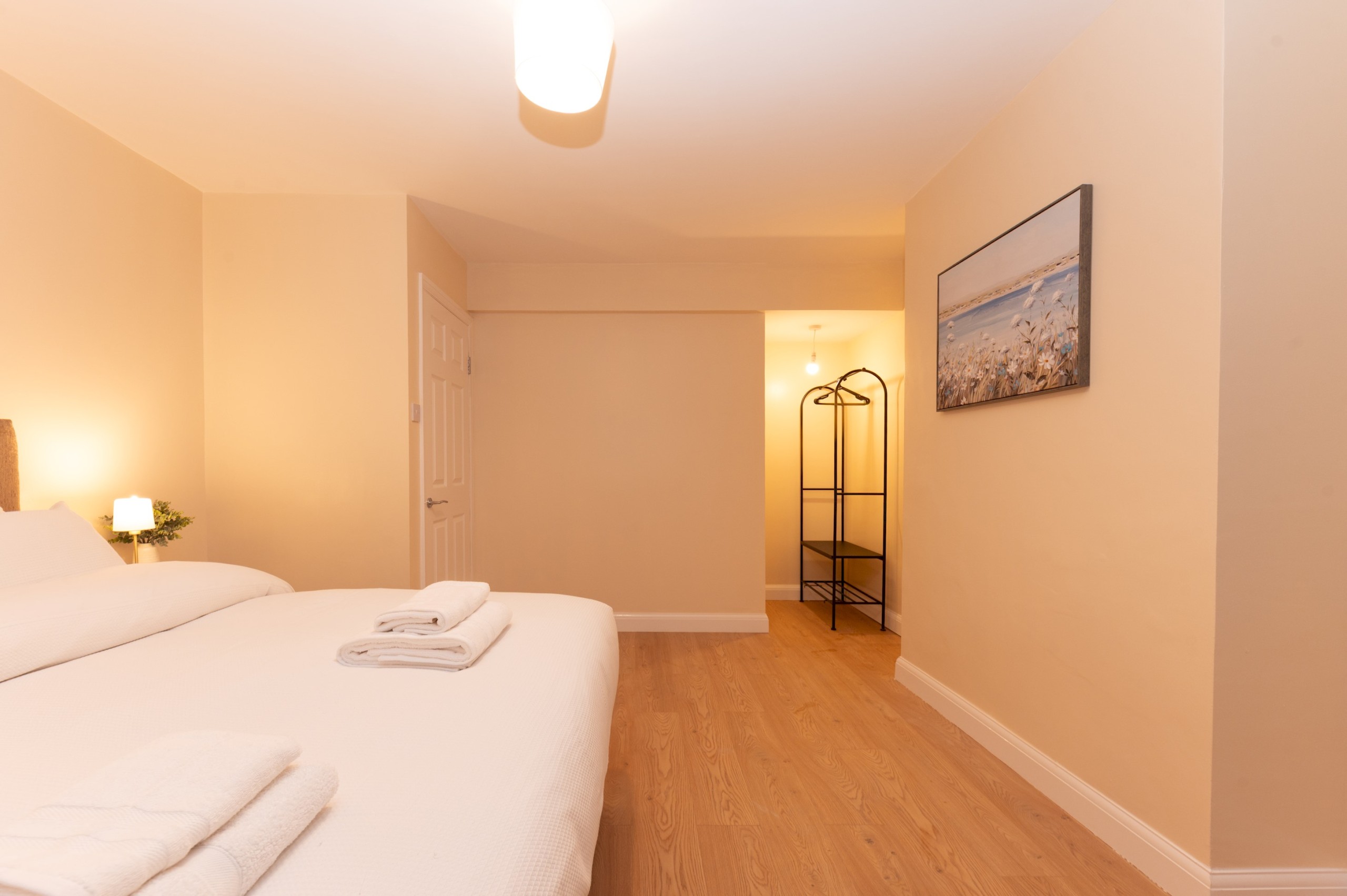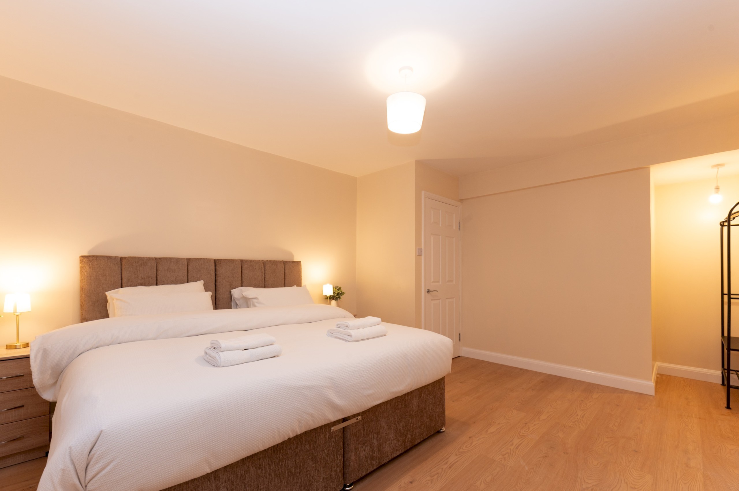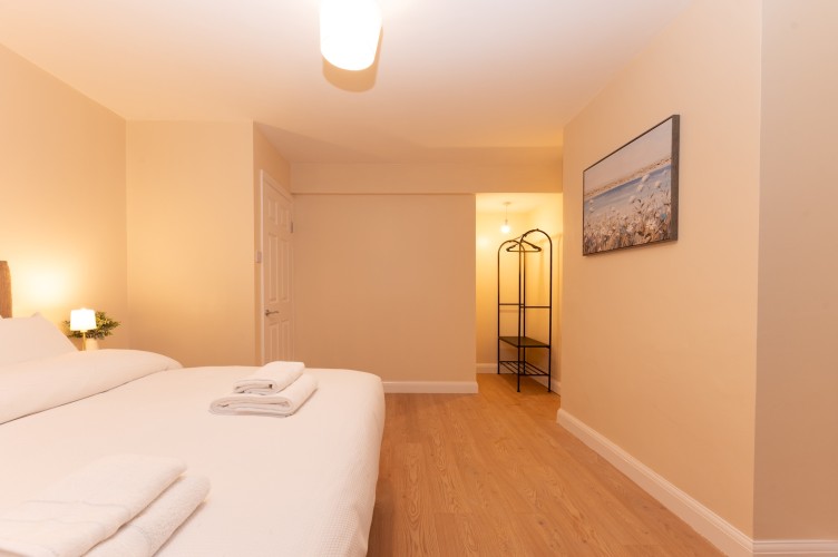 Master bedroom located on the ground floor – has a super king bed, open rail hanging, and bedside tables.