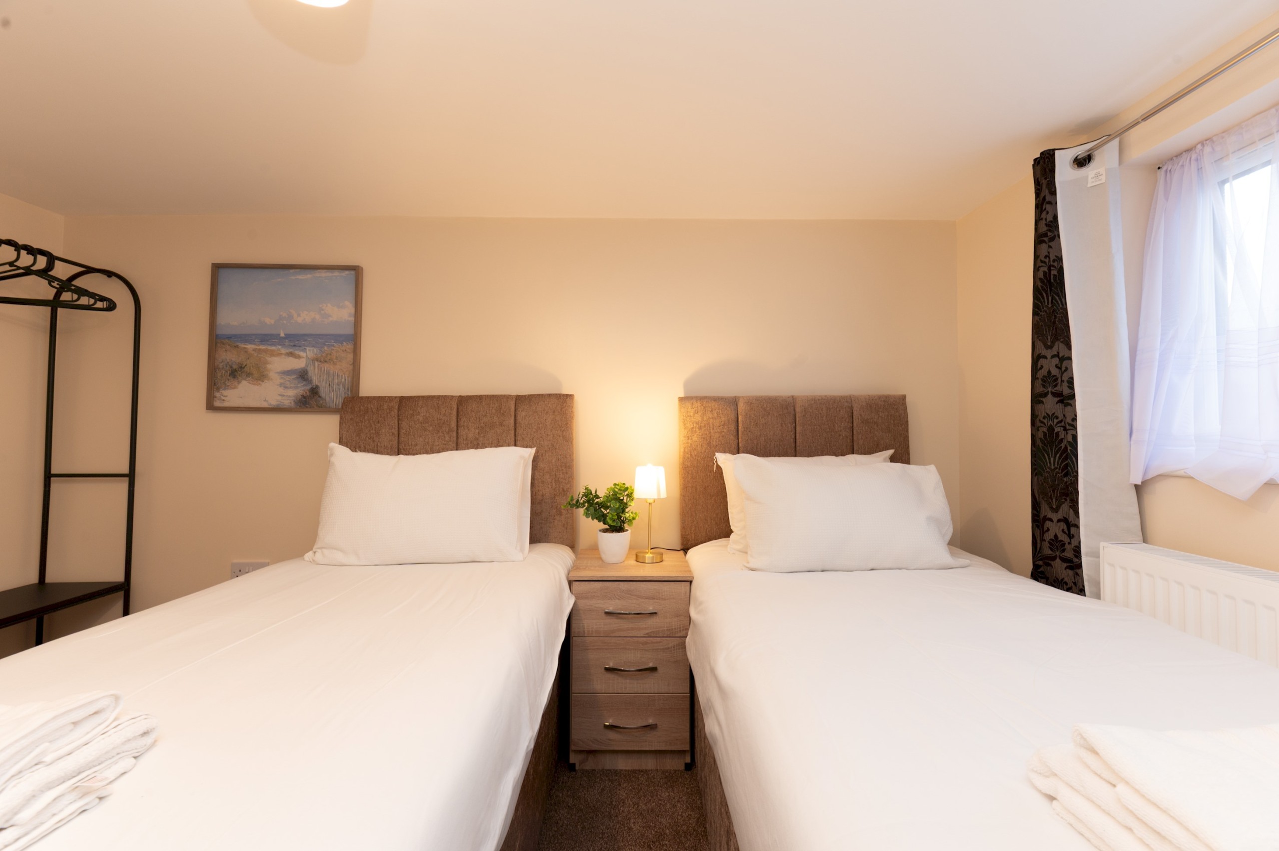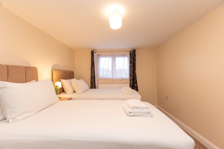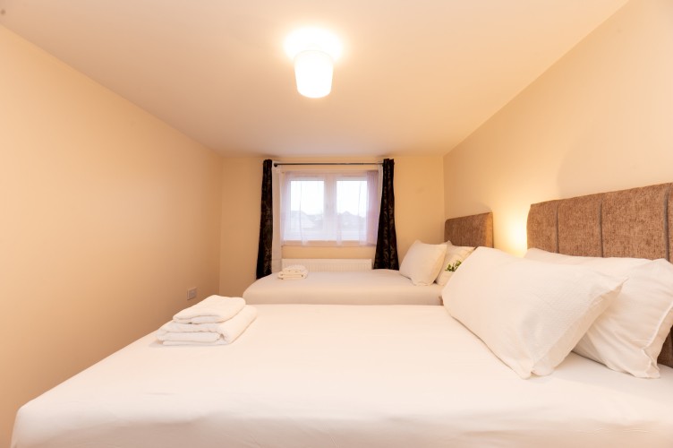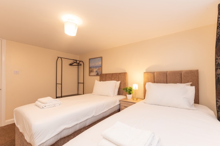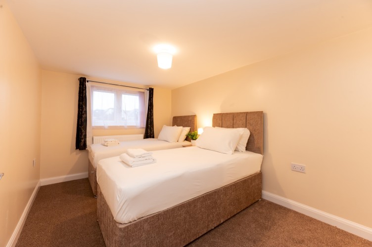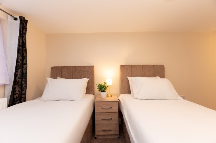 Bedroom 3 and 4 has a two single beds, bedside tables and lamps and a clothes storage.
