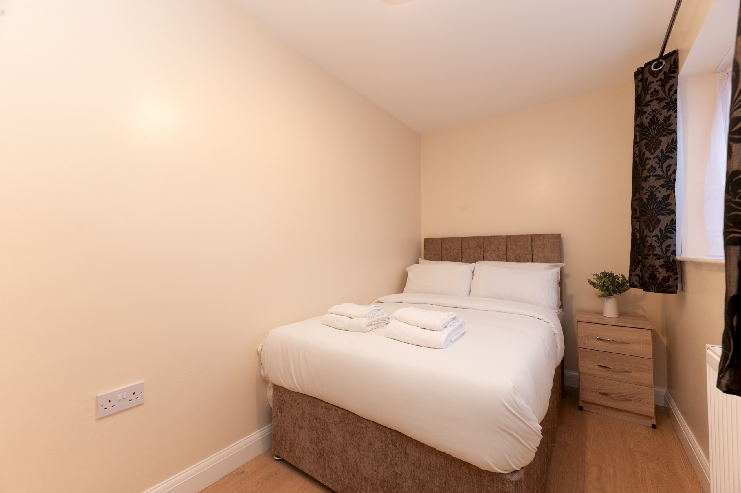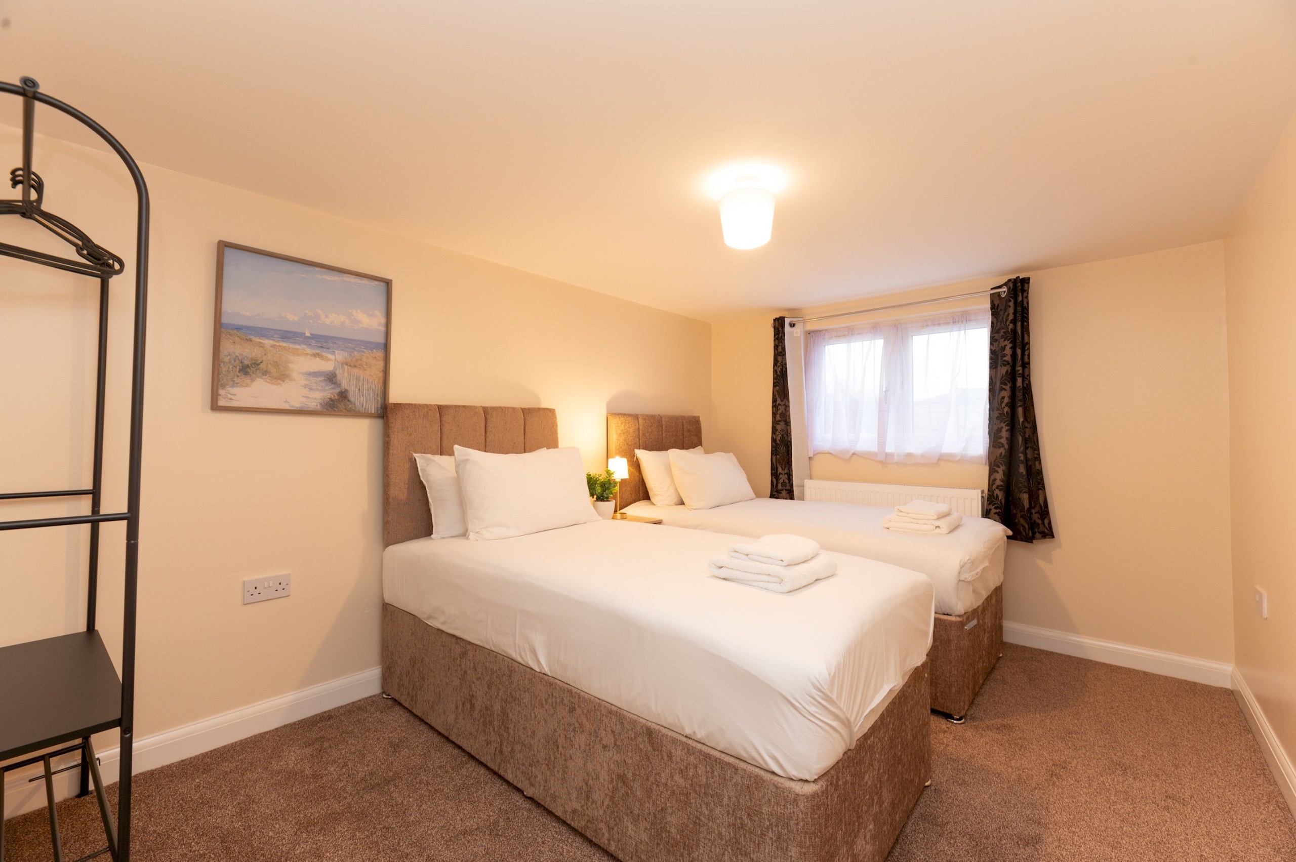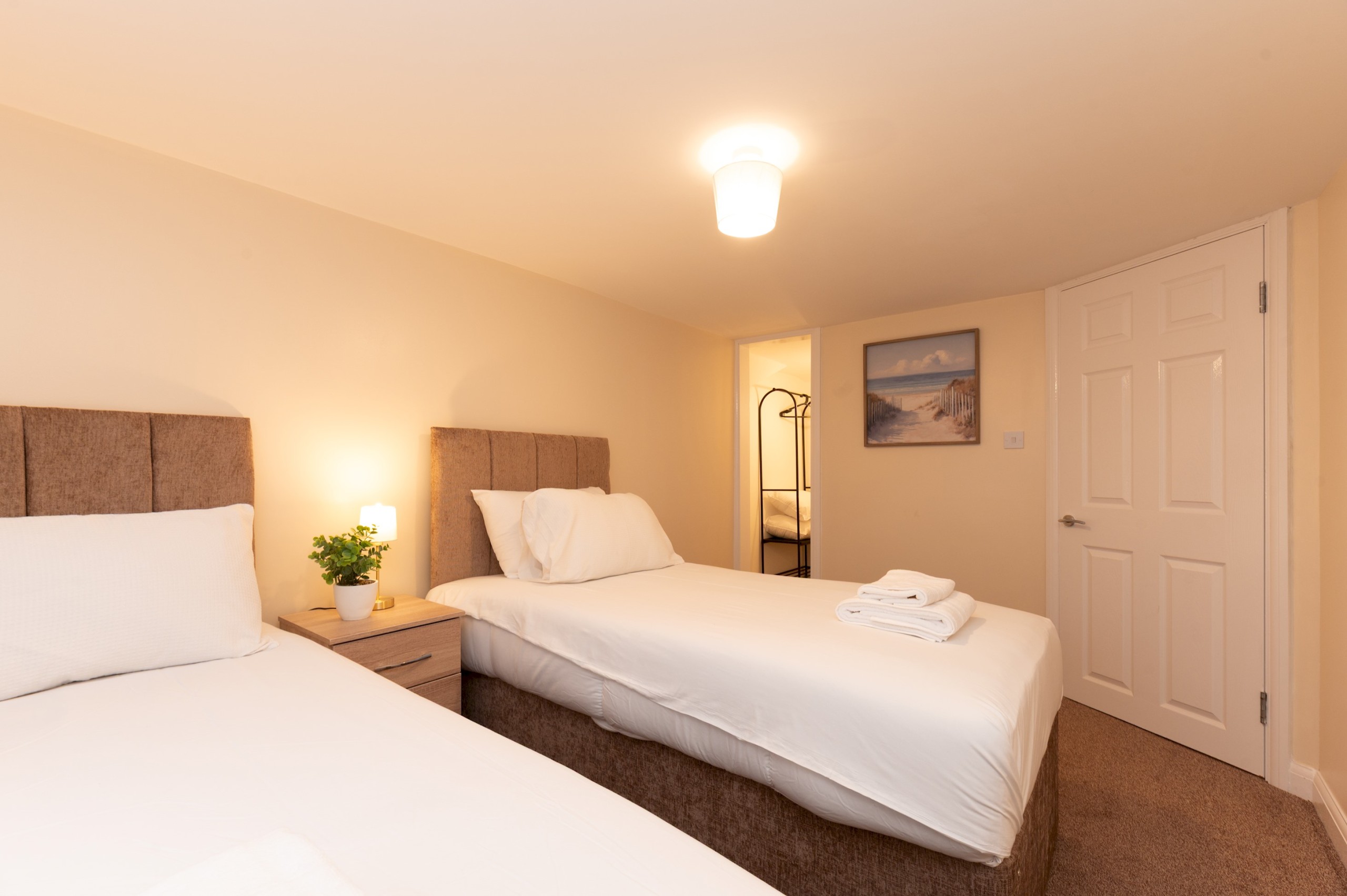 Bedroom 3 and 4 has a two single beds, bedside tables and lamps and a clothes storage.