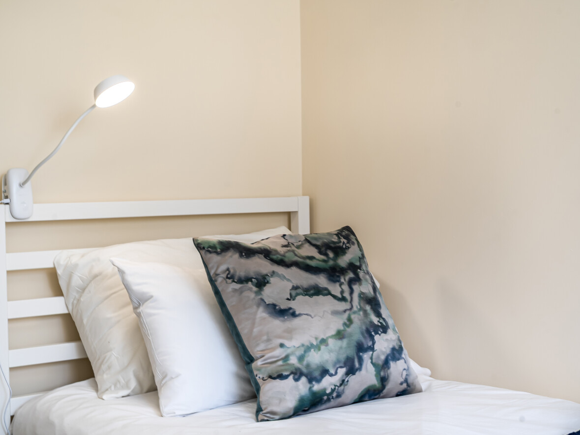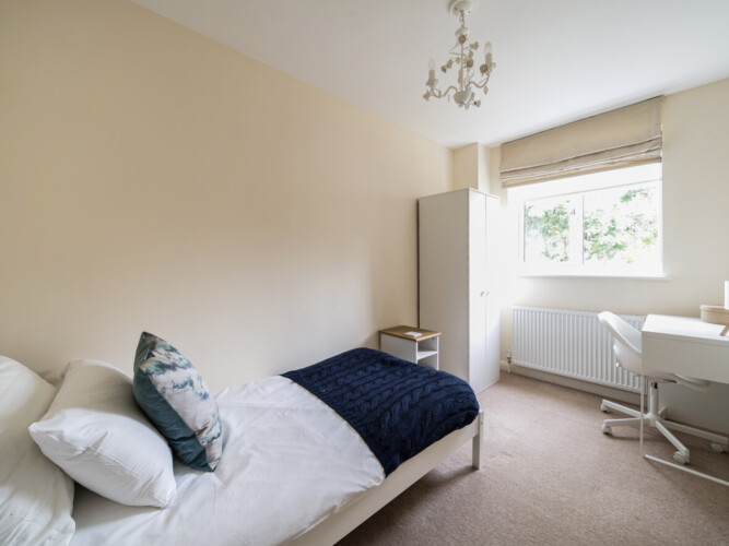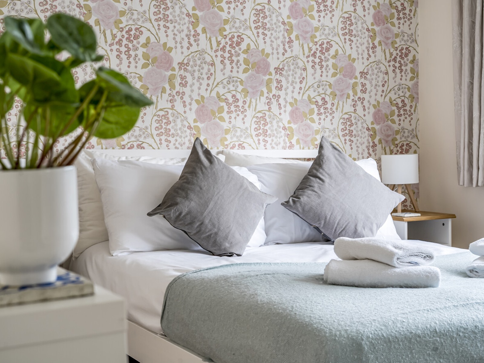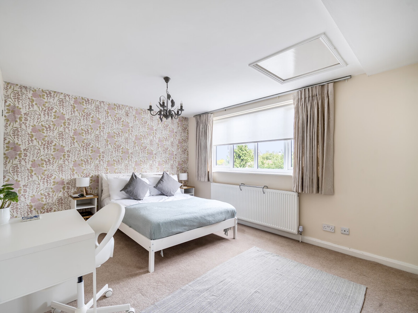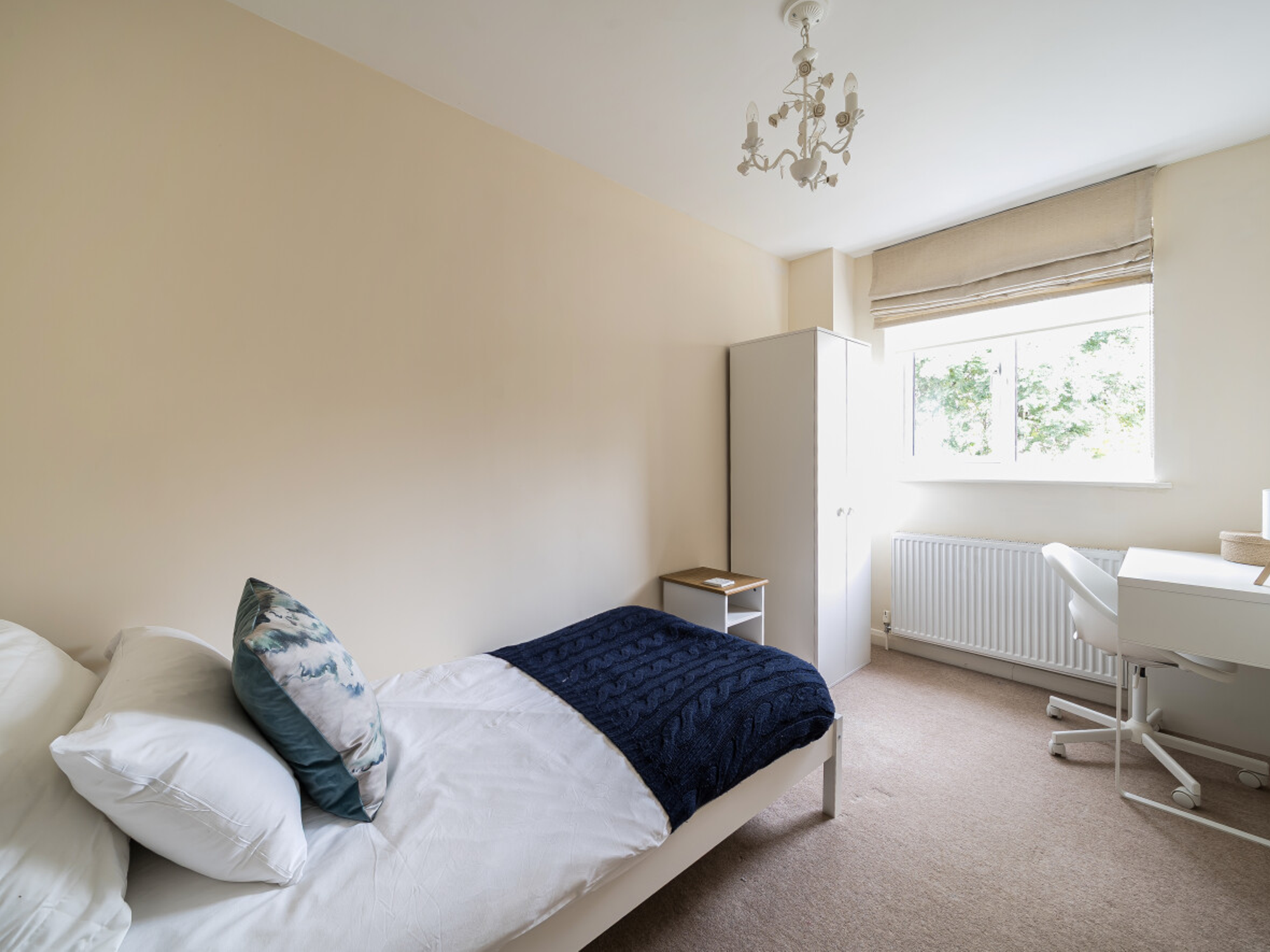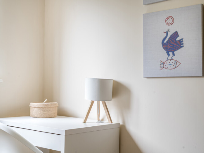 A calm and spacious master bedroom with a comfortable double bed, stylish decor, and plenty of natural light. With a handy desk space, it’s ideal for couples, parents, or guests who may need to work during their stay.
