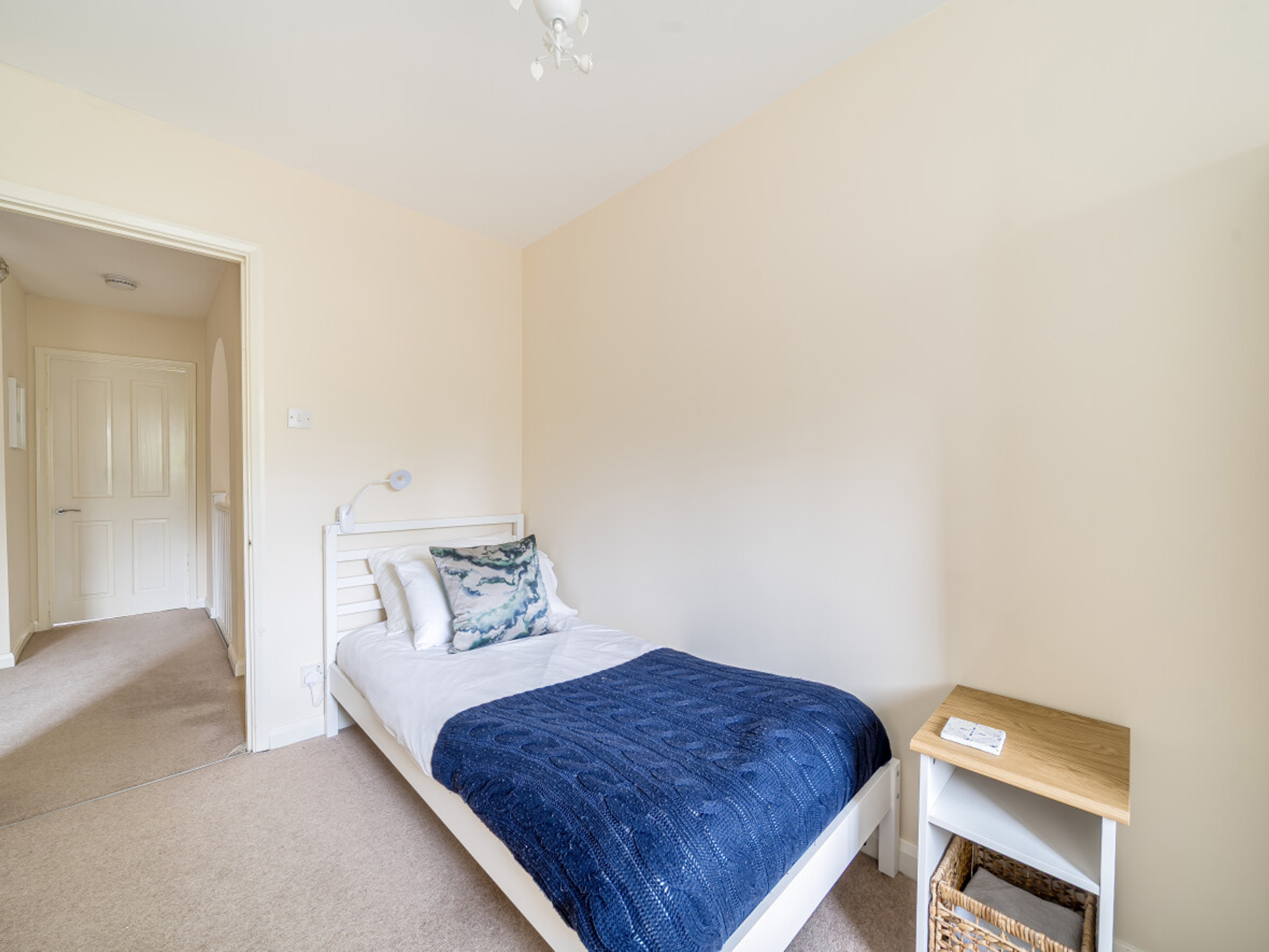 A bright single bedroom with fresh linens, a desk, and peaceful views. Great for children, solo guests, or anyone needing a quiet retreat to rest or work.