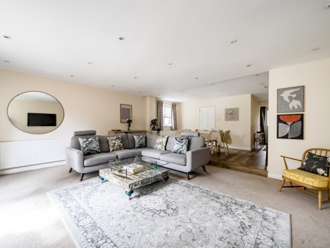 A spacious and light-filled living room designed for relaxation. Gather on the comfy sofas to watch a movie, share stories, or simply unwind after a day exploring. Perfect for families and groups. We have a selection of board games and books for the children.