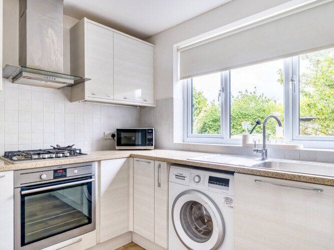 Bright and modern kitchen with everything you need to cook at home—oven, hob, dishwasher, washing machine, and all the essentials. A welcoming space to enjoy morning coffee or prepare family meals together.