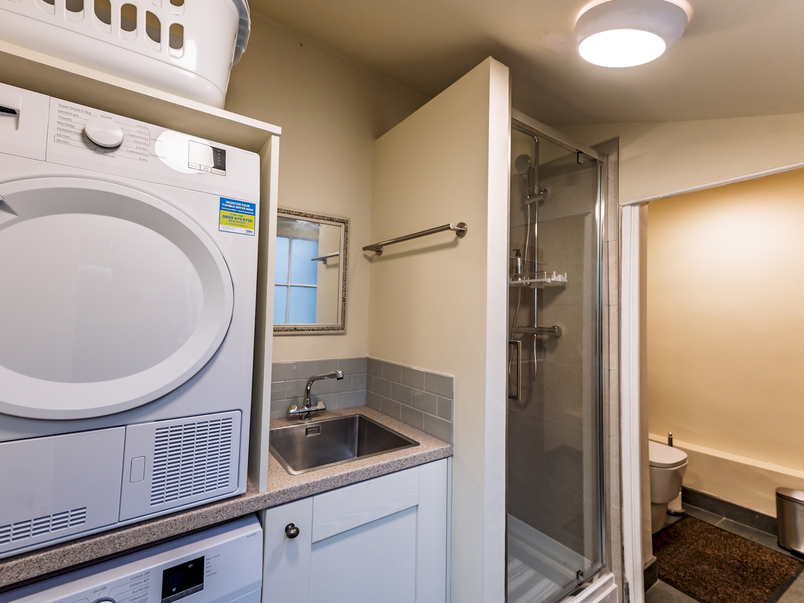 Featuring a shower cubicle, WC, sink, washing machine, and separate dryer – ideal for cleaning off muddy gear after a day of exploring the hills.
