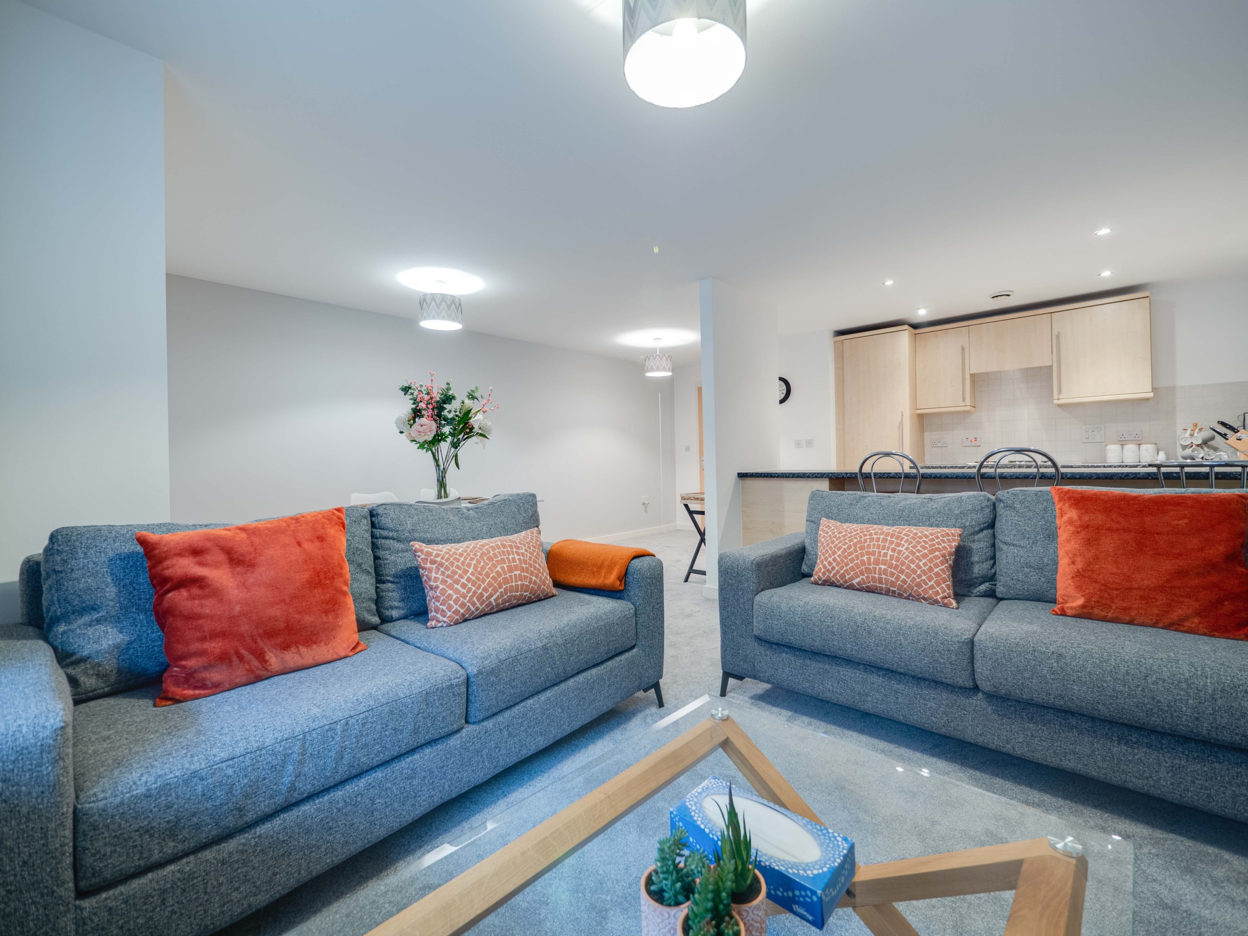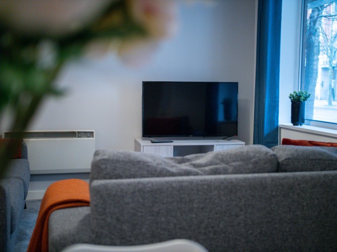 Comfortable living room featuring two large comfortable sofas, flat screen TV and Wi-Fi