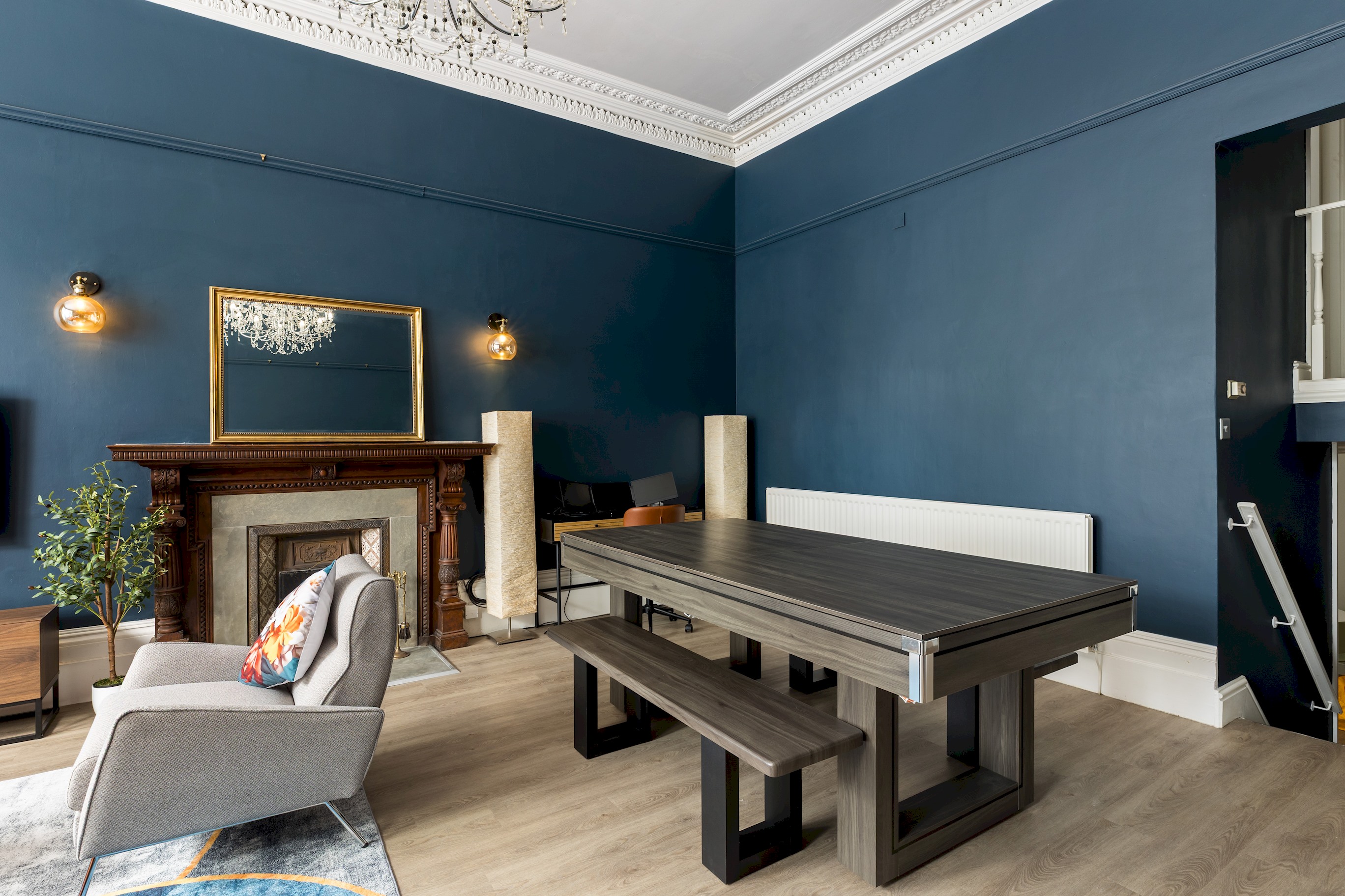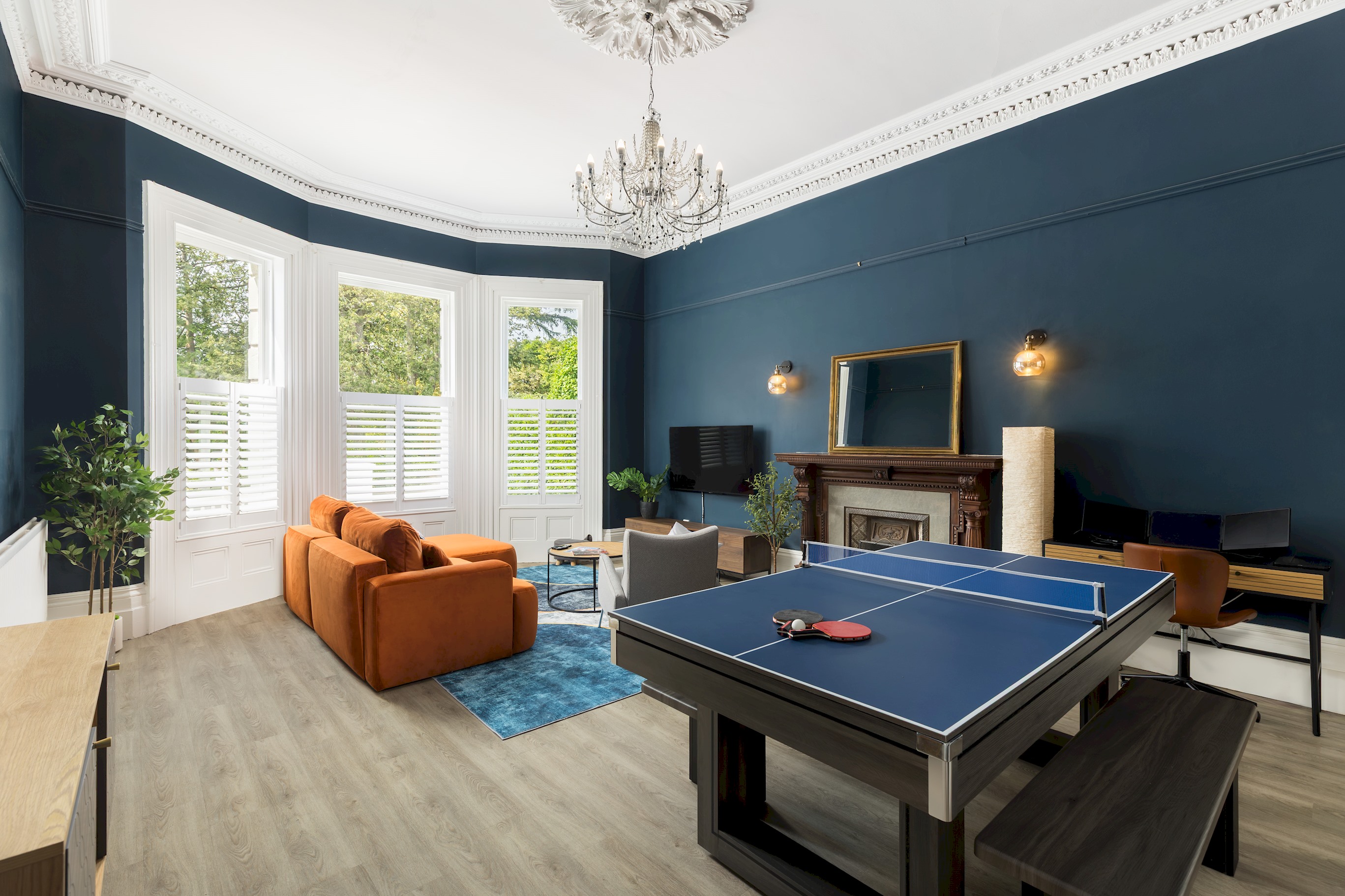 🛋 Elegant Living Space – Bathed in natural light with original architectural details, a comfortable sofa, and smart TV – perfect for relaxing after a day exploring. The dining table also flips over as a pool table, or a ping pong table!