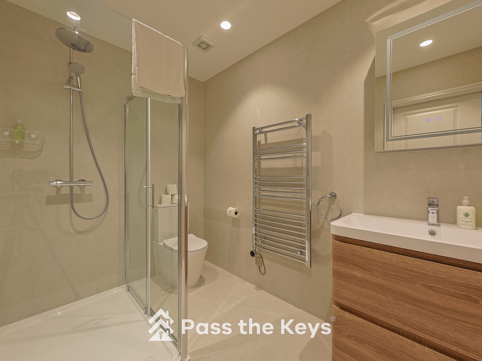 🛁 Bathroom 1, en-suite, floor to ceiling tiled, walk in shower, heated towel rail, storage, cabinet with mirror and heated demister.