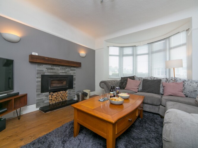 As you step into the house, you’ll find a cozy sitting room to the left, featuring a cozy corner sofa and a warming log fire. Perfect for relaxing after a long day exploring the coastal trails.